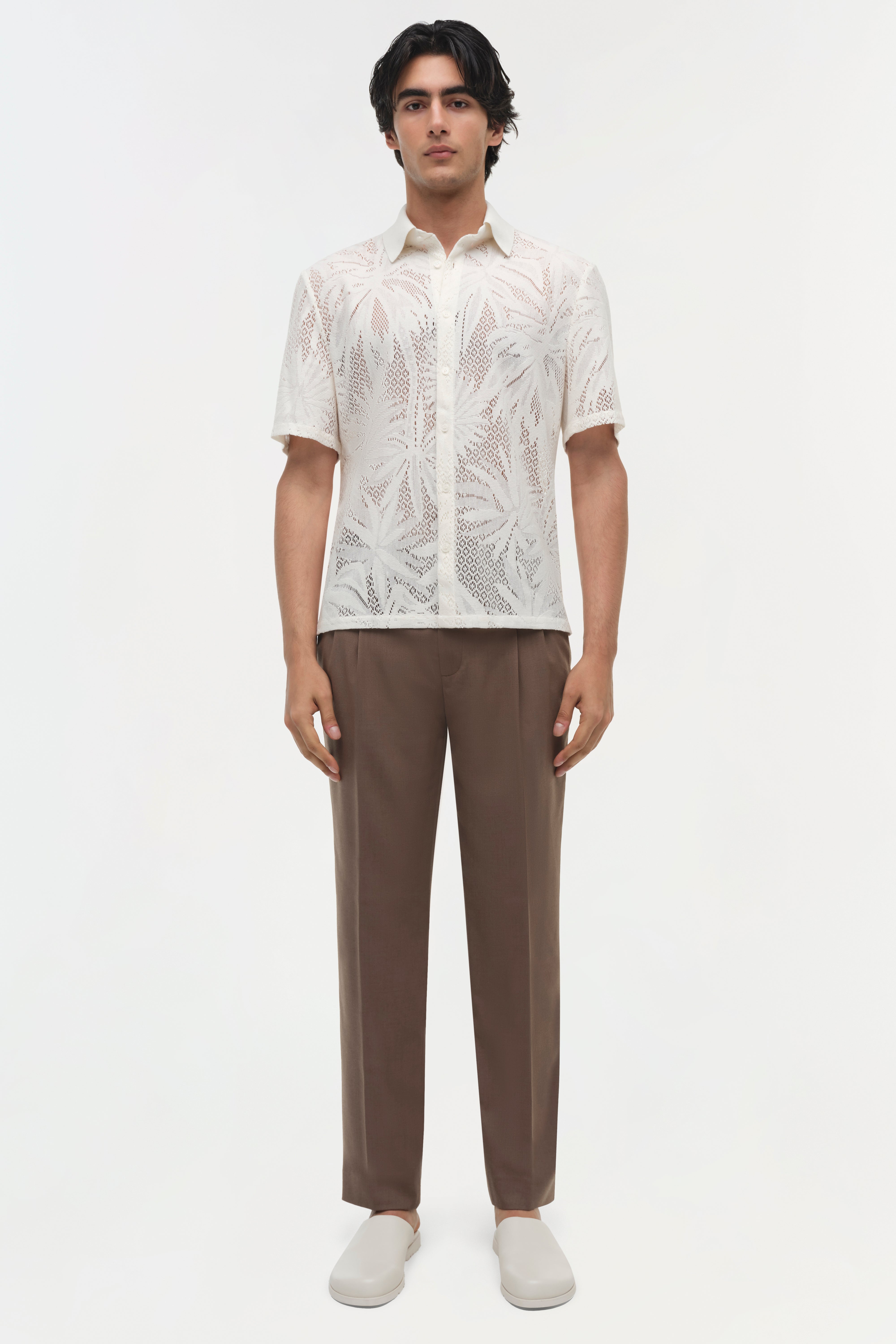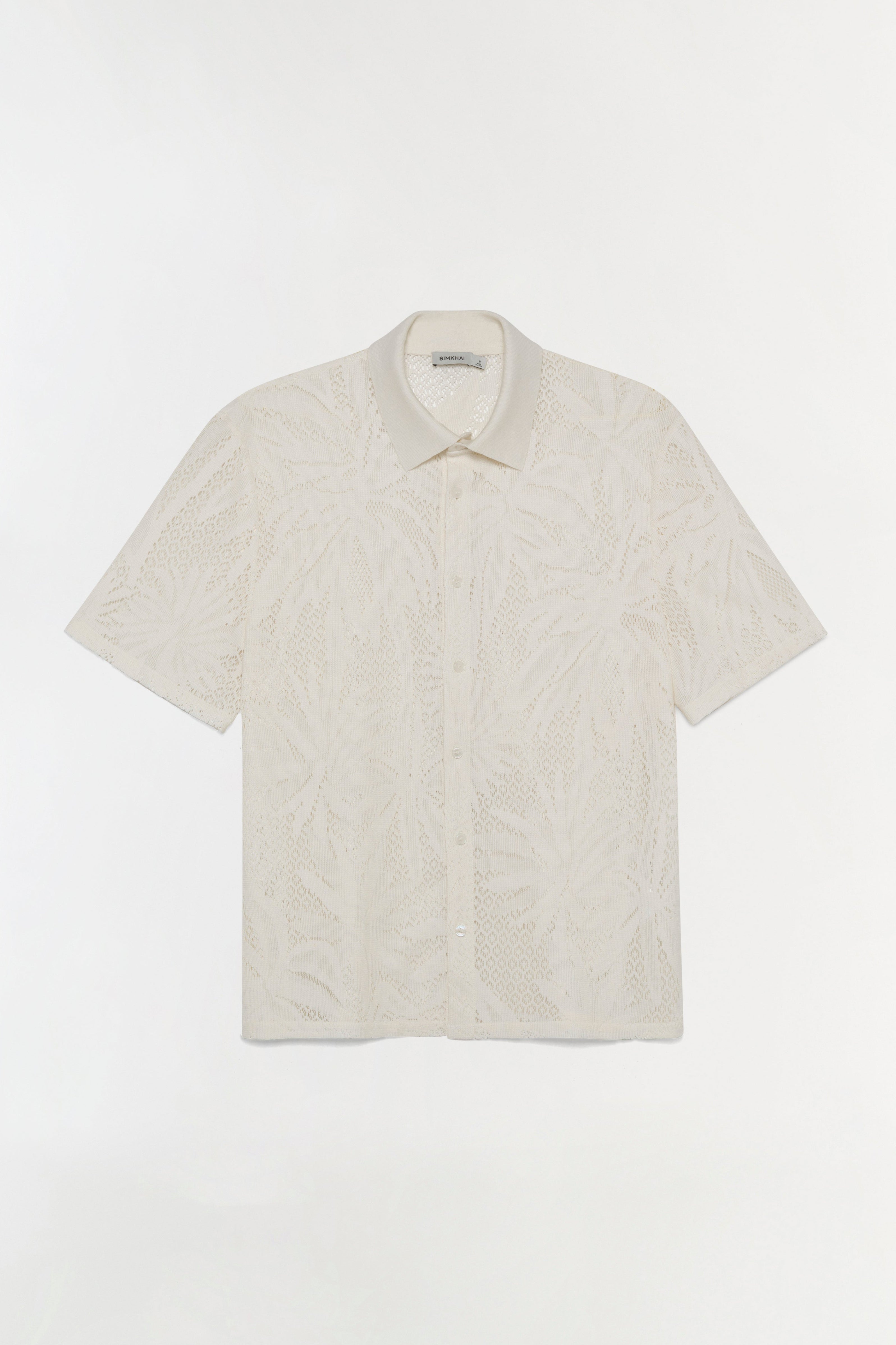 Cut from intricate open lace with a subtle palm tree motif, this shirt blends a close, refined fit with relaxed ease. A classic collar and button-front placket introduce sharp structure, giving the piece a polished, modern finish.