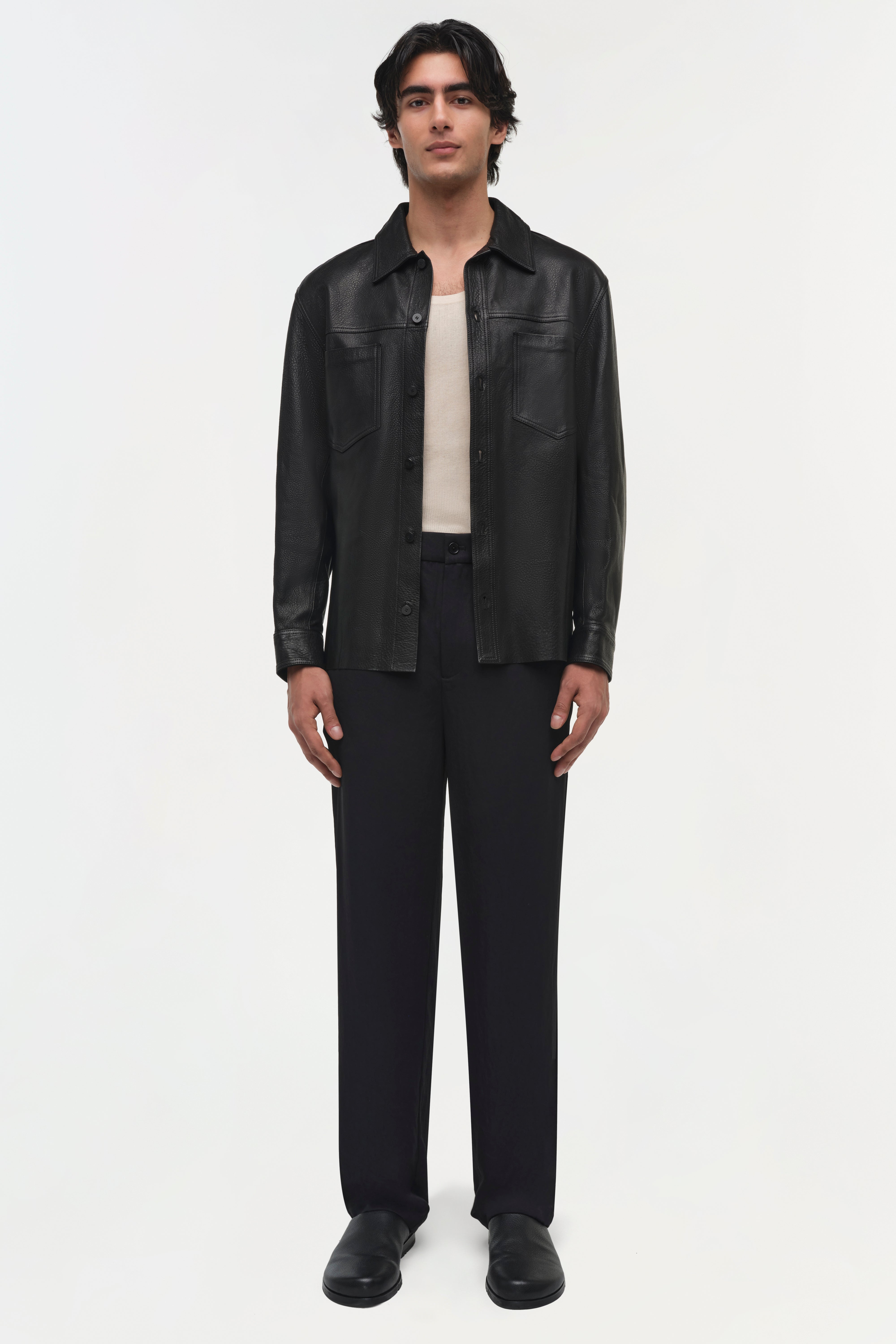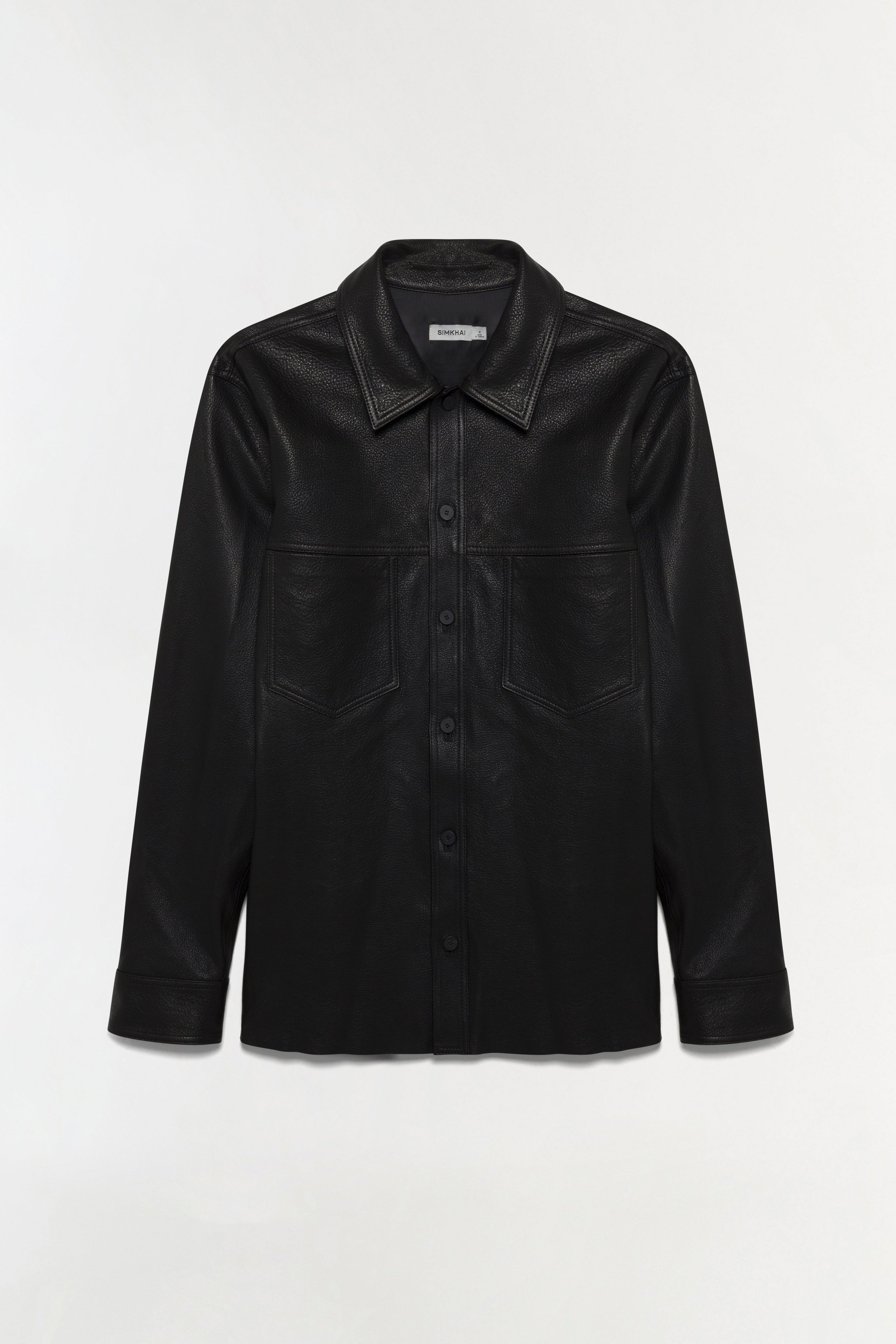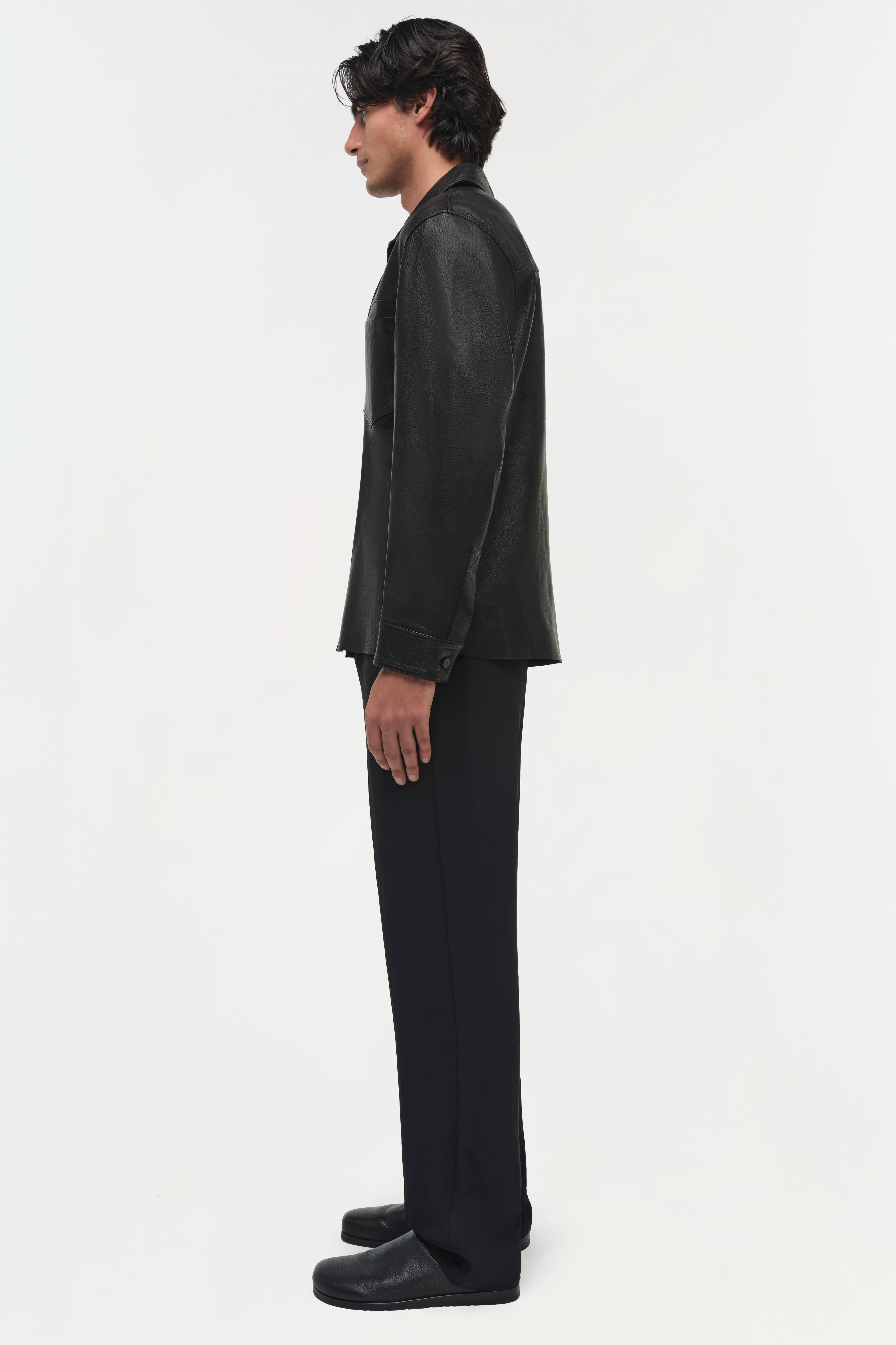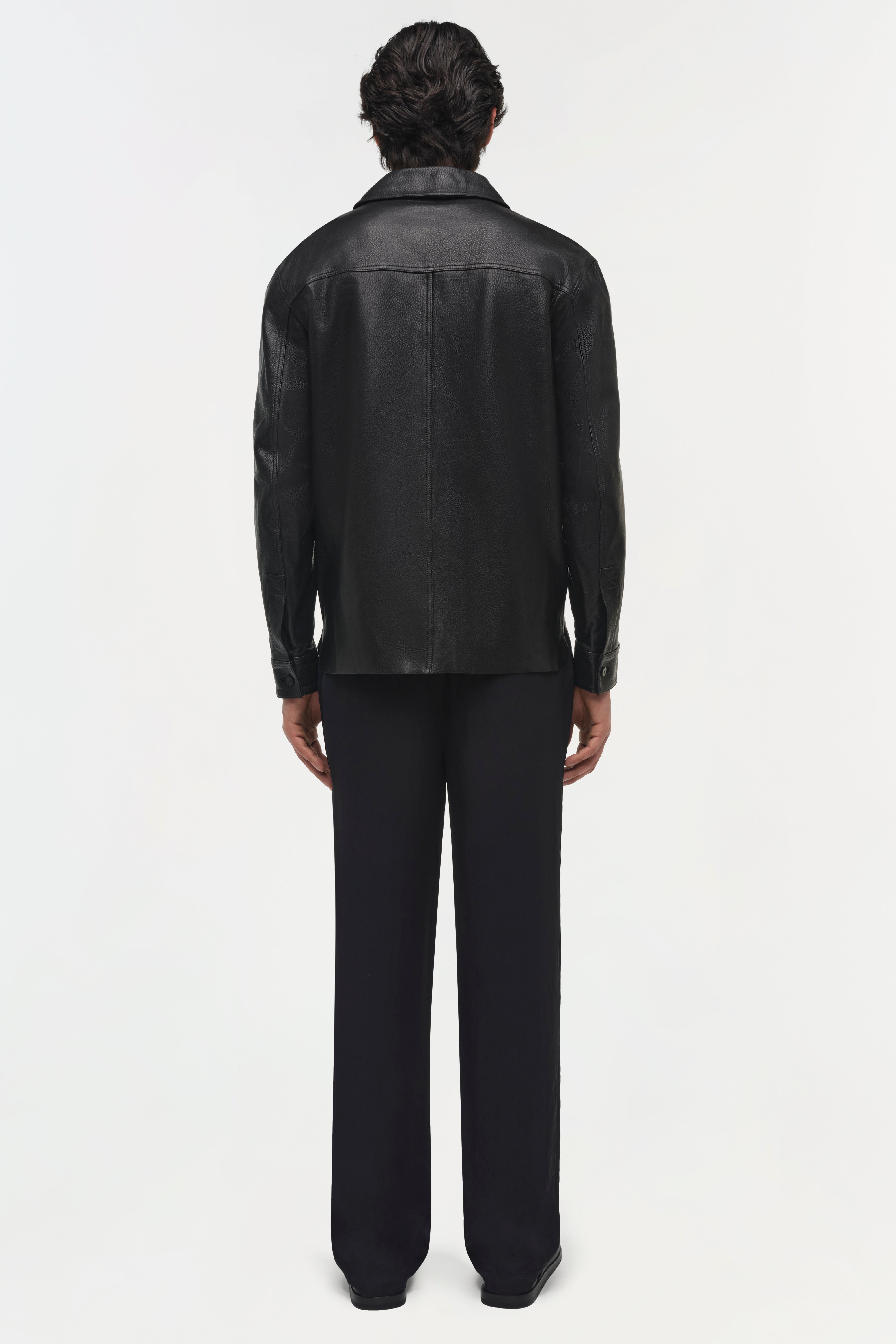 Crafted in refined leather, this shirt jacket balances classic menswear structure with modern detailing. The structured collar, button-front, and chest pockets are complemented by intricate topstitch detailing.