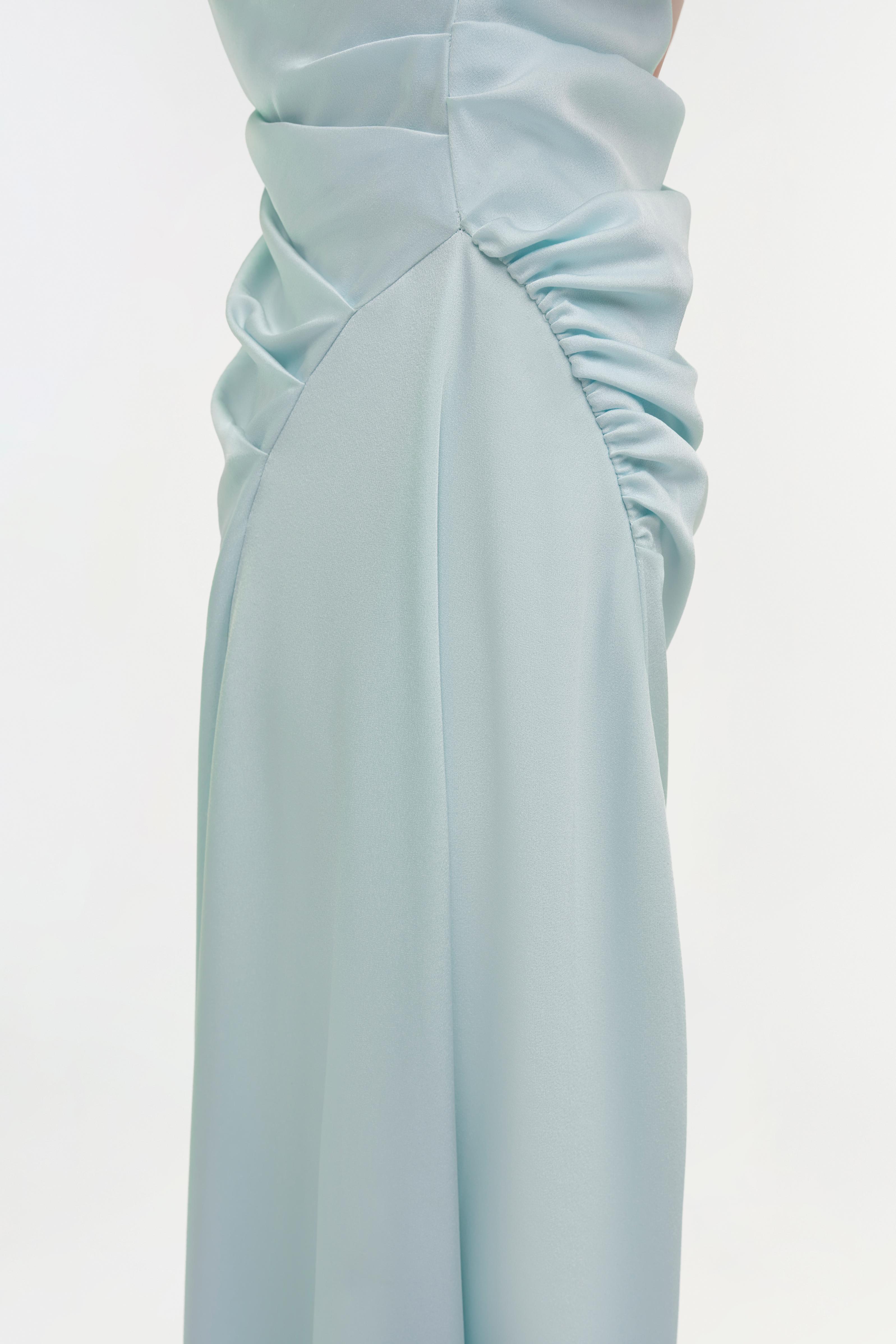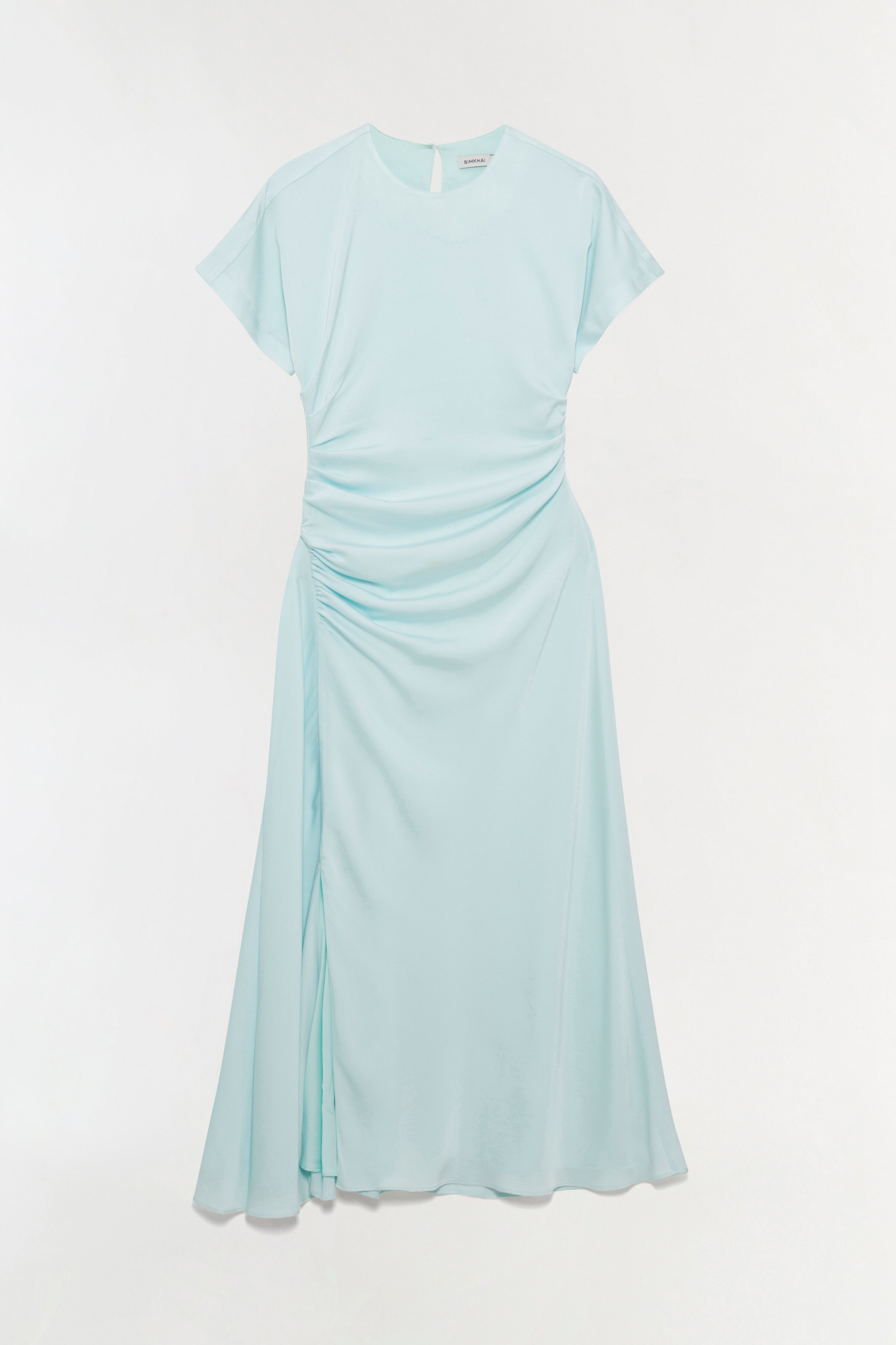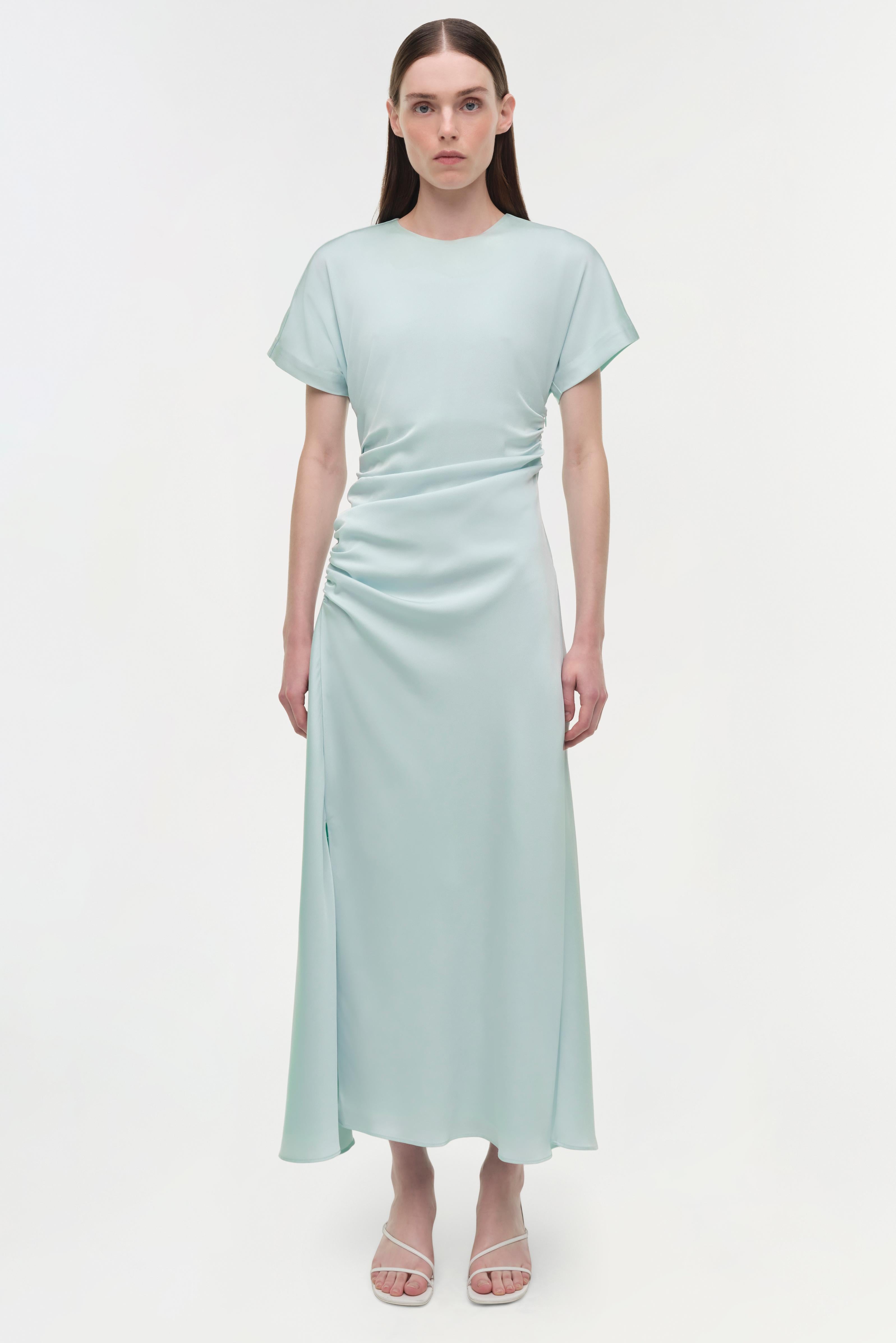 Made from lustrous satin, this midi dress features a softly ruched waist that shapes the body with precision. The fluid skirt falls cleanly from the hip, creating balance and poise. Elegant simplicity with a modern finish.