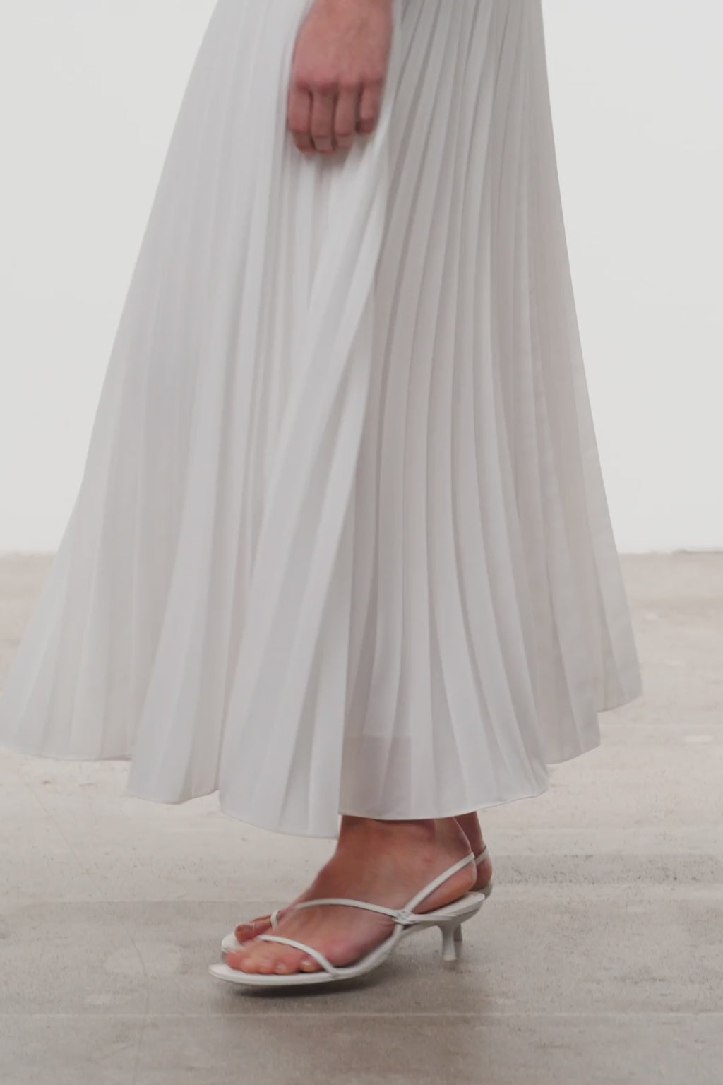 The Arie Dress in White. Crafted from pleated poplin, this strapless bustier midi features a sculpted bodice and a flowing pleated skirt.