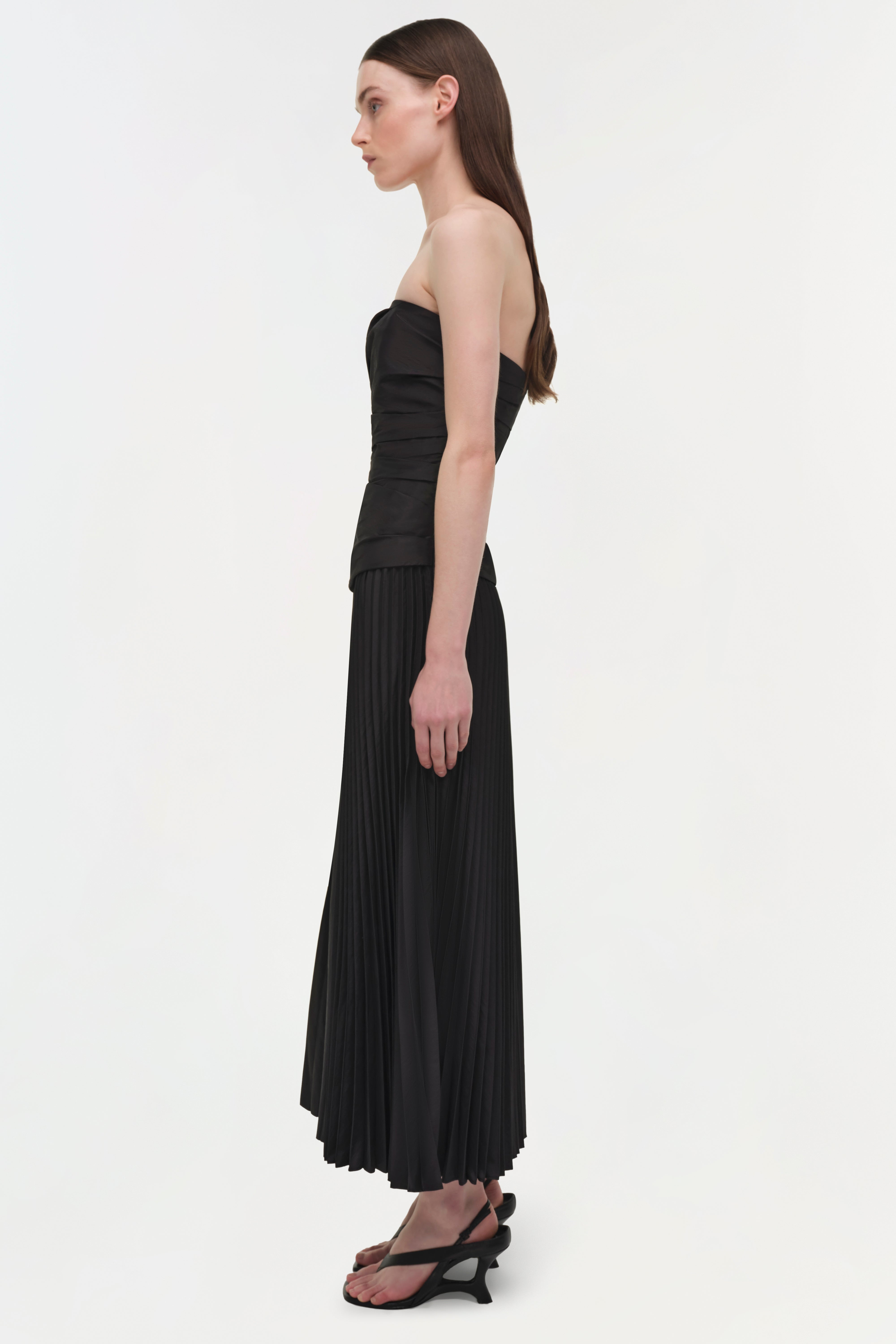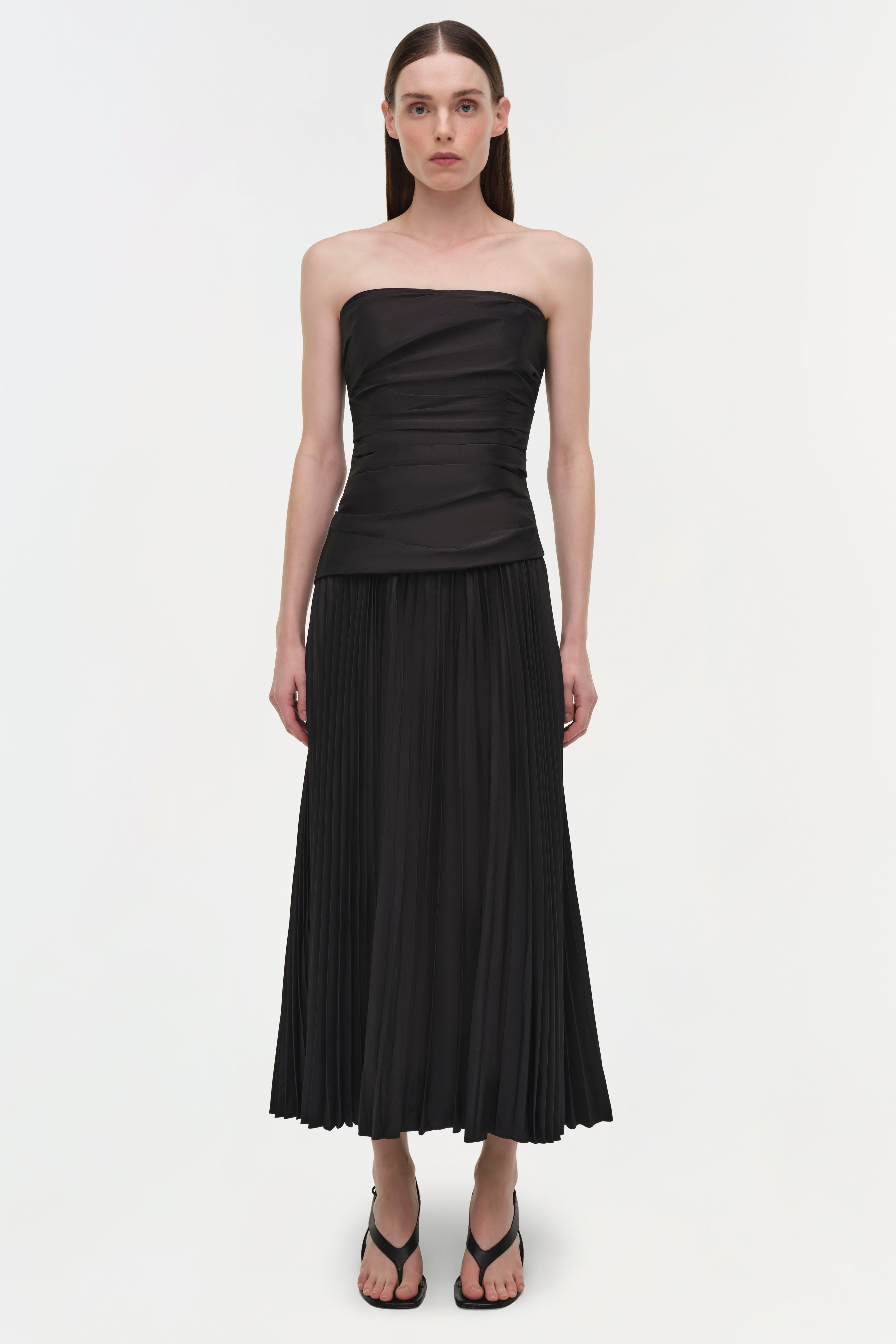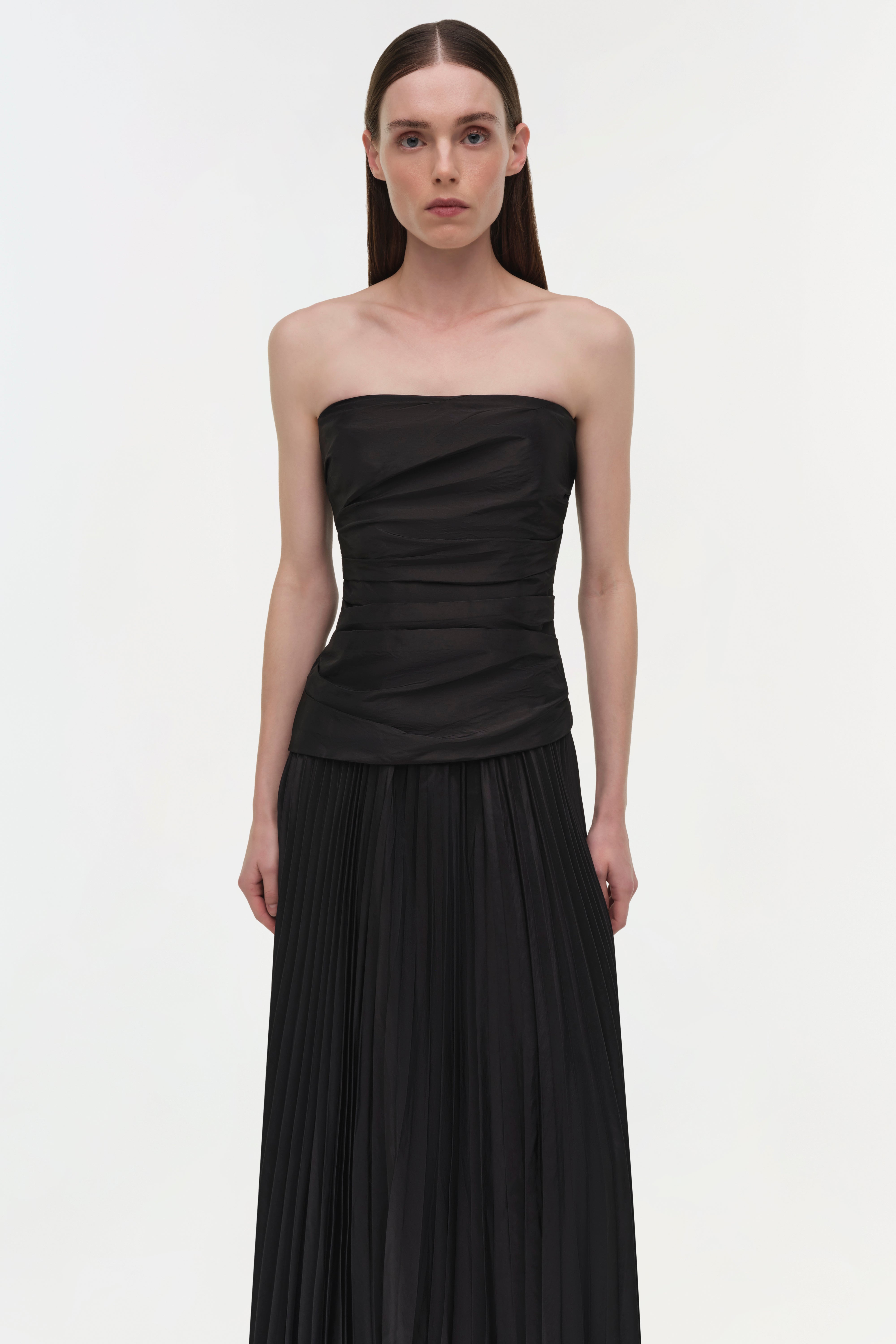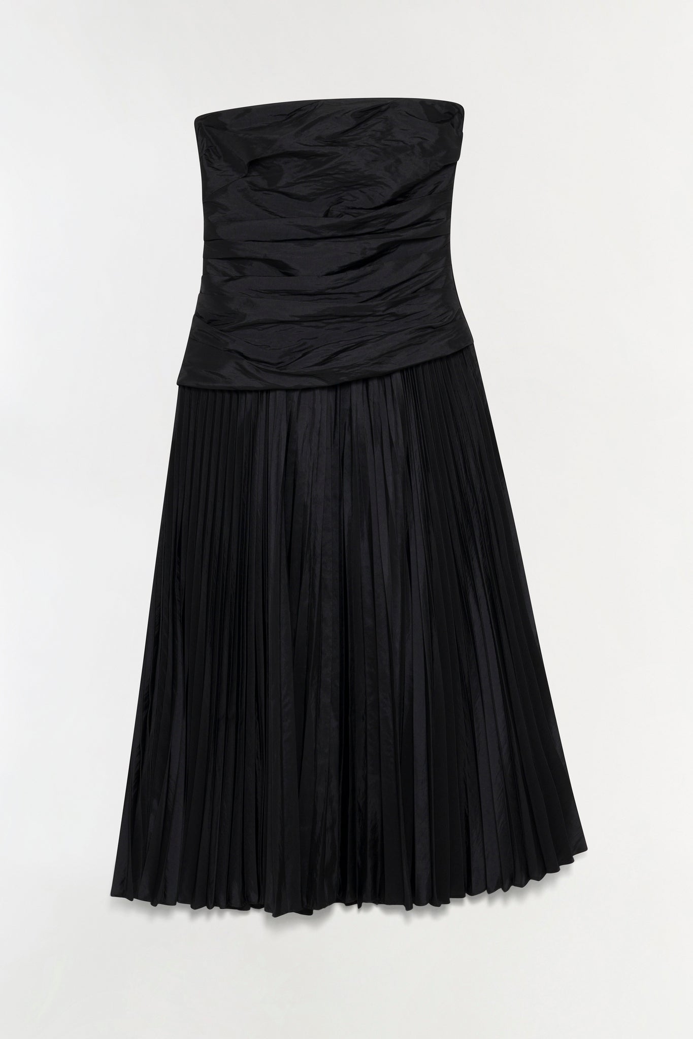 Crafted in crisp taffeta, this strapless midi dress is tailored with a sculpted, ruched bodice that defines the waist. The skirt falls into precise pleats, creating fluid movement and a refined sense of volume. A polished silhouette, designed with modern structure.