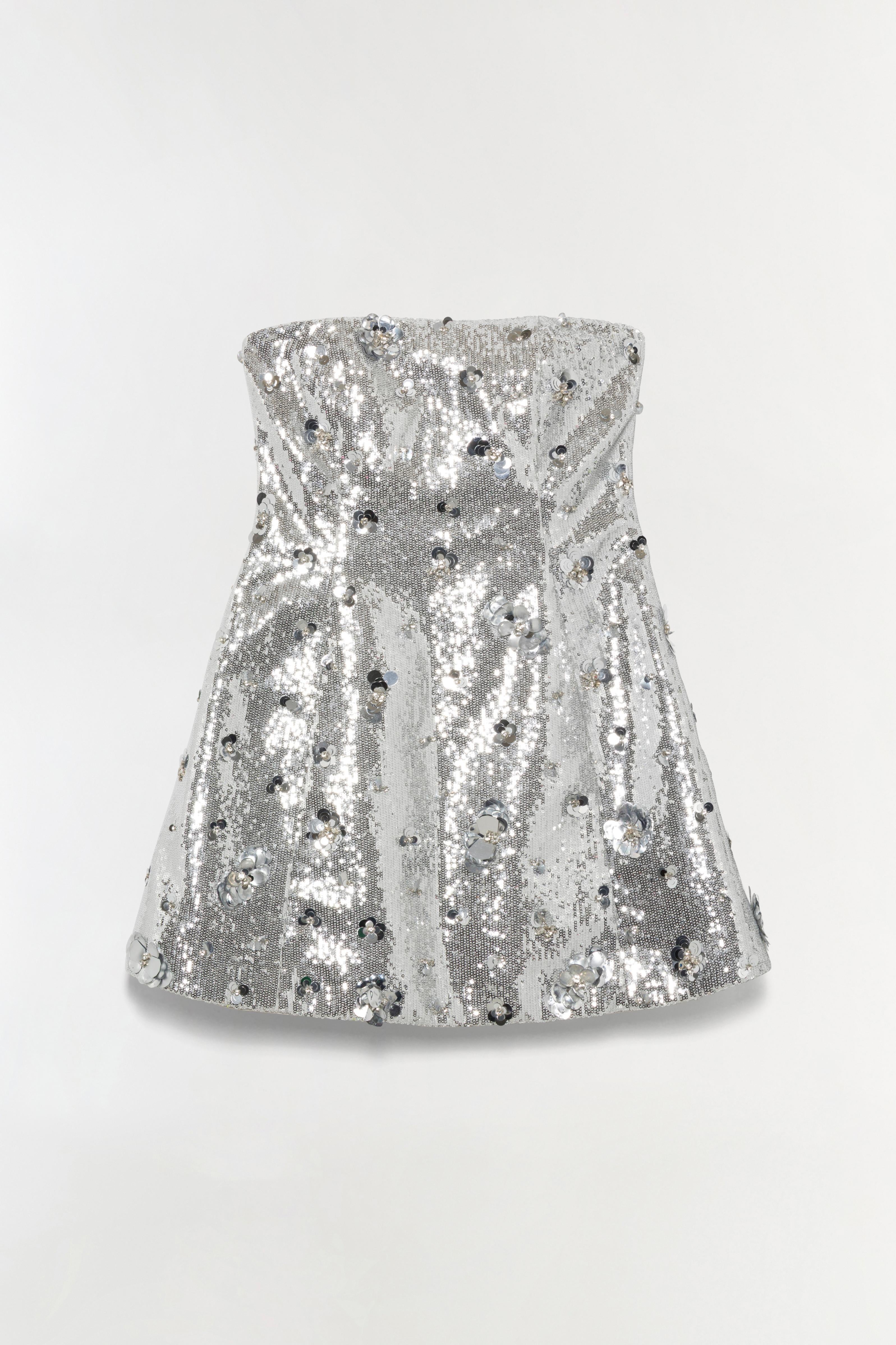 The Arta Embellished Sequin Bustier Mini Dress in Silver