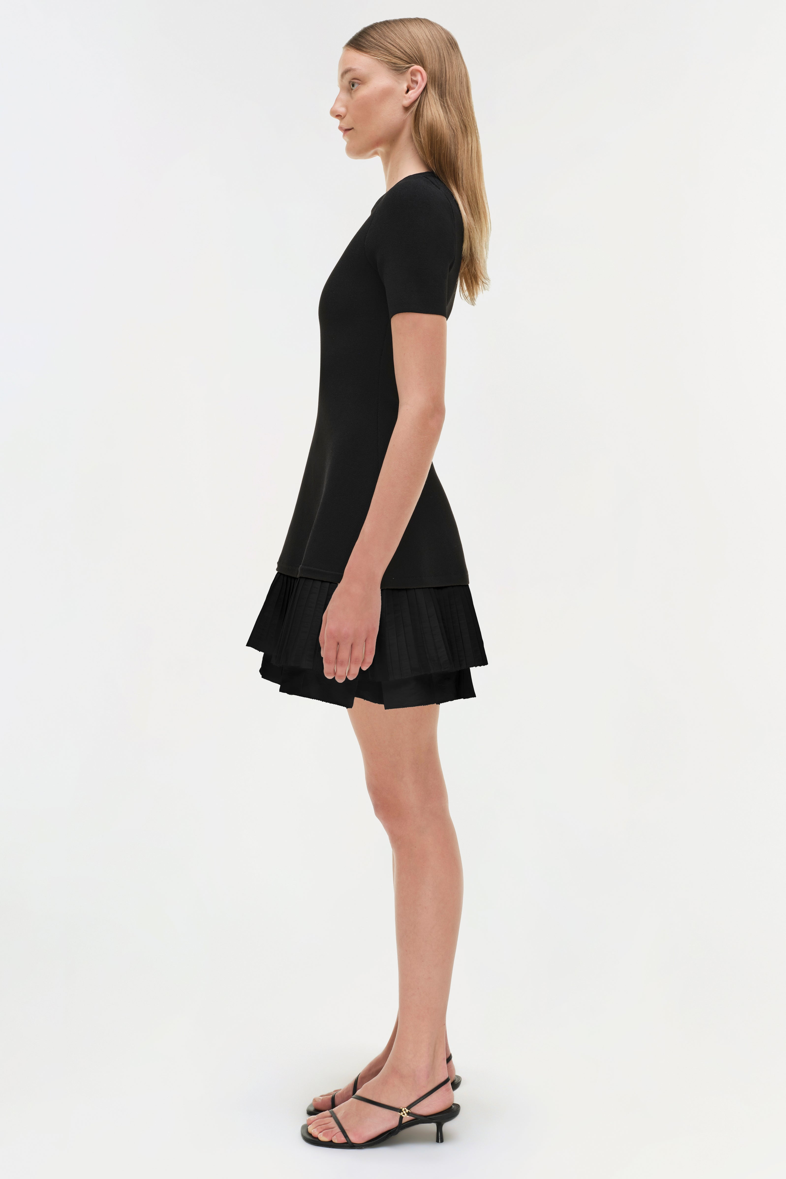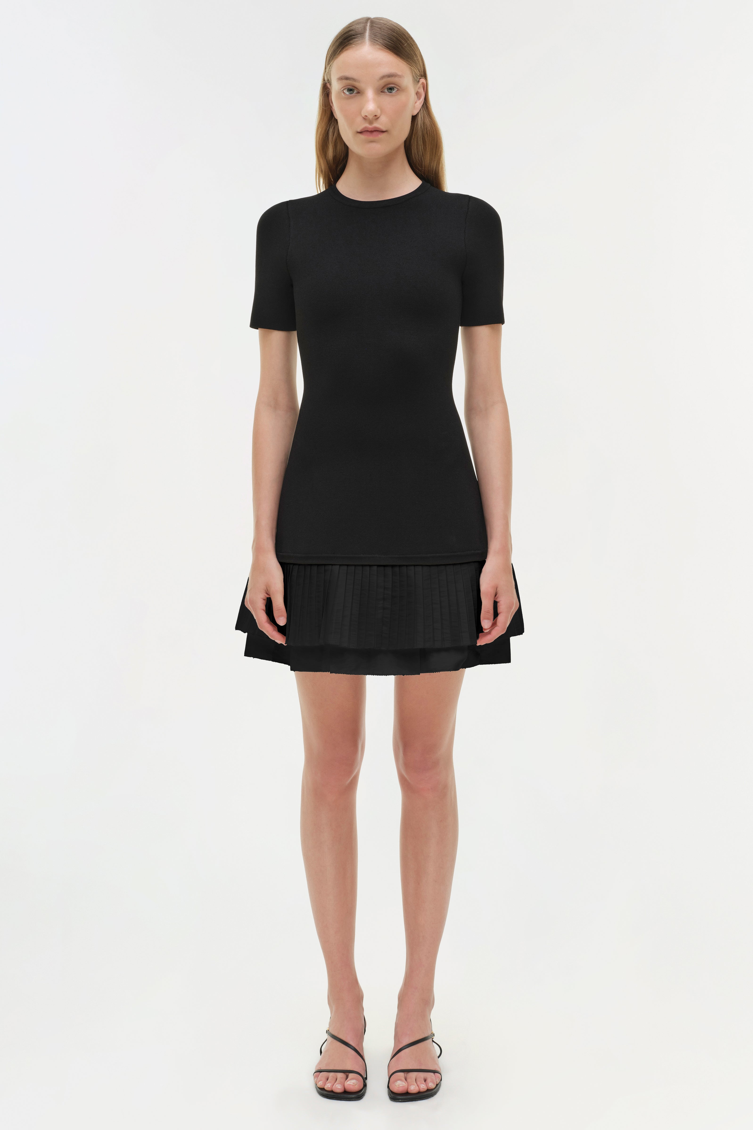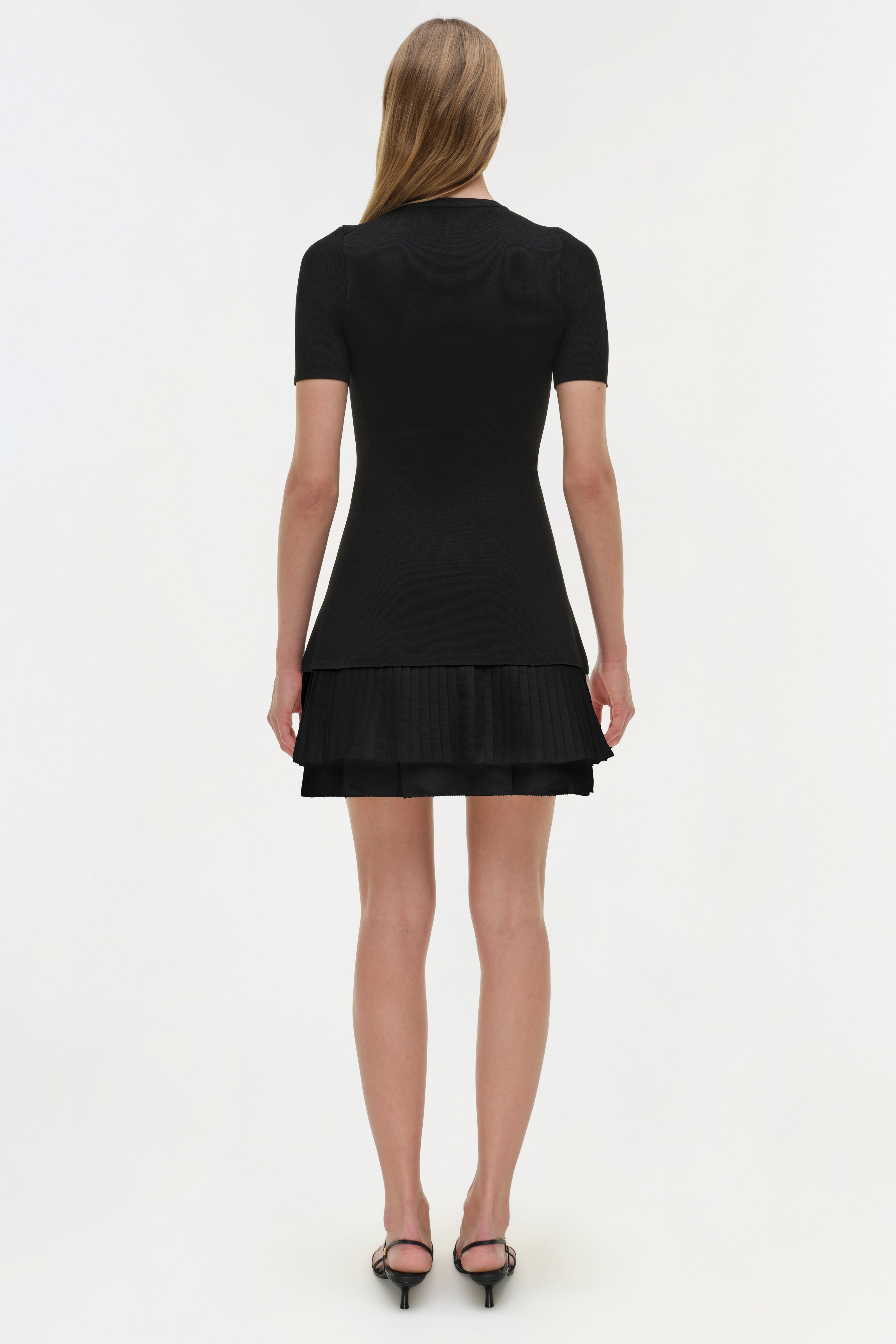 A mixed-media mini dress with a short sleeve, crew neckline knit upper and double layer skirt with a micro-pleated taffeta over layer.