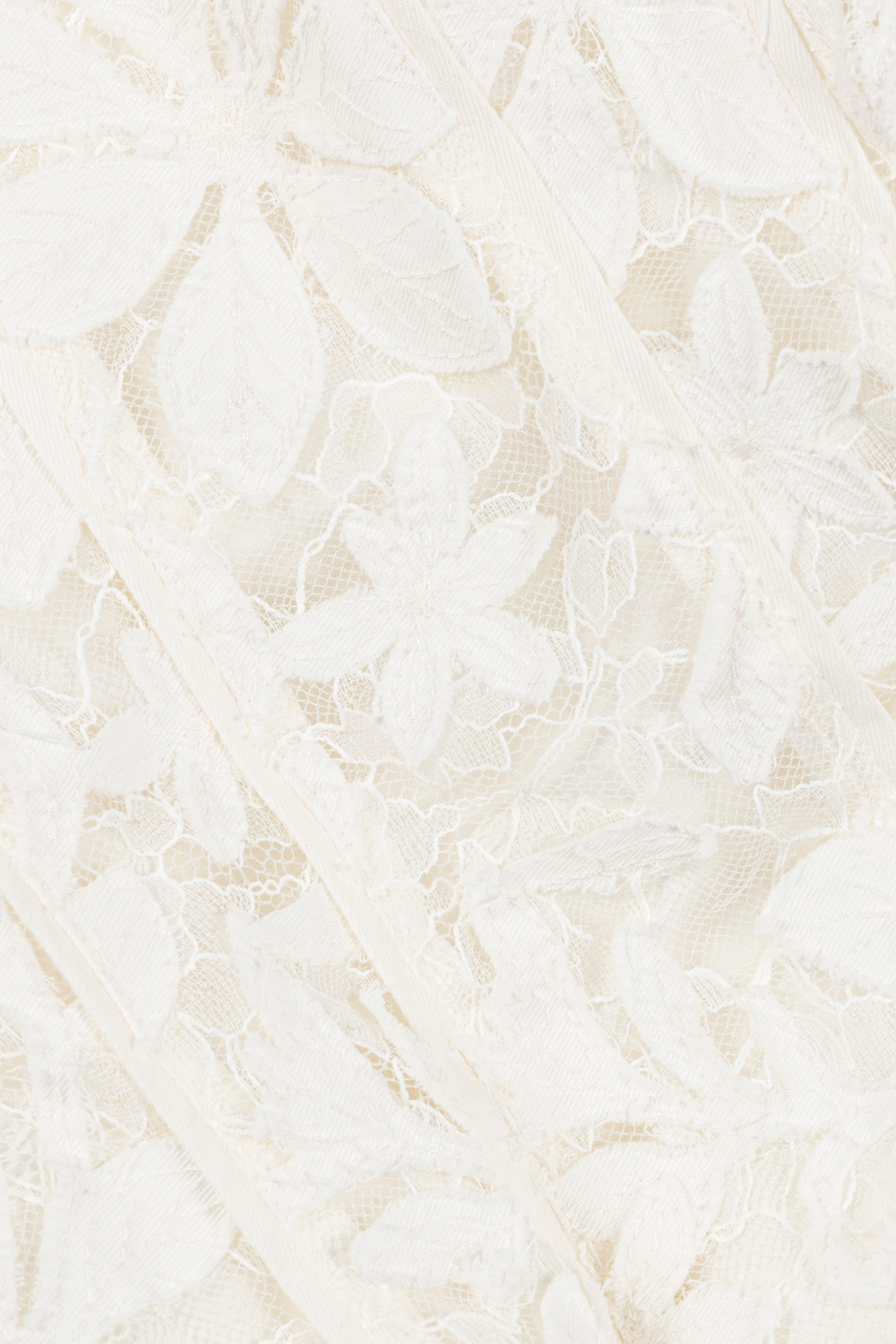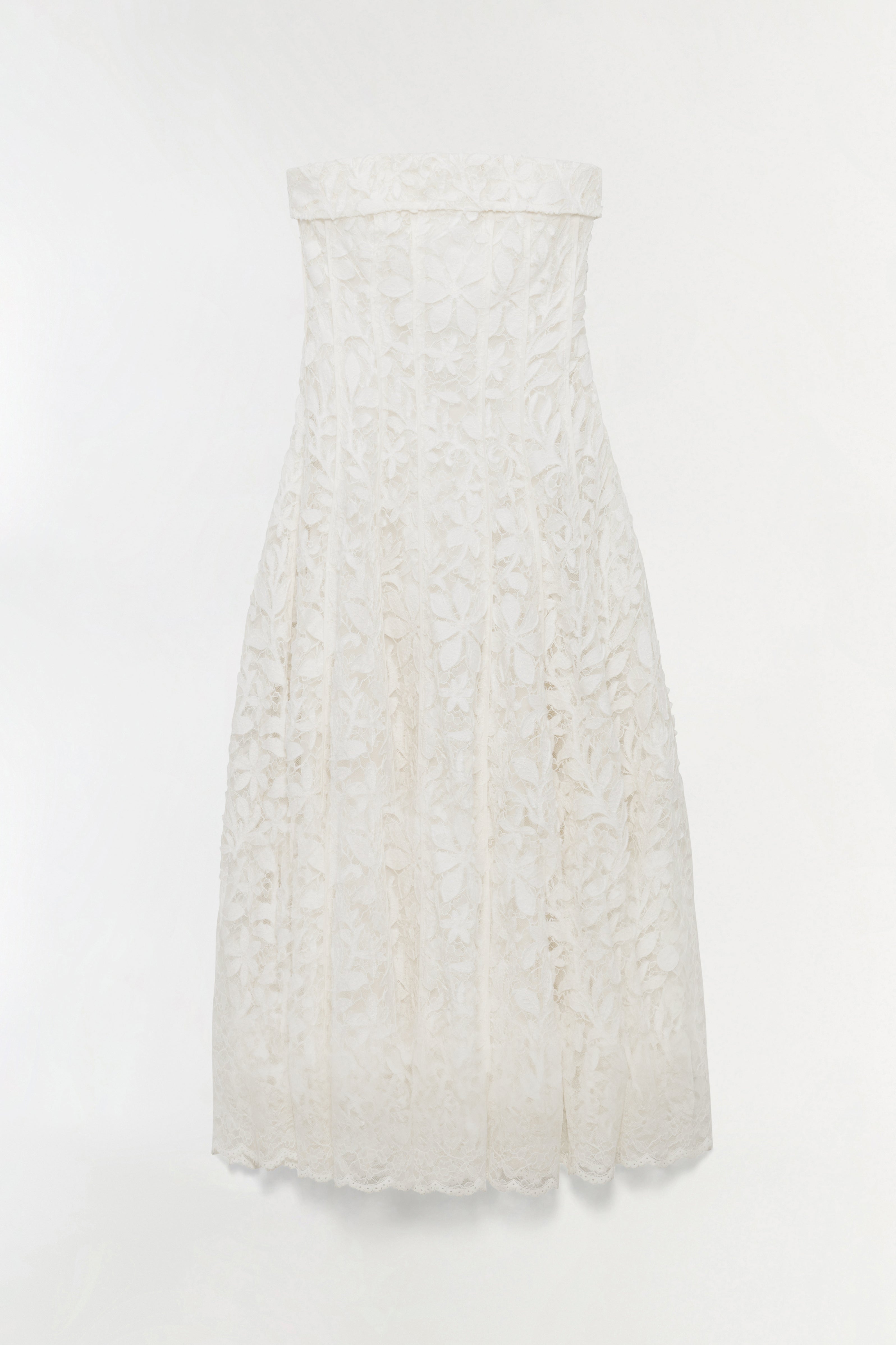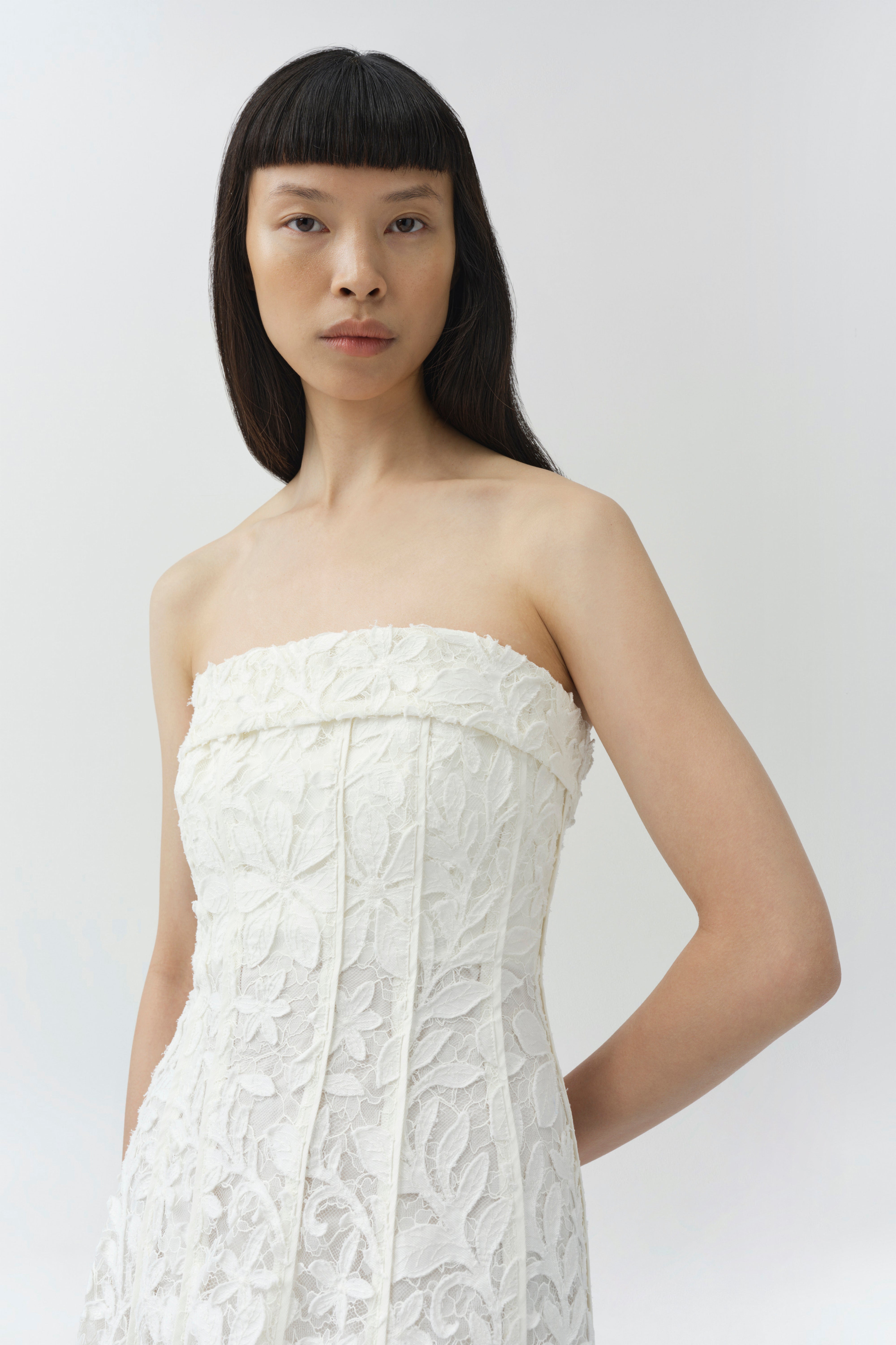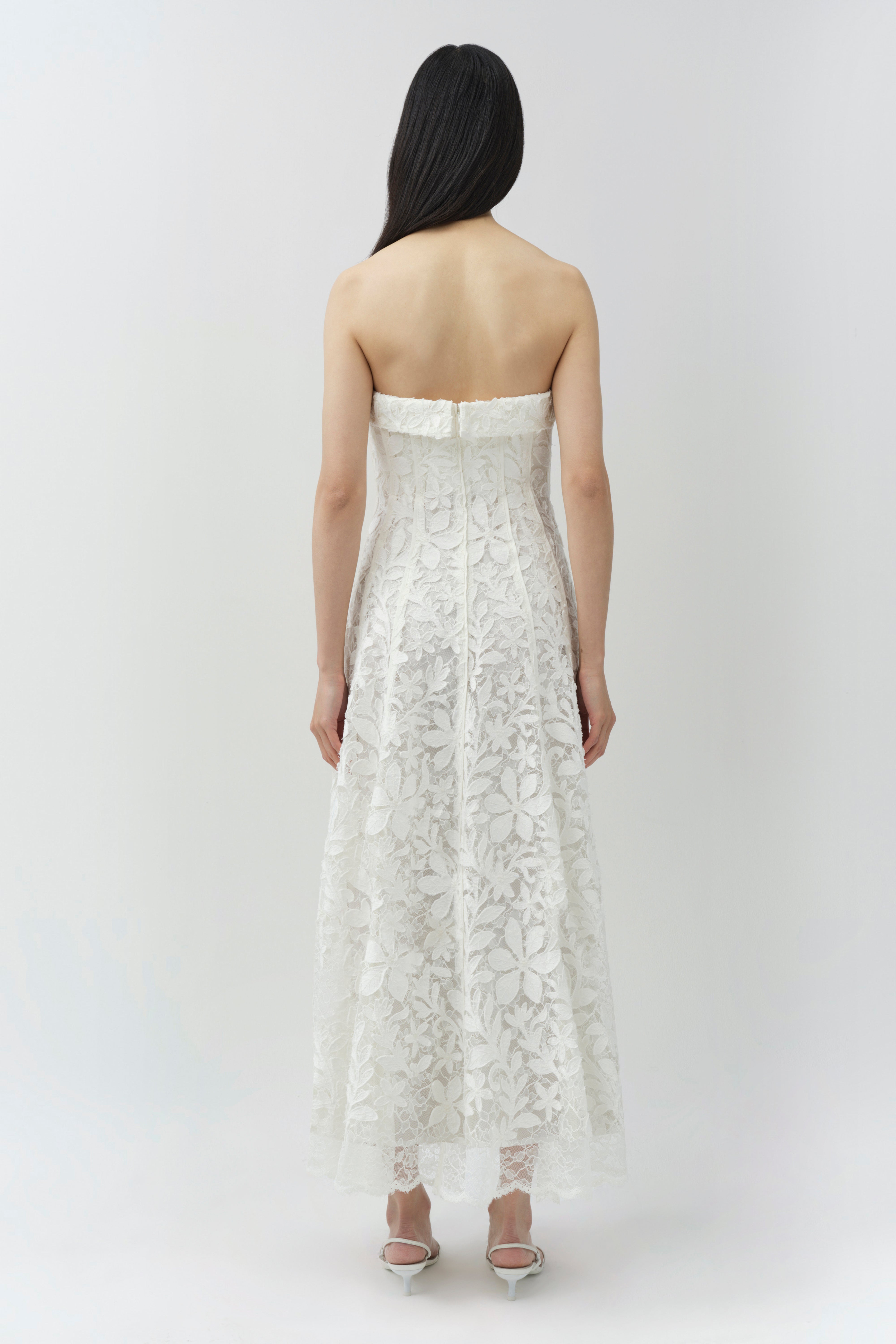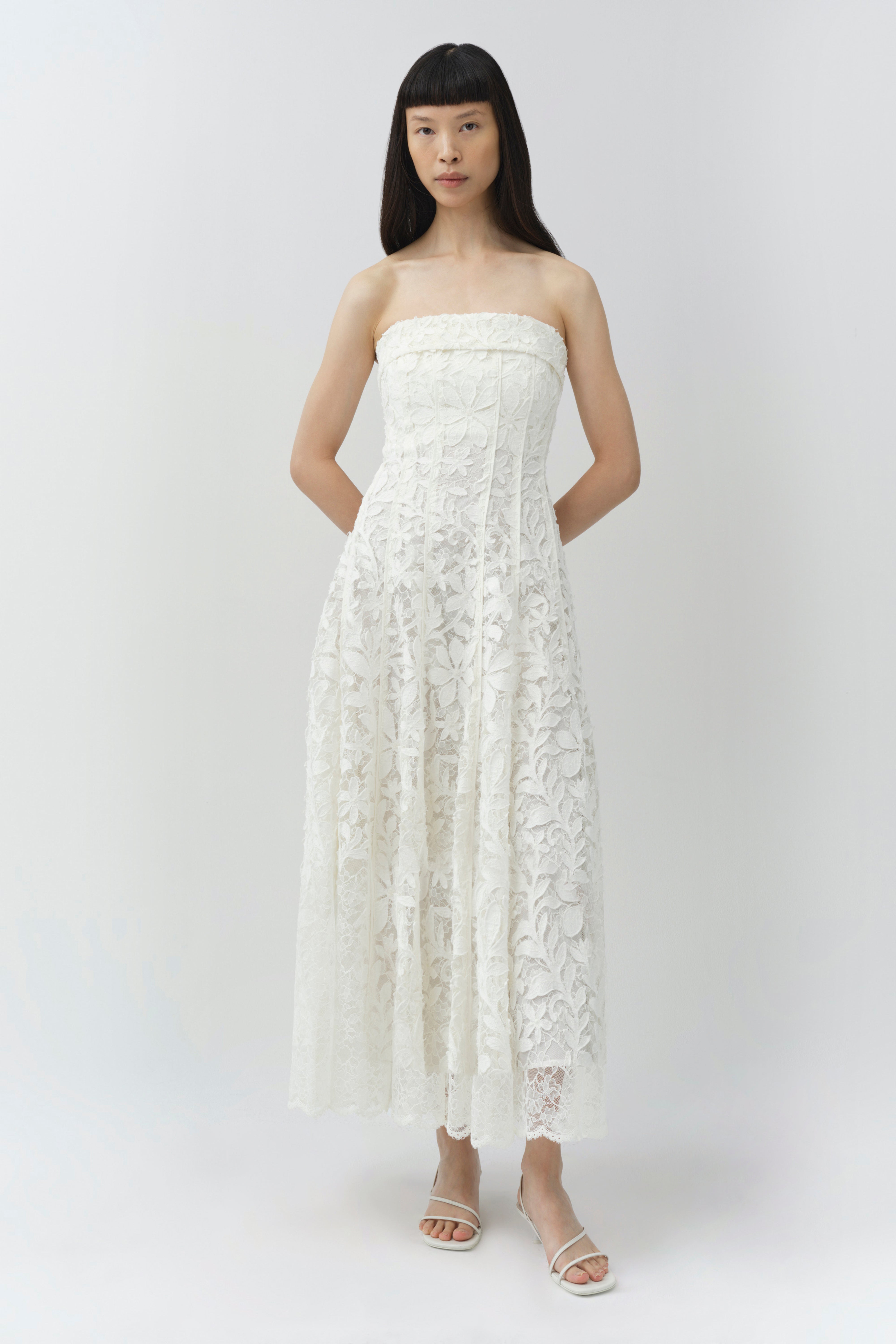 The Imogen Lace Bustier Midi Dress in White. Crafted in fil coupe lace, this strapless midi dress is shaped with a fitted bustier bodice and a softly flared skirt. The intricate floral lace lends delicate texture and romantic intrigue.
