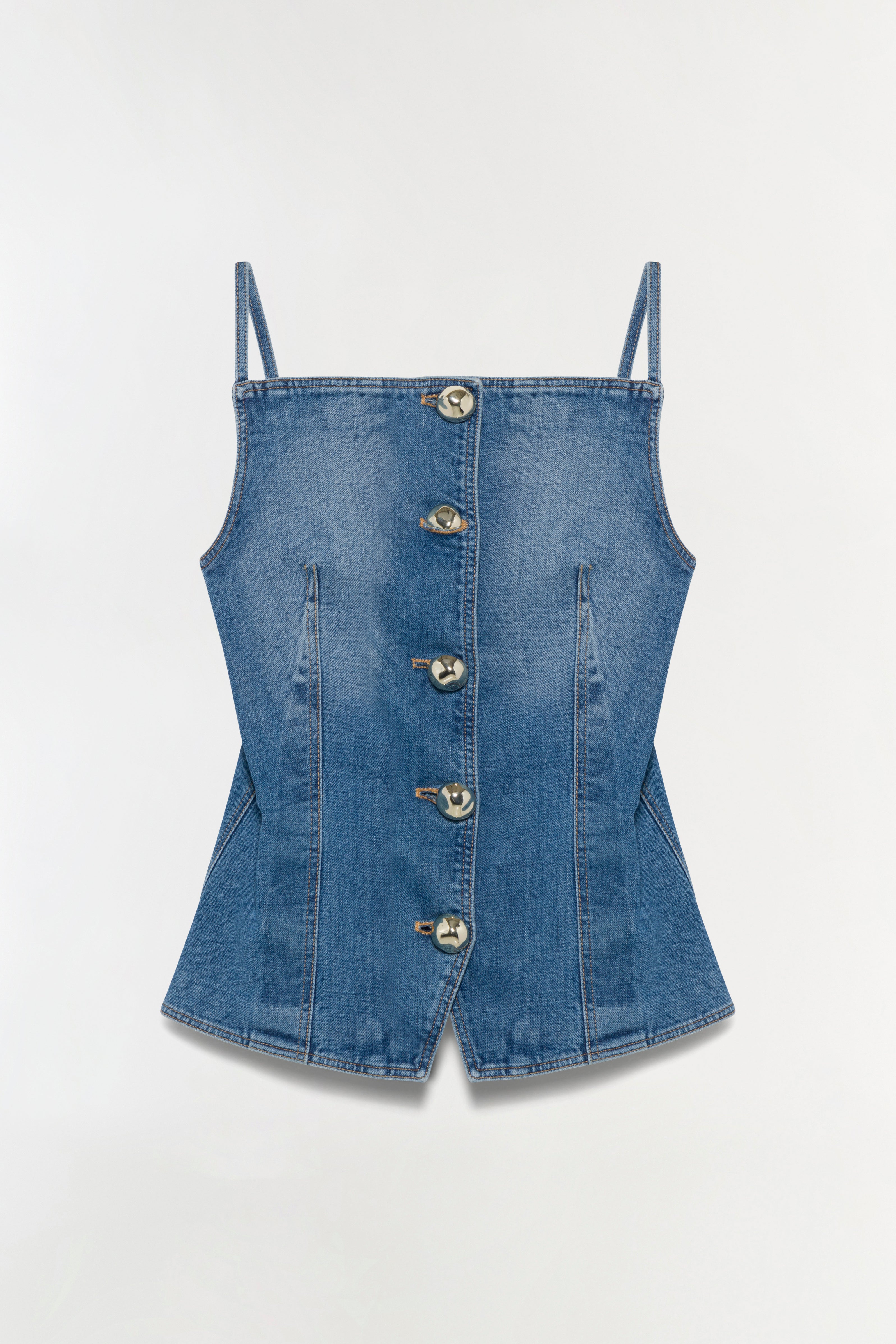 Made from structured denim, the top molds to the body with engineered seams and a sculpted hem. Golden buttons adorn the front, balancing utility and poise. A directional take on a timeless shape.