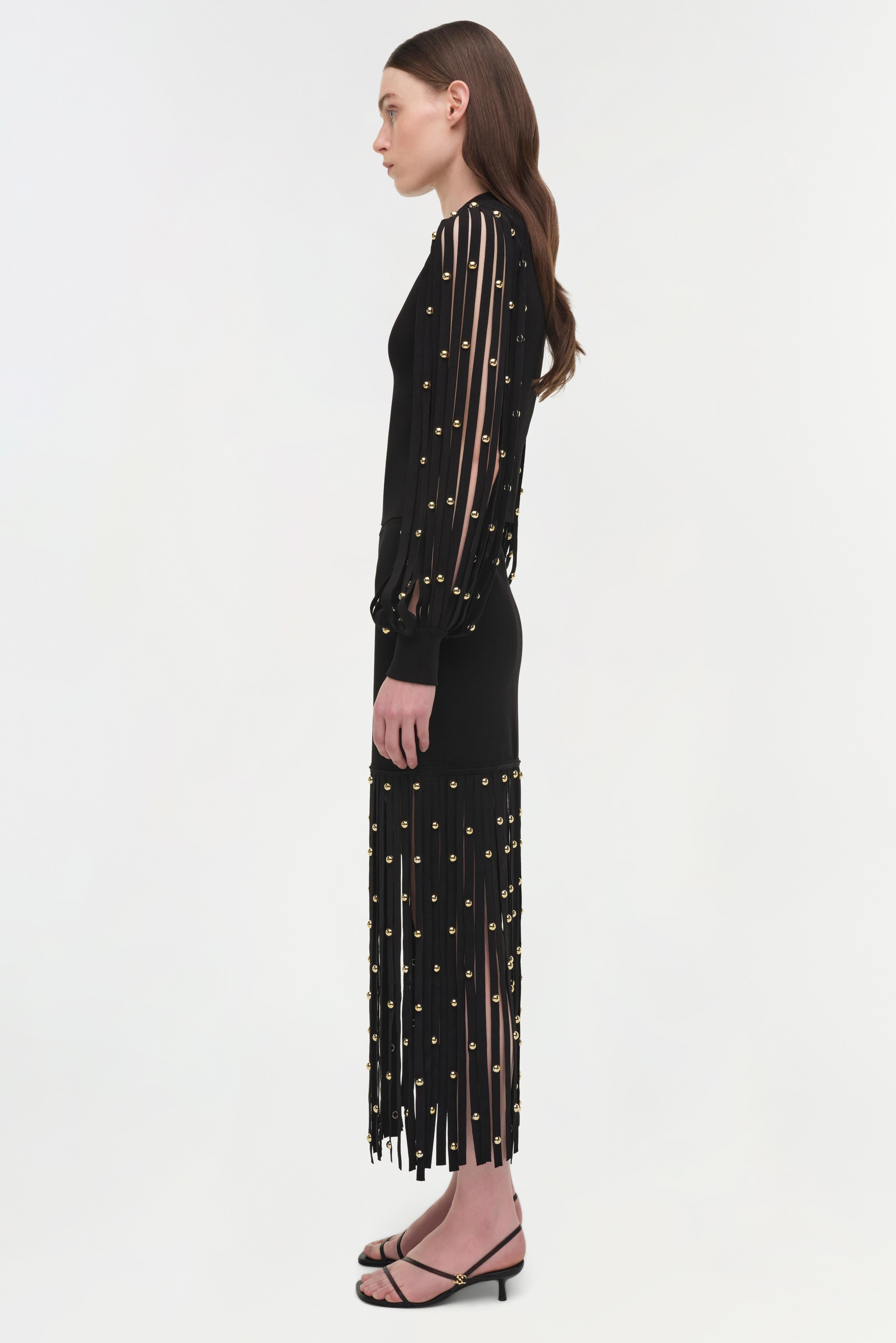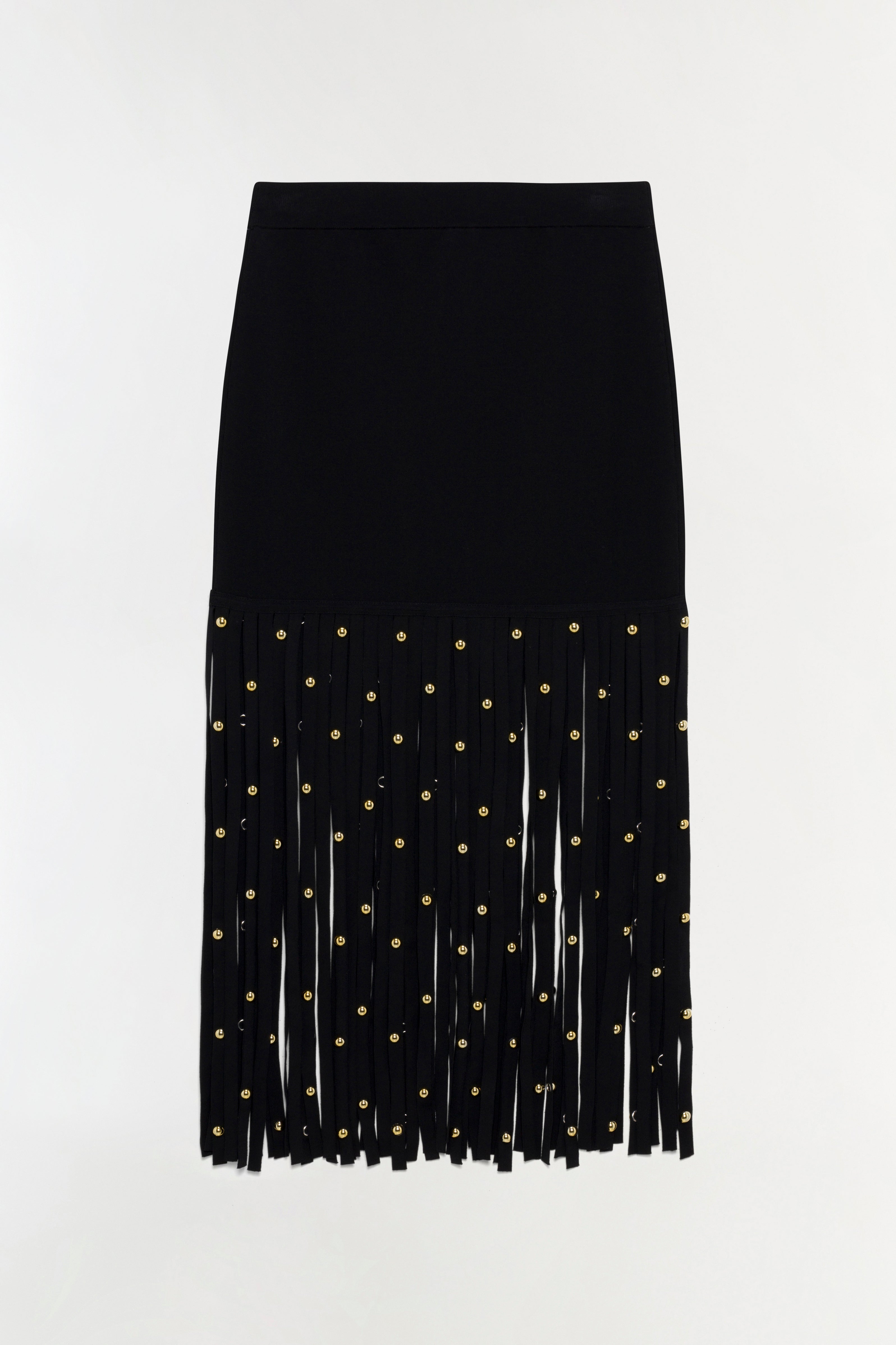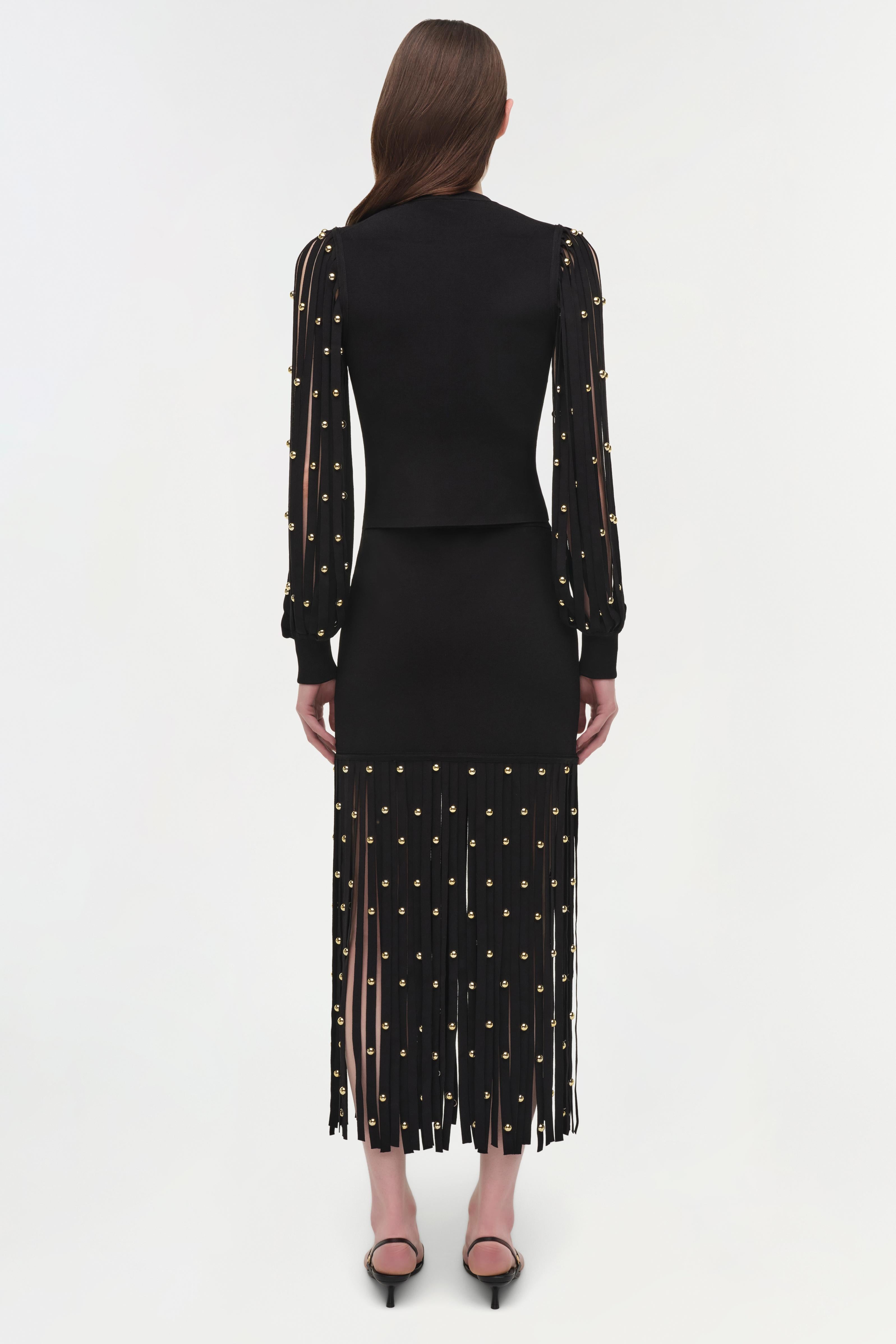 Crafted in a compact knit, this midi skirt is finished with gold-studded fringe that catches the light with every step. The playful detailing contrasts with a clean, streamlined silhouette, creating a look that’s both spirited and sophisticated.