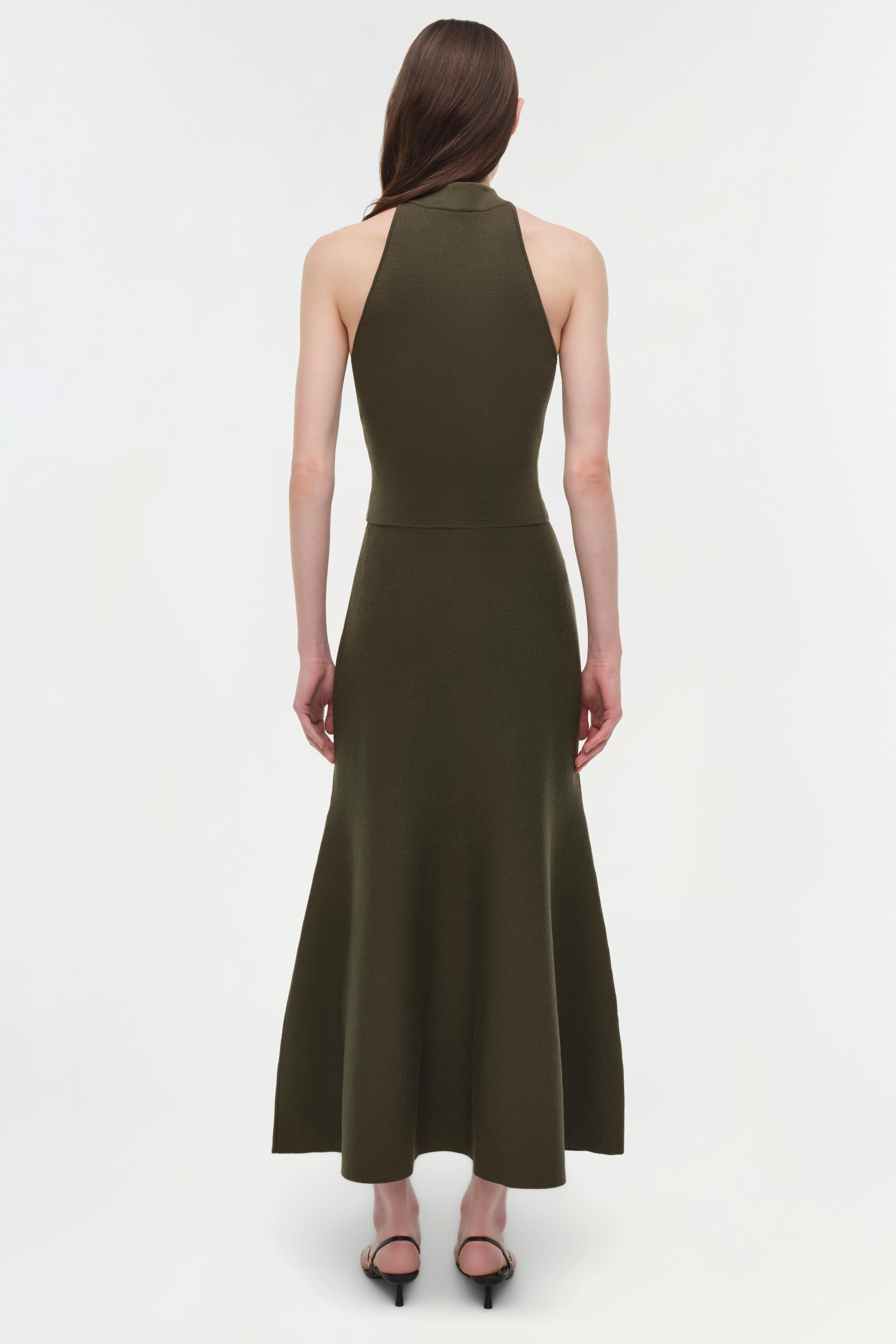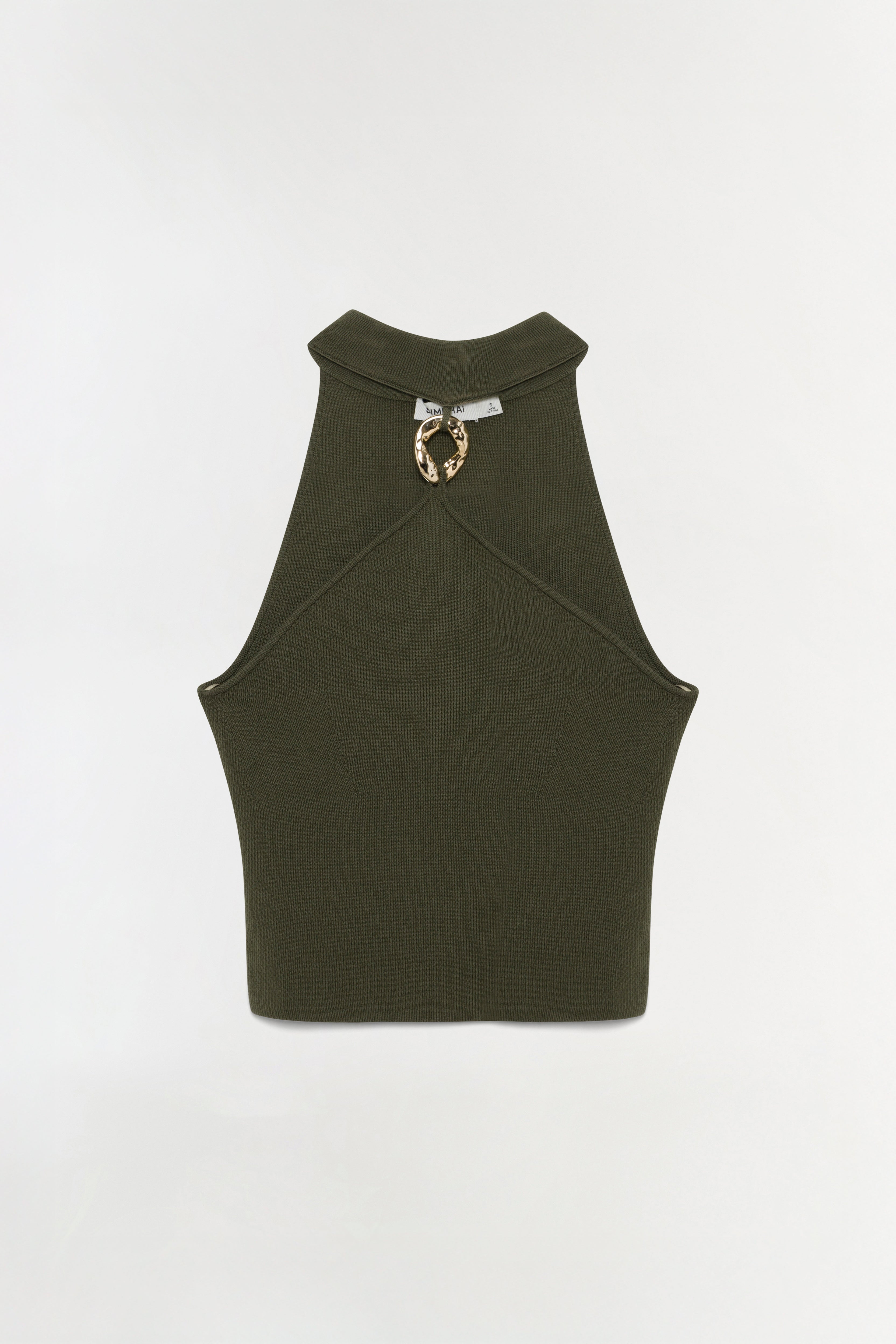 Crafted in fine merino wool, this piece features a compact ribbed knit that holds its shape beautifully. The halter neckline accentuates the shoulders and is finished with a statement metal hardware piece.