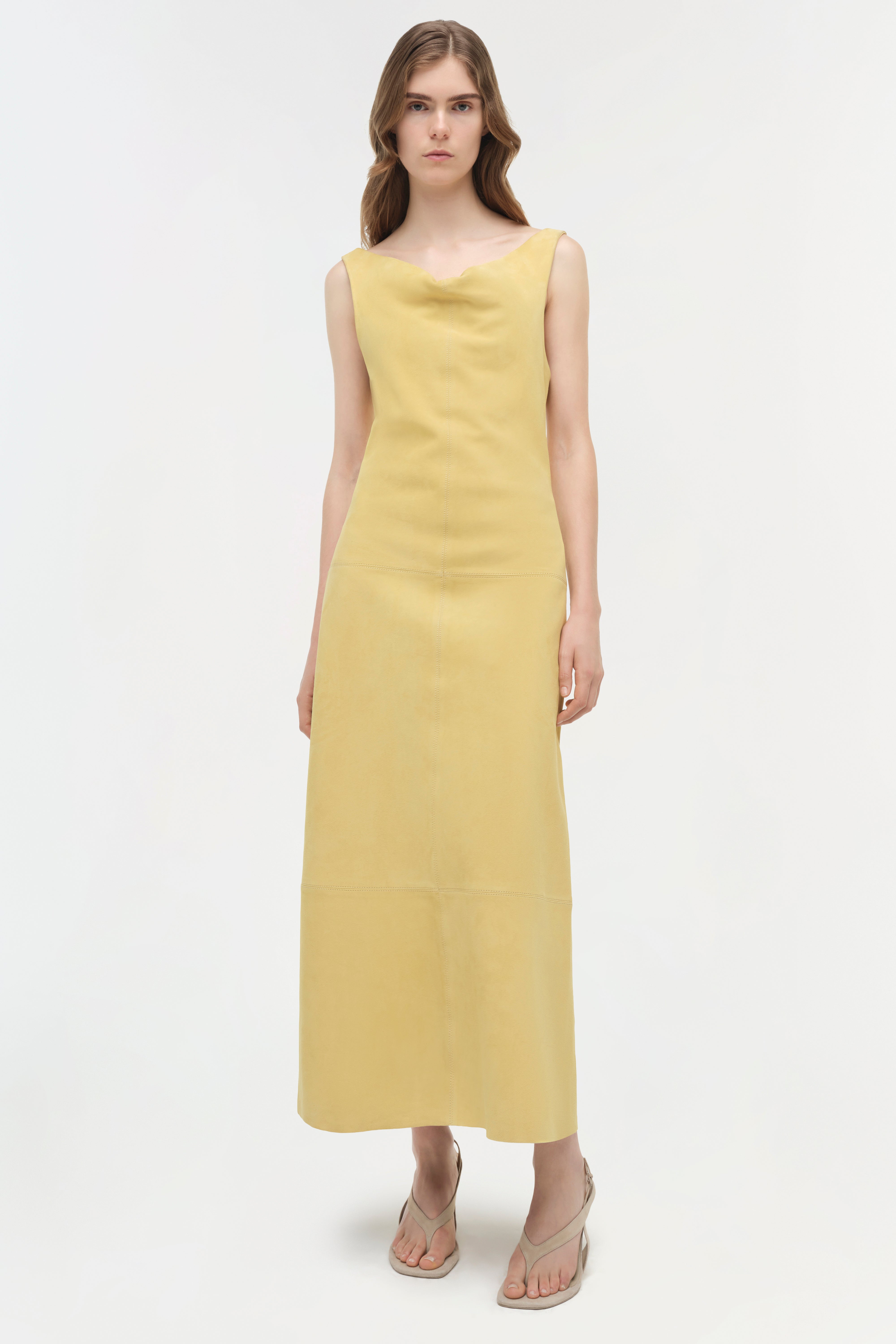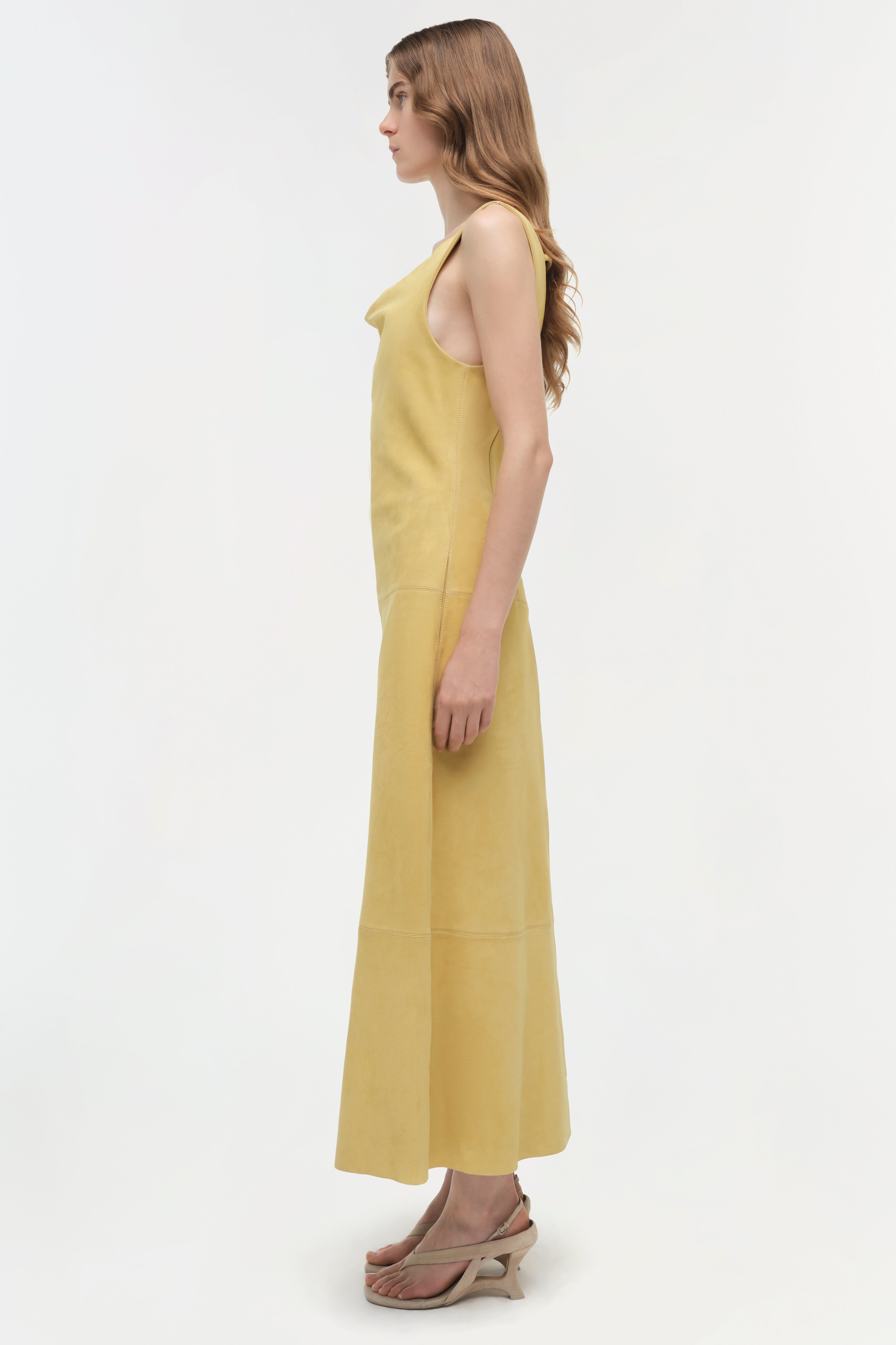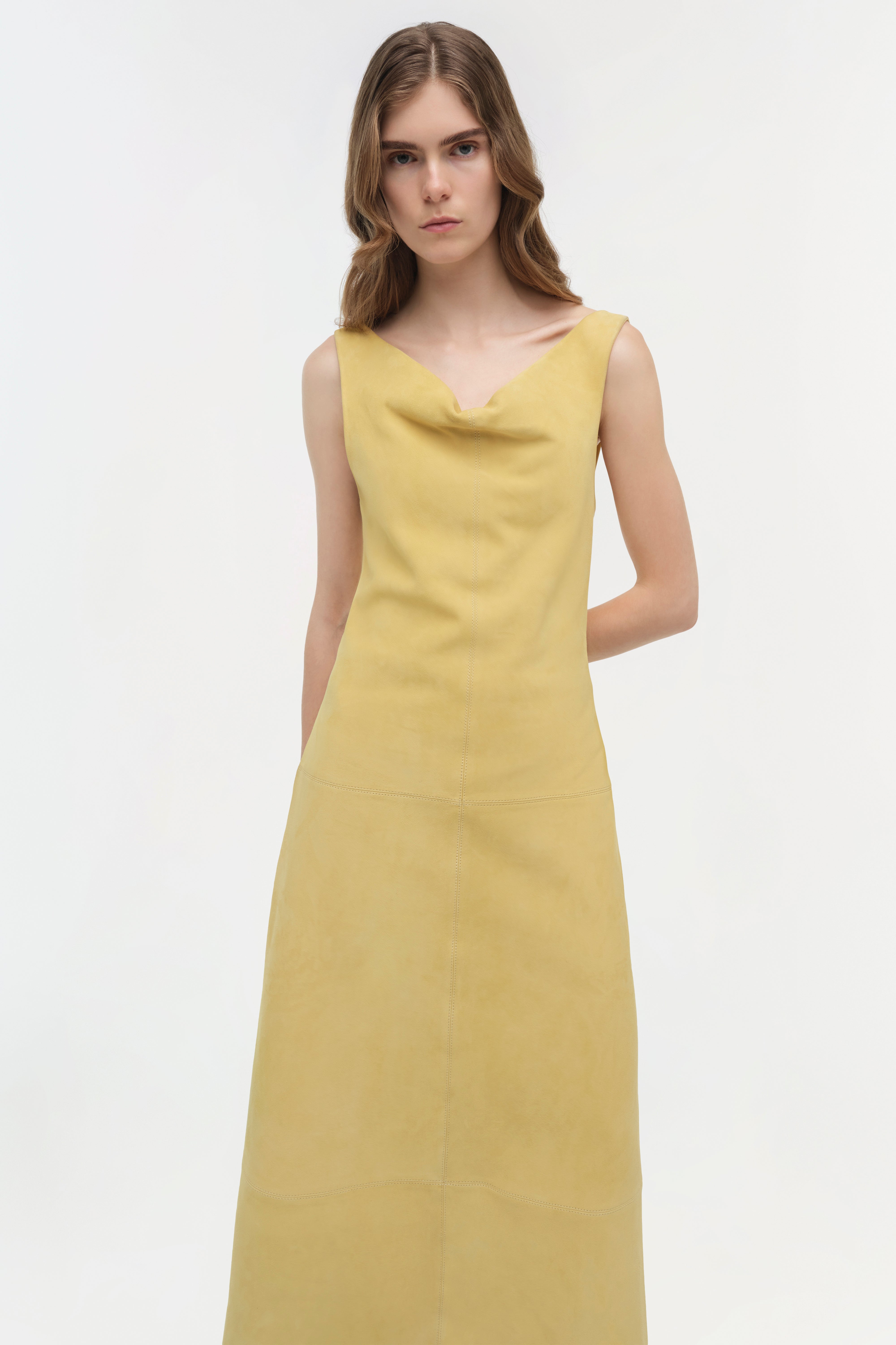 The Bridger Suede Halter Midi Dress in Buttercream. This midi dress is cut from suede and designed with a soft cowl neckline and a cinched waist, creating a subtly draped, flared silhouette.