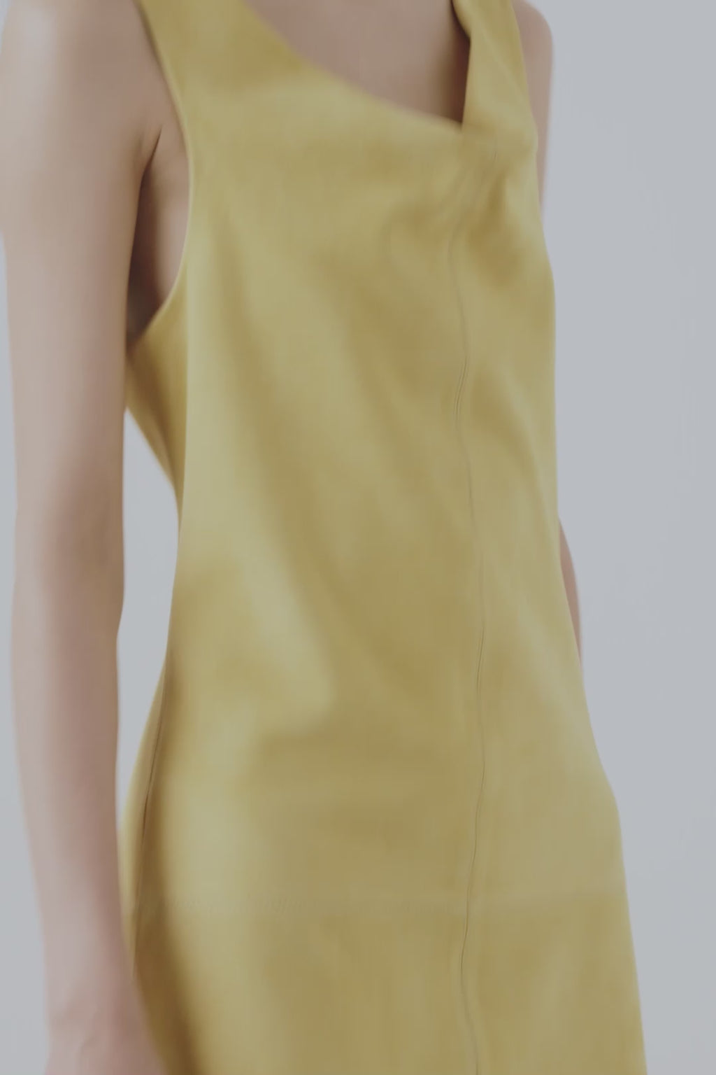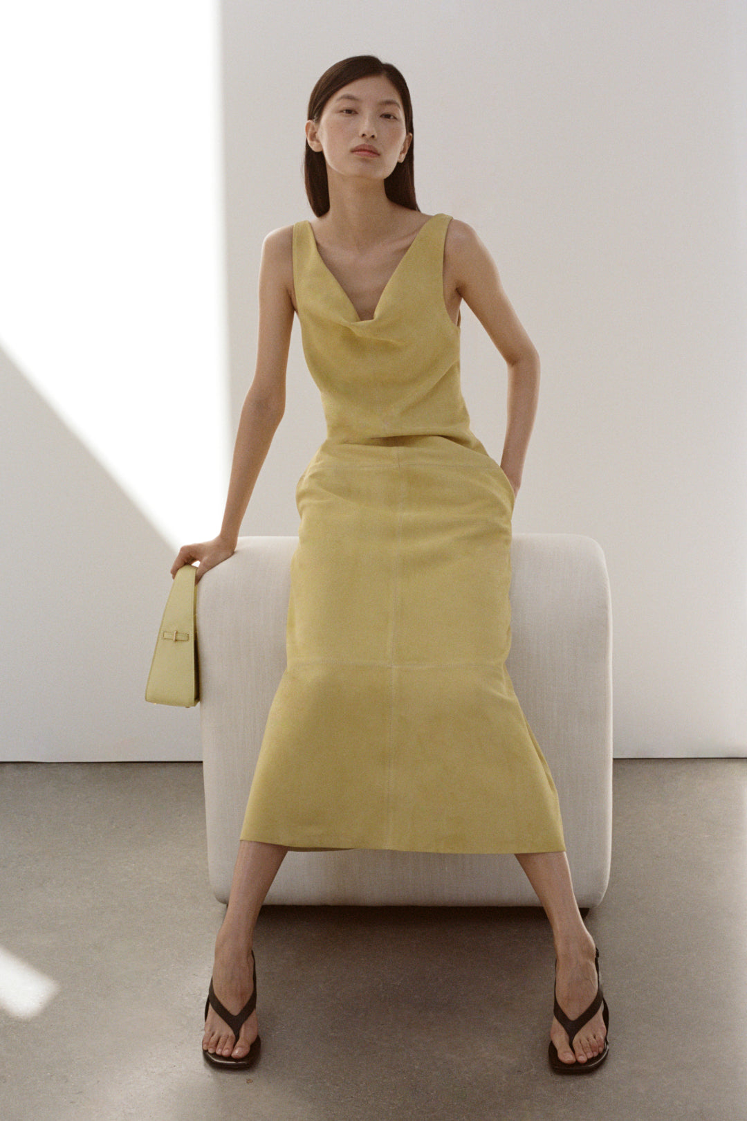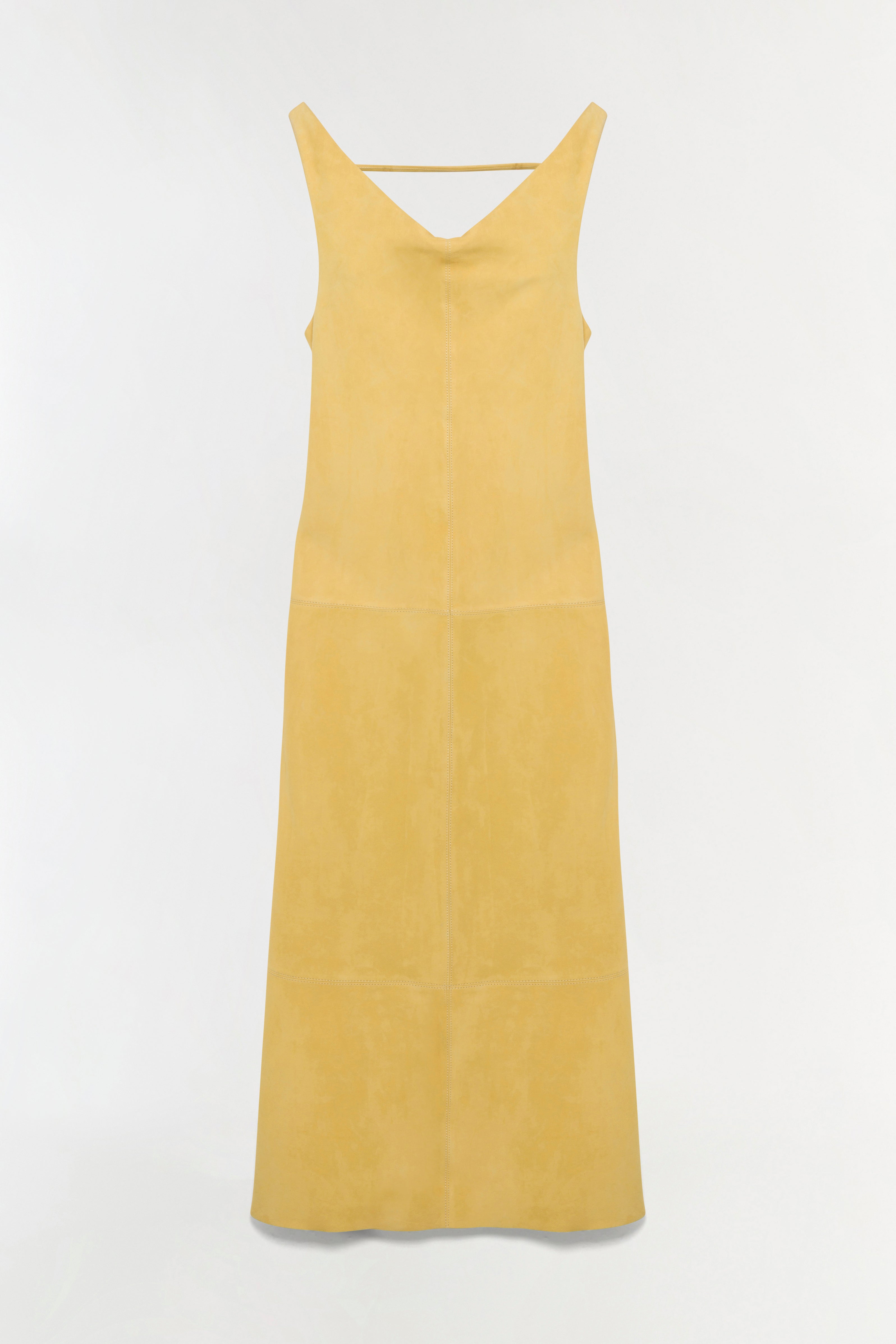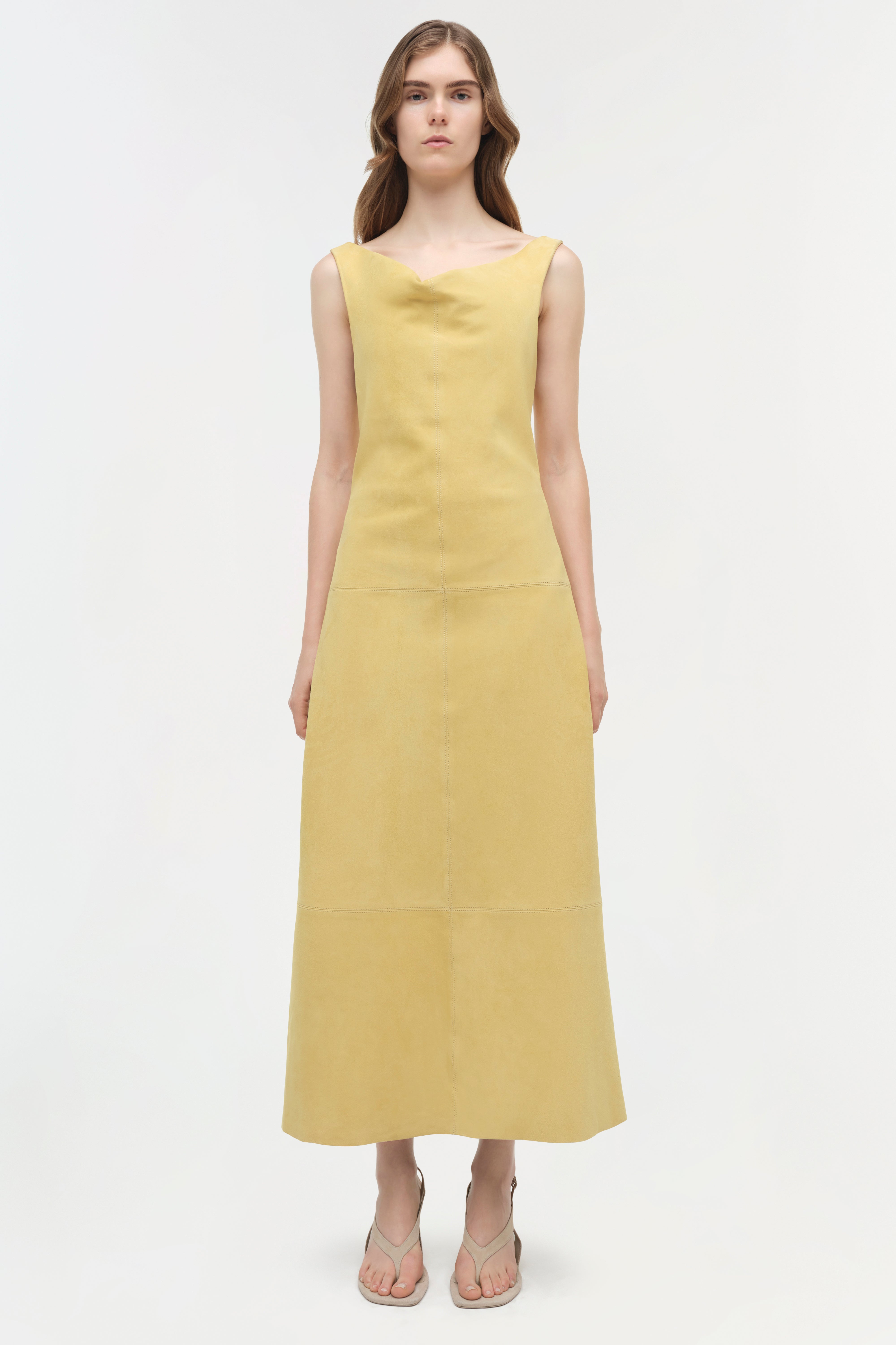 The Bridger Suede Halter Midi Dress in Buttercream. This midi dress is cut from suede and designed with a soft cowl neckline and a cinched waist, creating a subtly draped, flared silhouette.