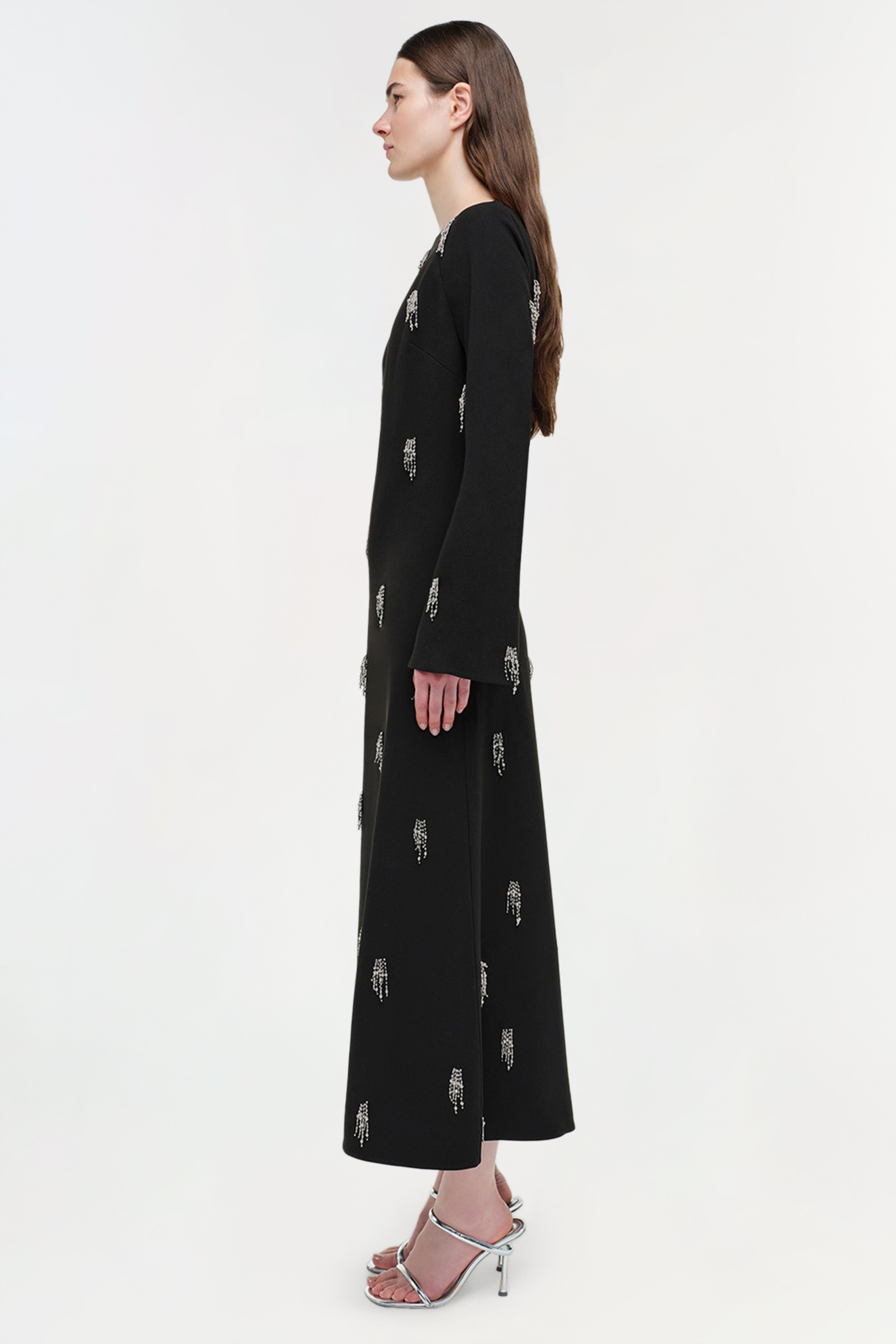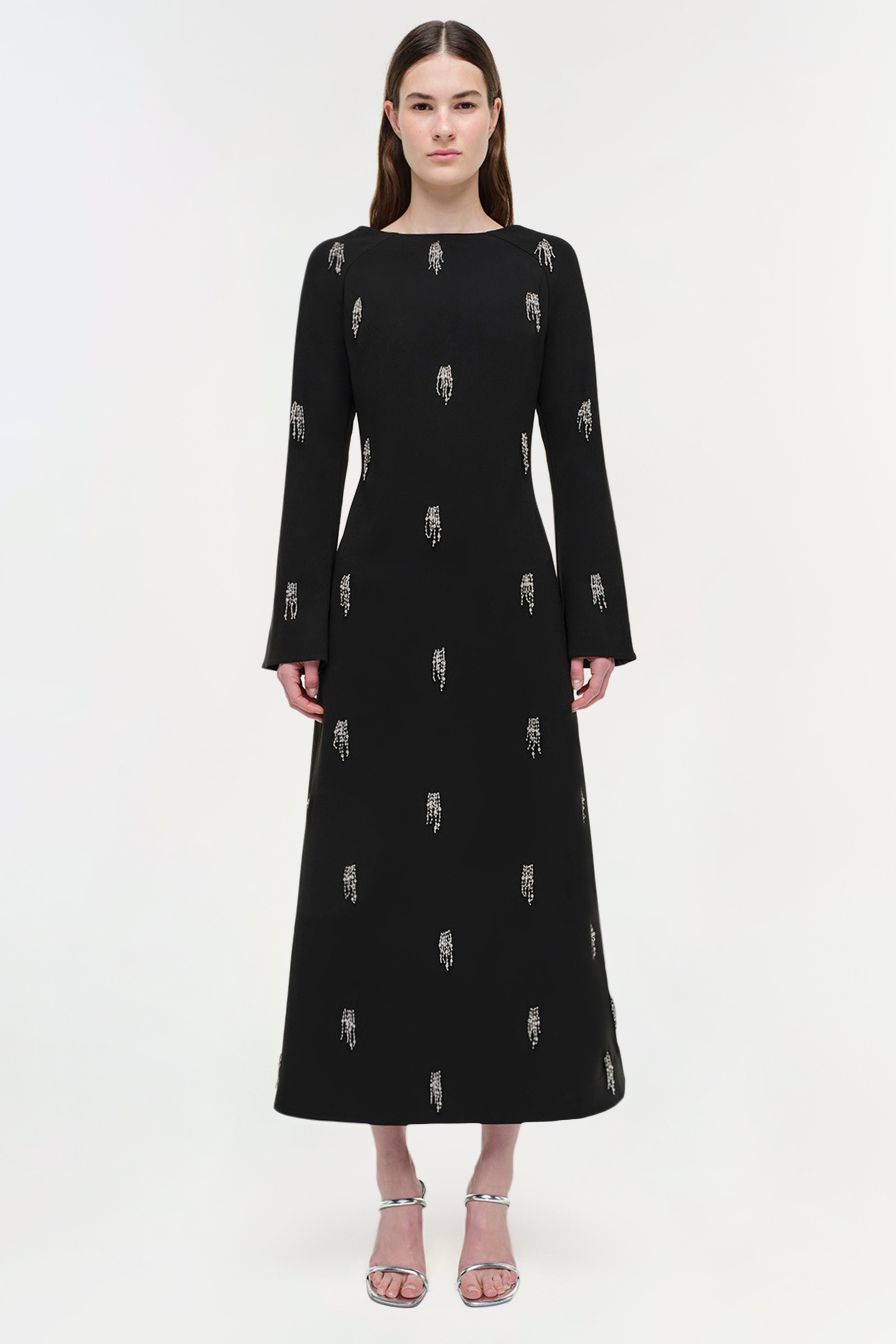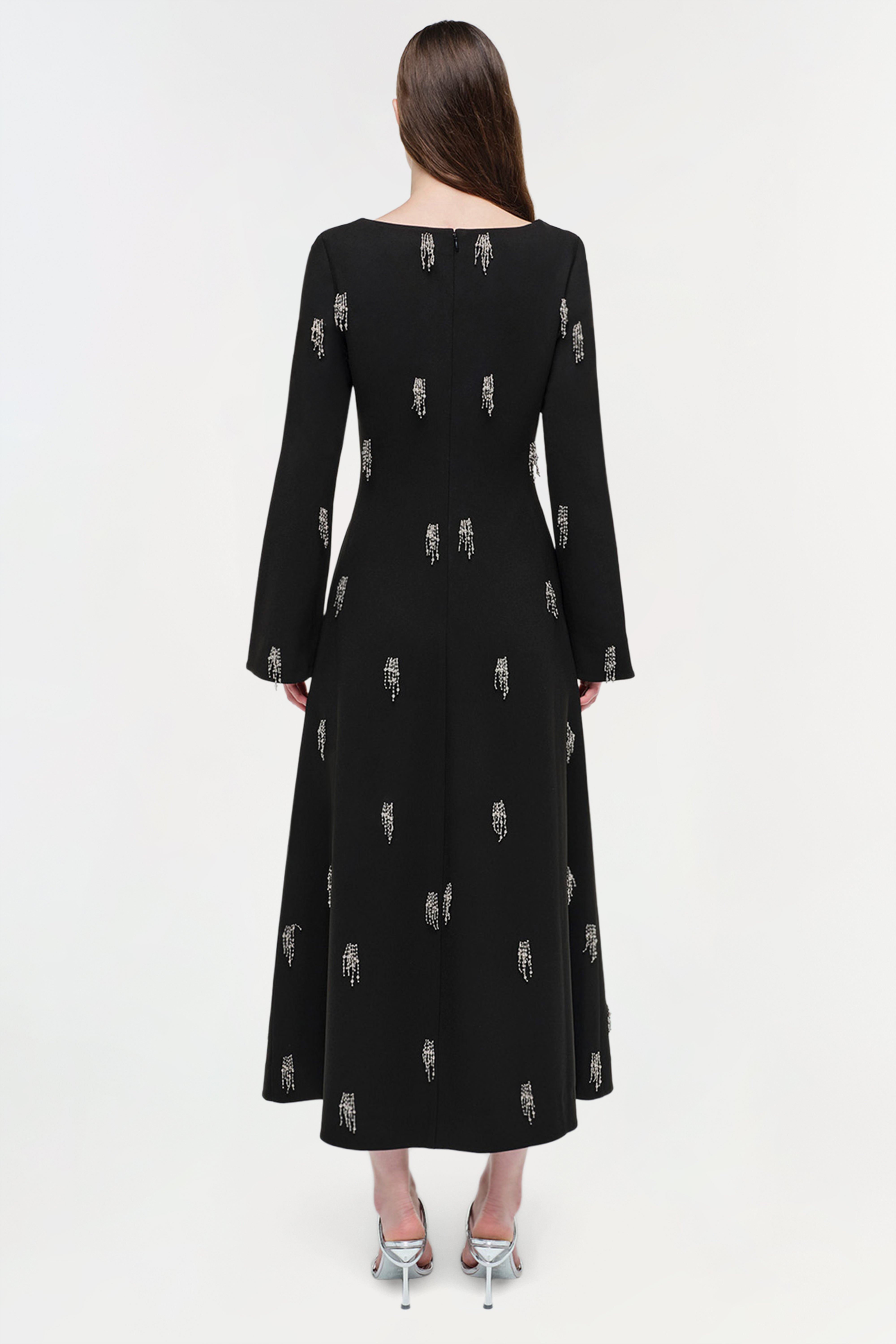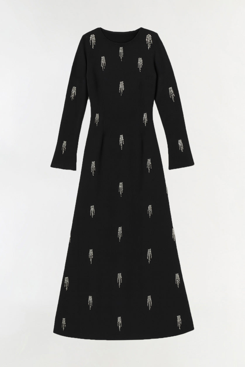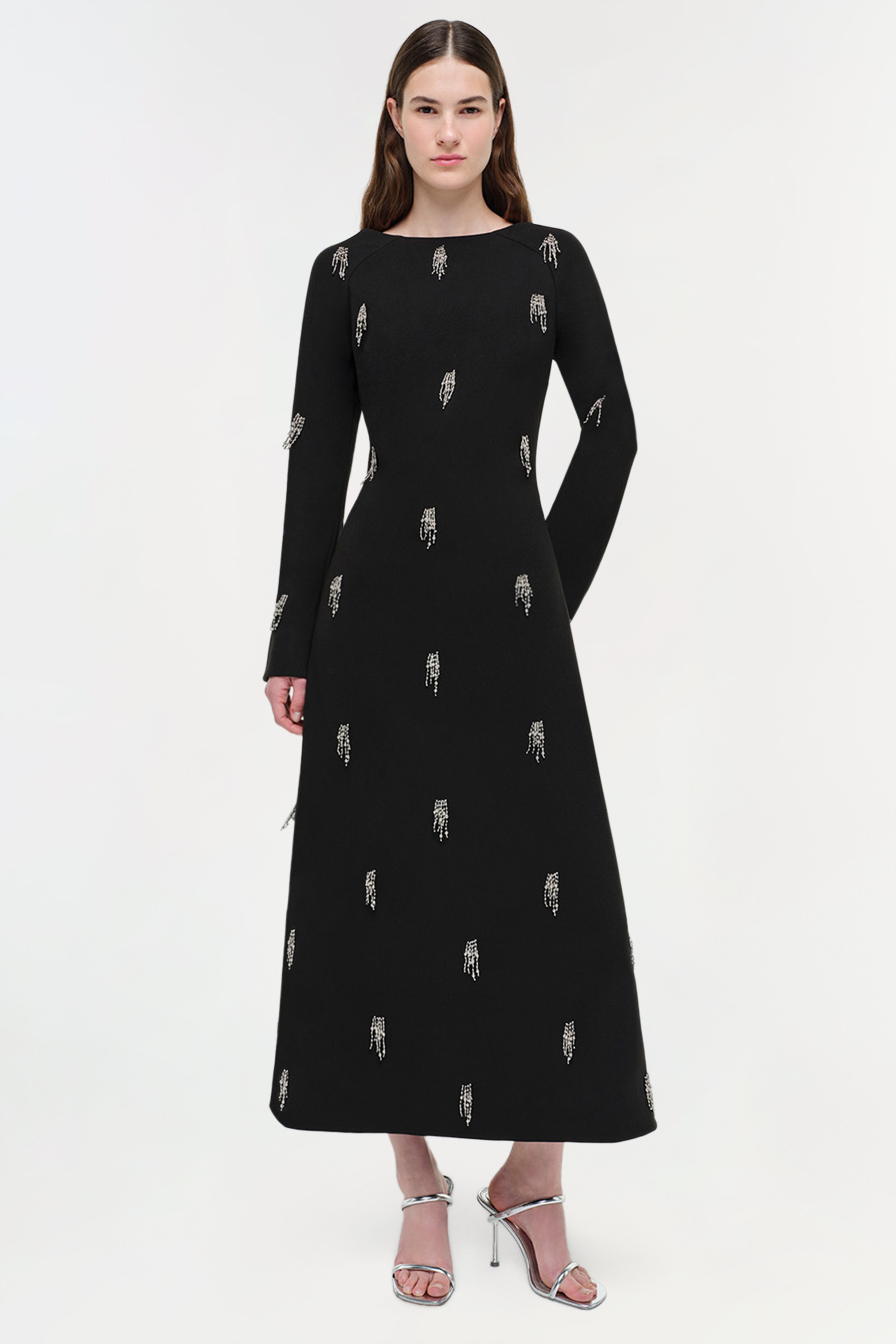 A long-sleeved midi dress in crepe, punctuated with scattered beaded fringe that shimmers with every movement. The streamlined cut serves as a canvas for its hand-applied ornamentation, balancing simplicity with radiance.