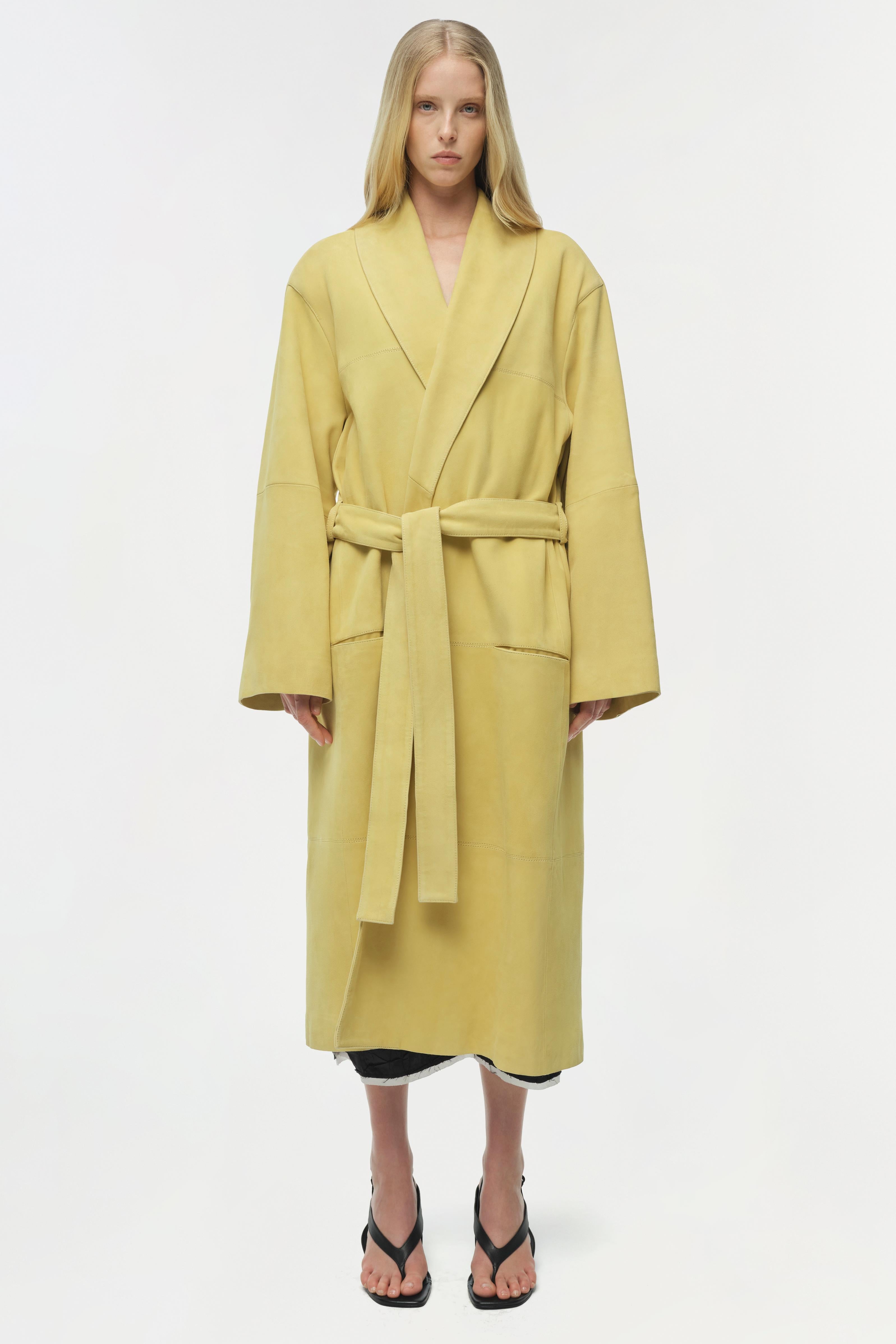 The Enola Suede Trench Coat in Buttercream. Cut from suede, this oversized trench coat features exaggerated lapels and a softly draped silhouette. Plush, relaxed lines blend effortless ease with elegance.