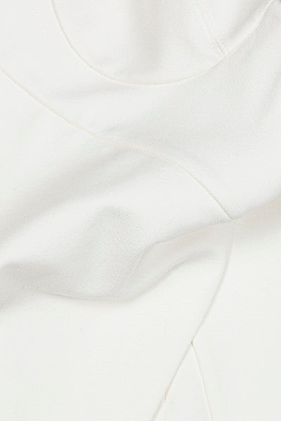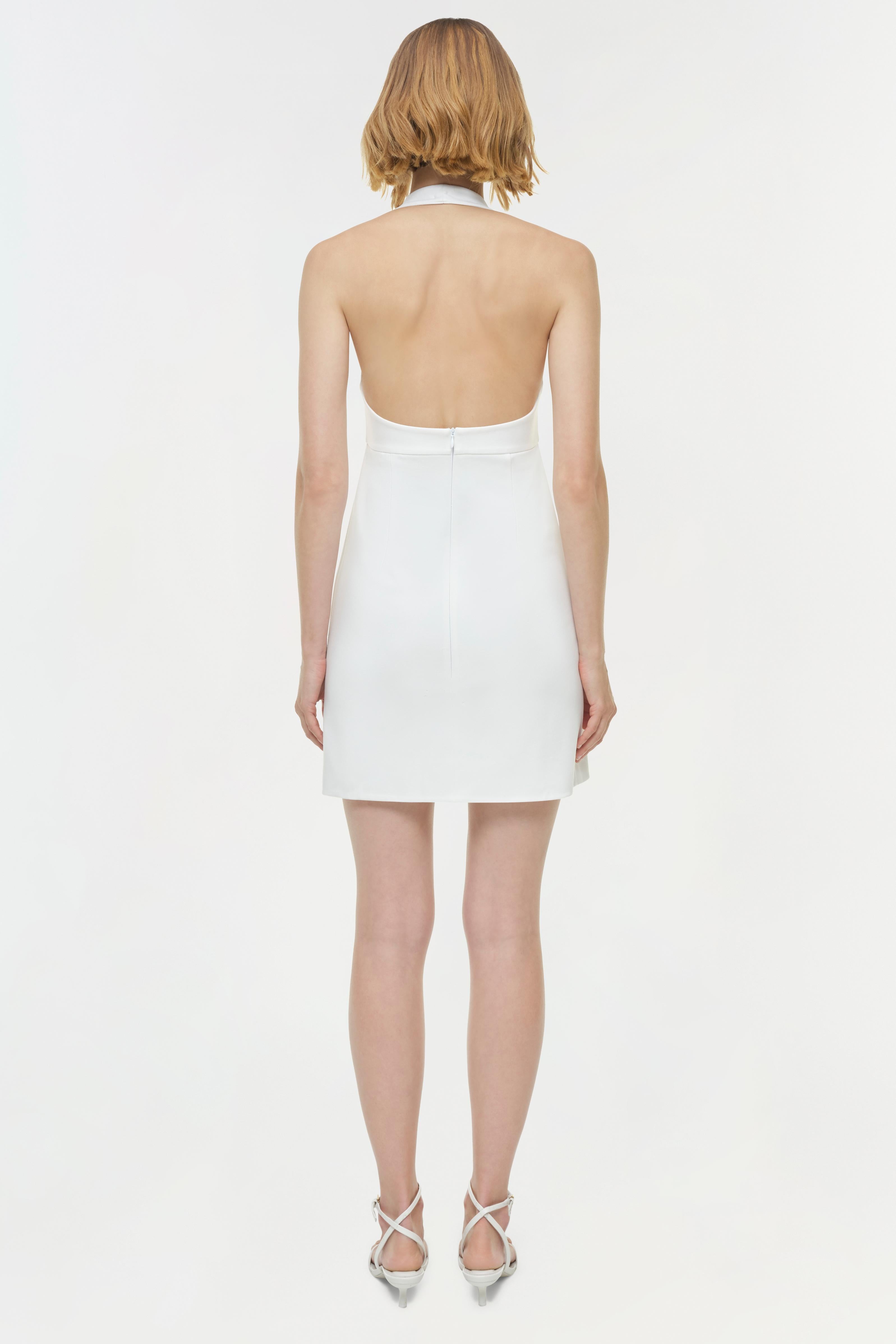 The Noemi Sculpted Scuba Mini Dress in White. This halter mini dress features a softly contoured bodice and sweetheart halter neckline. The mini-length skirt has an overlay, lending ease of movement and a modern edge to the crisp, sculptural silhouette.