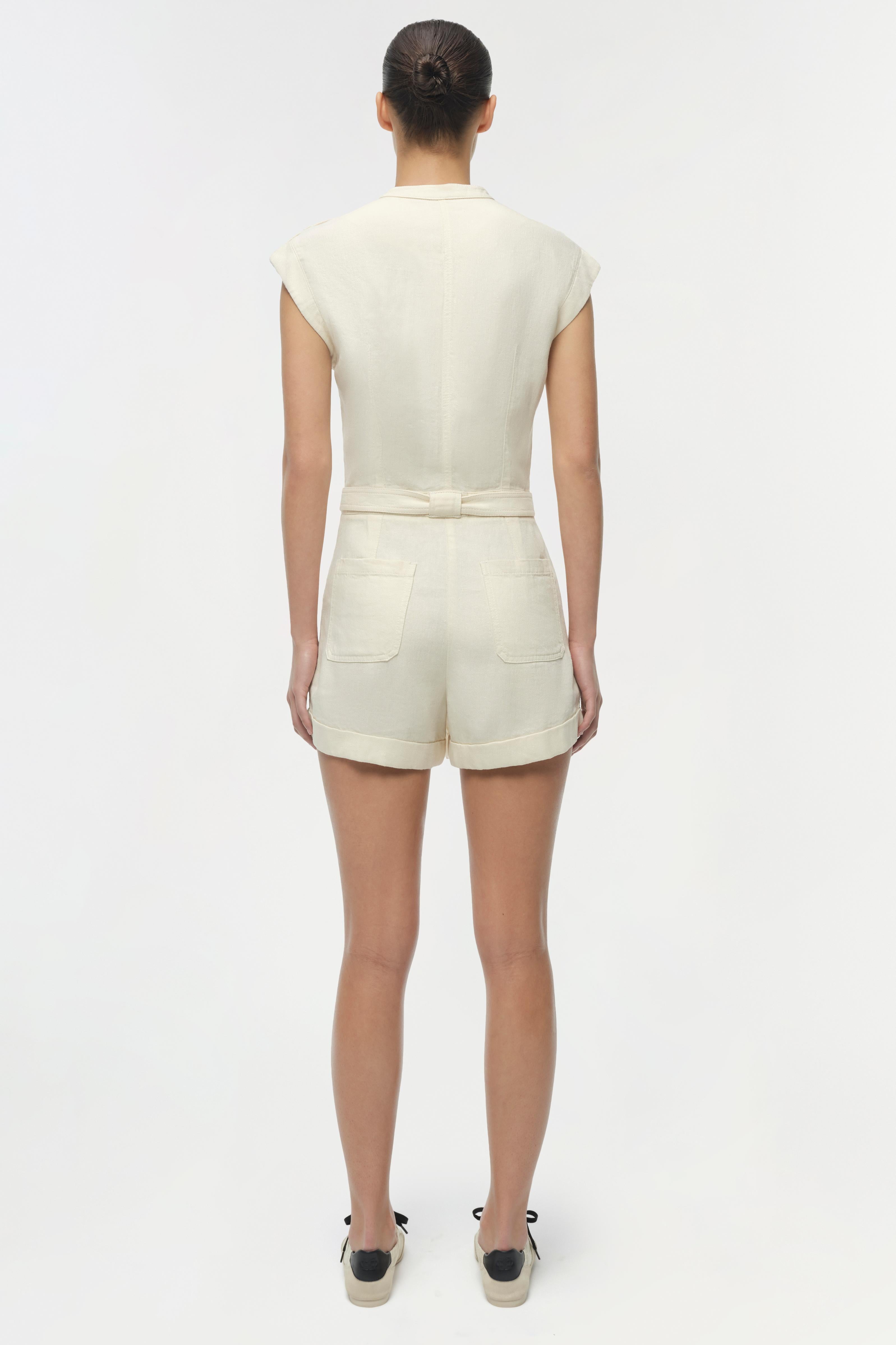 The Tinka Belted Linen Romper in Ecru. This romper is crafted from breathable linen with a soft, lived-in texture. Its tailored bodice and slouchy trouser-style shorts are cinched at the waist with a self-tie belt, balancing utilitarian ease with contemporary elegance.