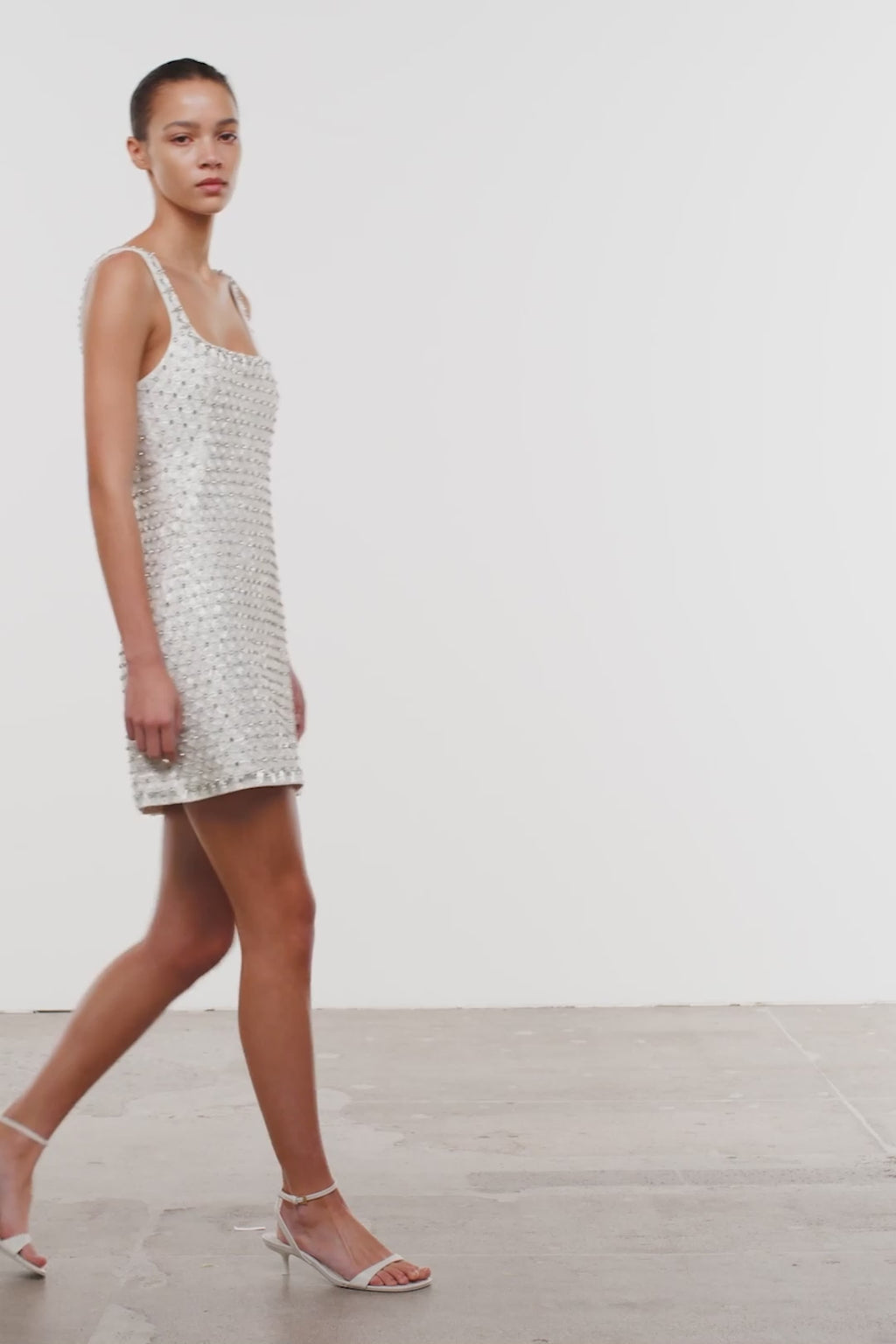 The Ziva Embellished Mini Dress in White. Crafted from embellished crepe, this sleeveless mini dress offers a sleek, structured fit with intricate detailing. Sculpted and radiant, it catches the light with every movement.