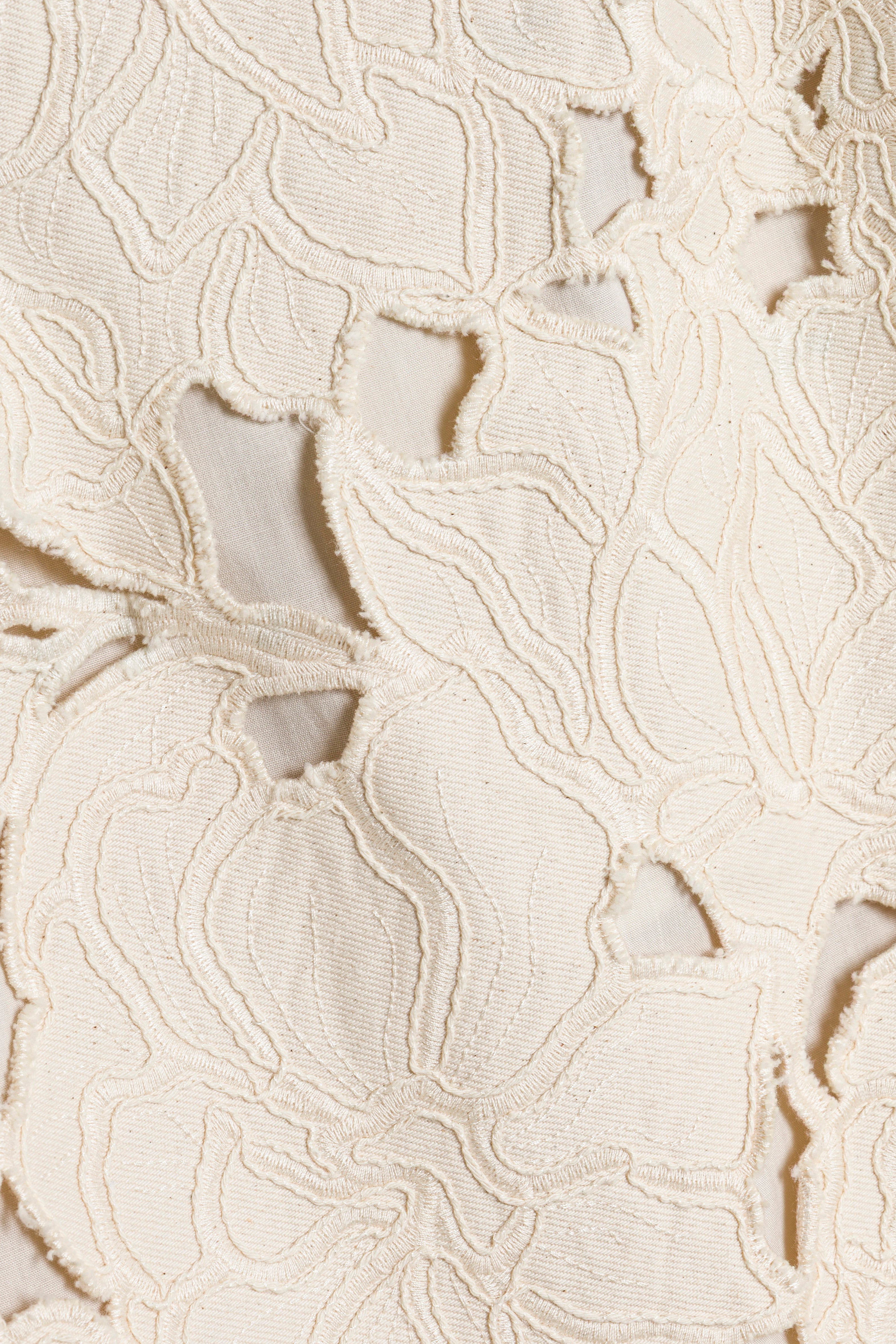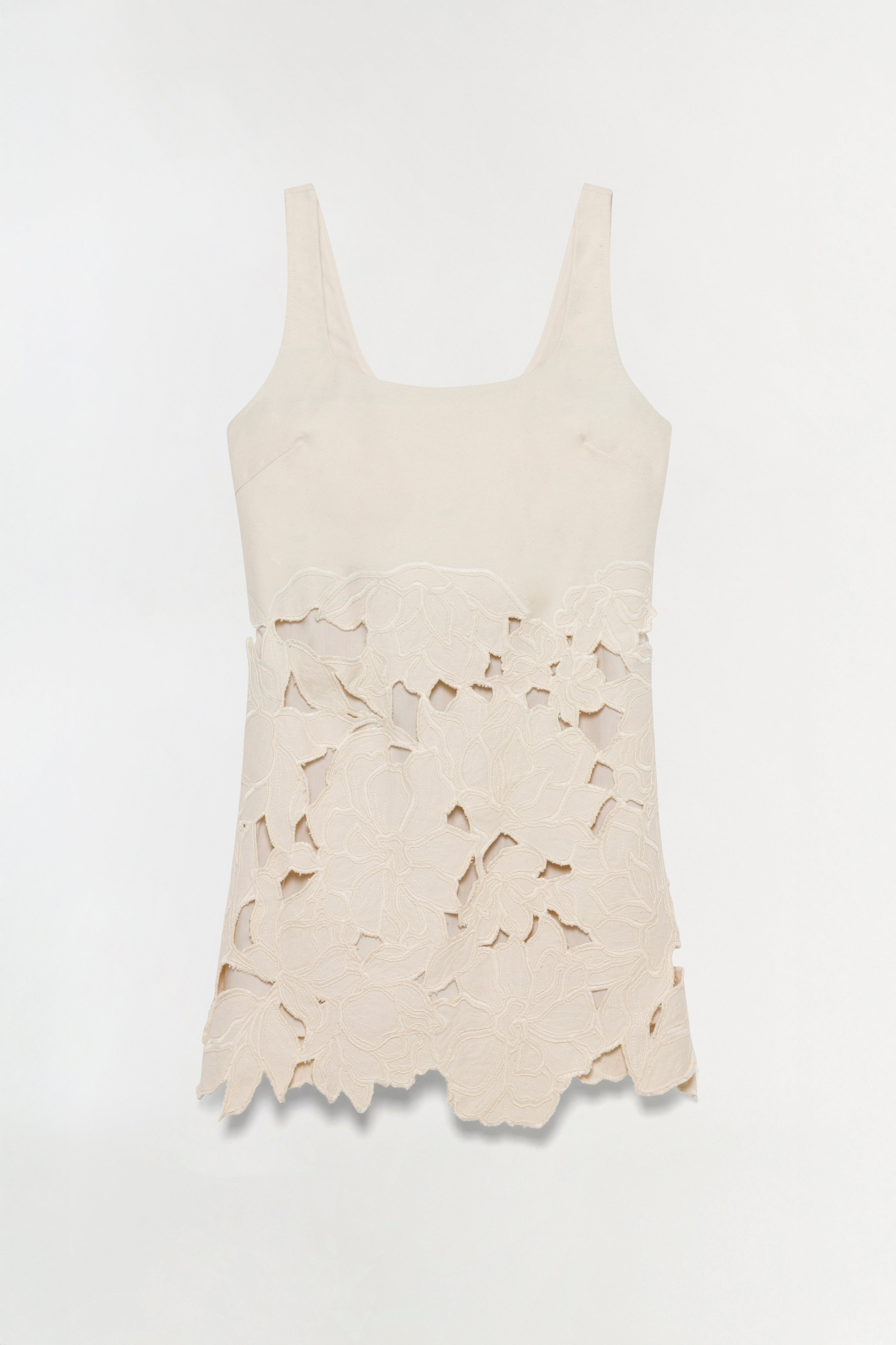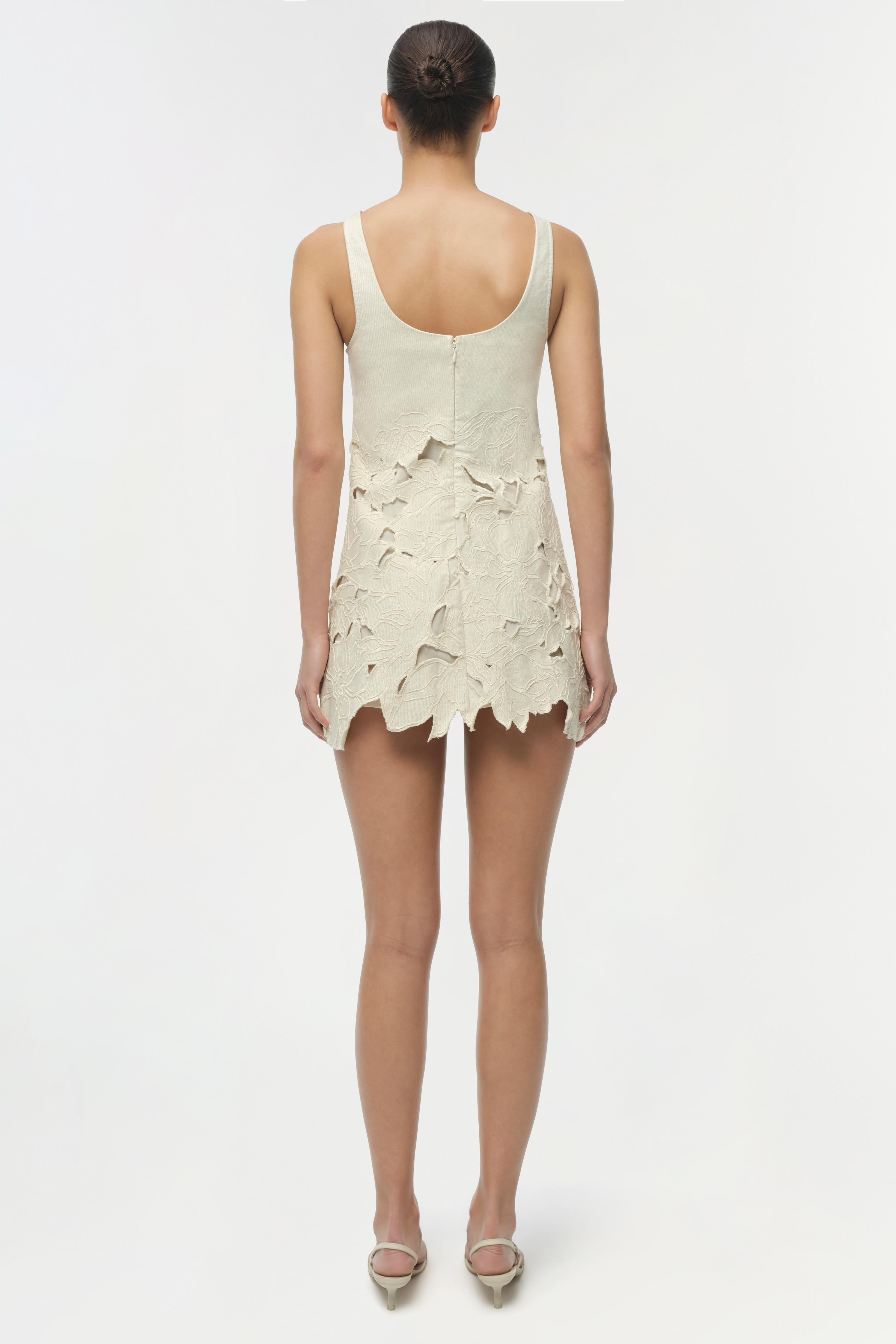 The Ziva Embroidered Mini Dress in Marshmallow. An embroidered mini dress cut from heavyweight cotton for a sculptural silhouette. Delicate straps and a cinched waist frame the body, while the raw-edged hem adds a subtly undone finish.