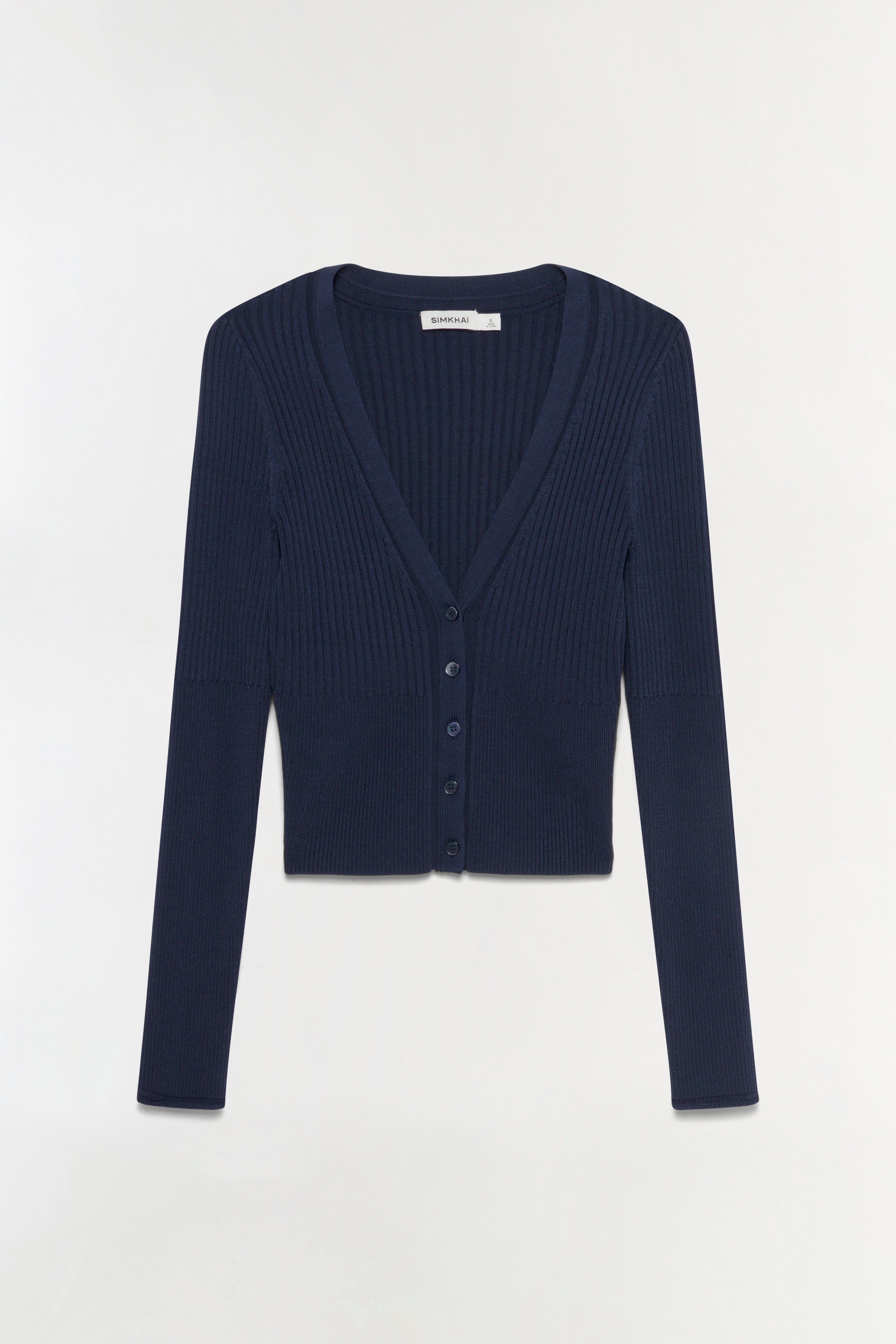 The Ailany Knit Cardigan in Midnight. Crafted in compact rib knit, this fitted shrunken cardigan features a streamlined silhouette with button-front detailing. Its cropped length makes it an ideal partner to high-waisted trousers, creating a harmonious balance between cozy and chic.