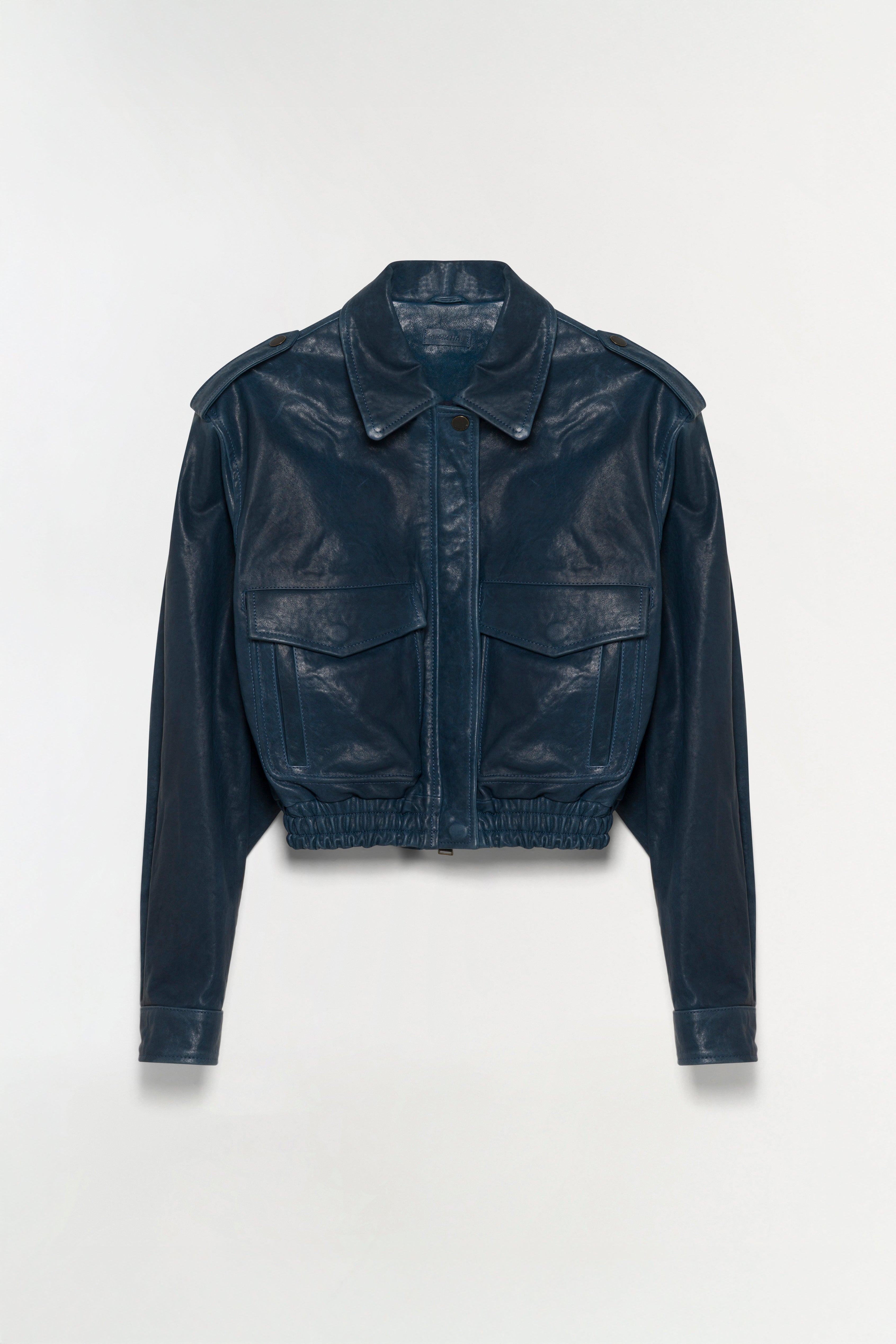 A cropped silhouette in supple leather. Defined by sharp shoulders, flap pockets and a gathered waistband that lends structure to the relaxed fit. Finished with subtle shoulder tabs and a front zip closure.