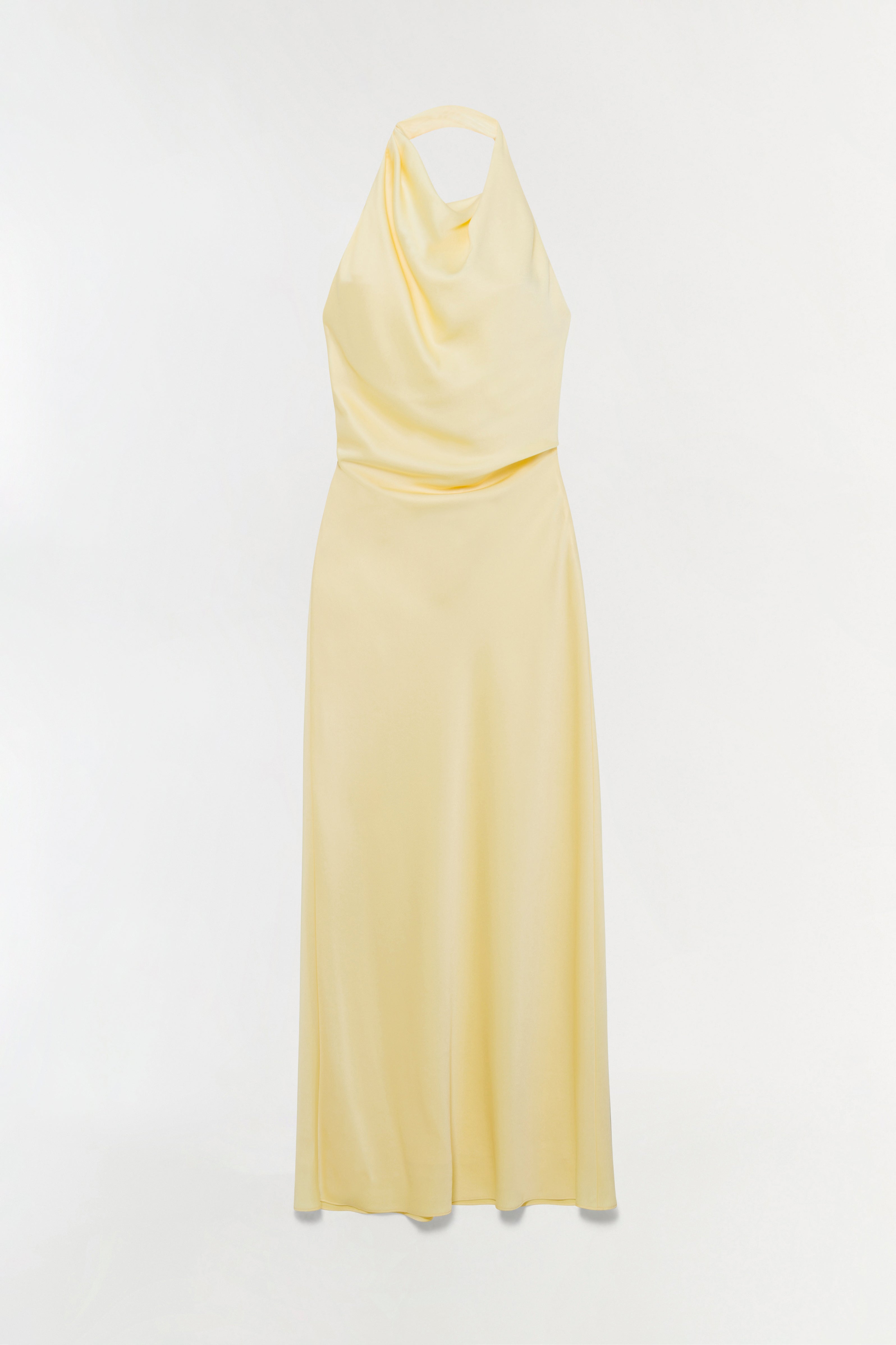 The Reannon Draped Satin Gown in Buttercream. Cut from fluid satin, this halter gown features a softly draped neckline and an open back with a slim strap detail. The bias-cut skirt falls into a straight, floor-length silhouette. Finished with a clean edge for a smooth, minimal finish.