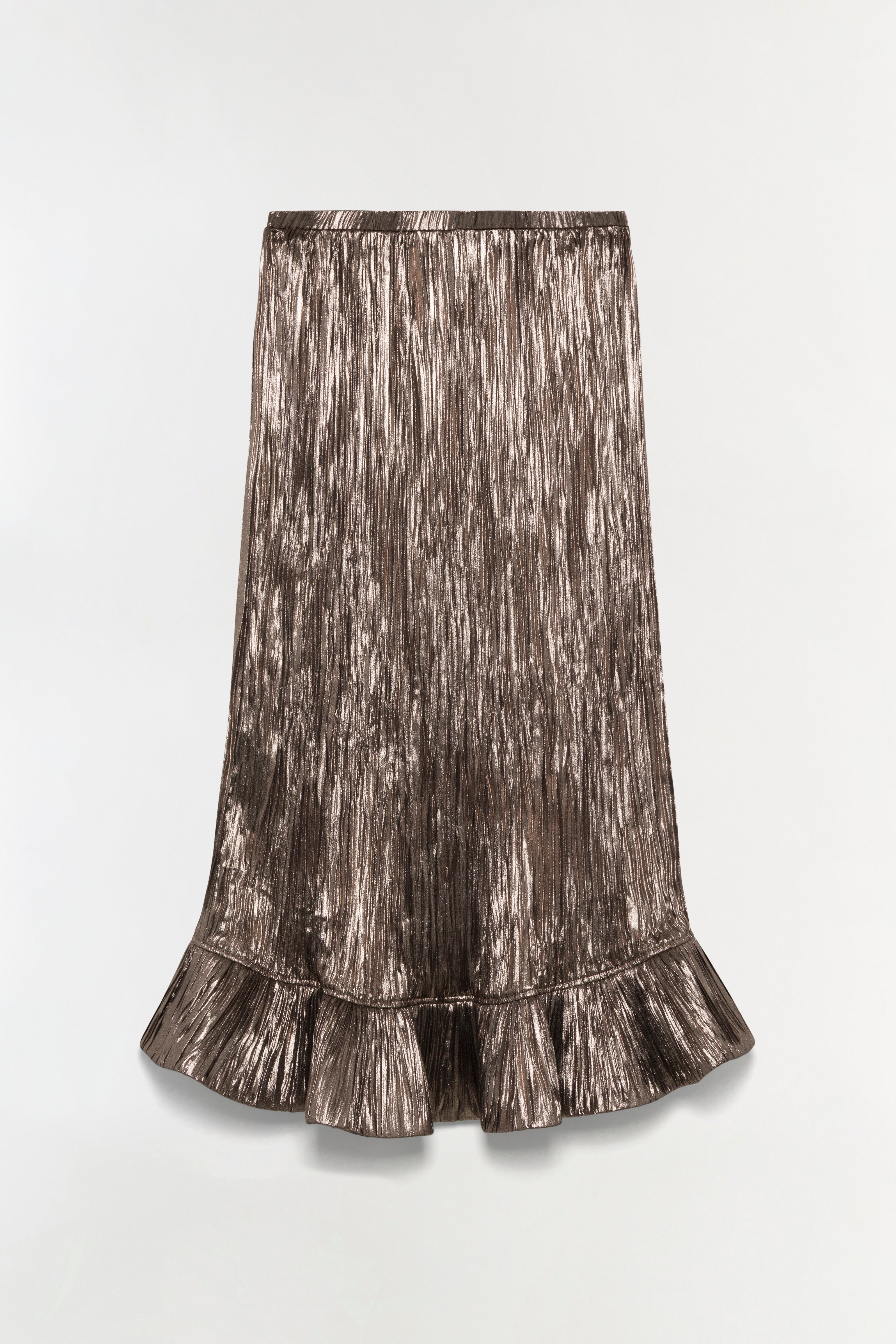 The Roan Metallic Plisse Midi Skirt in Bronze
