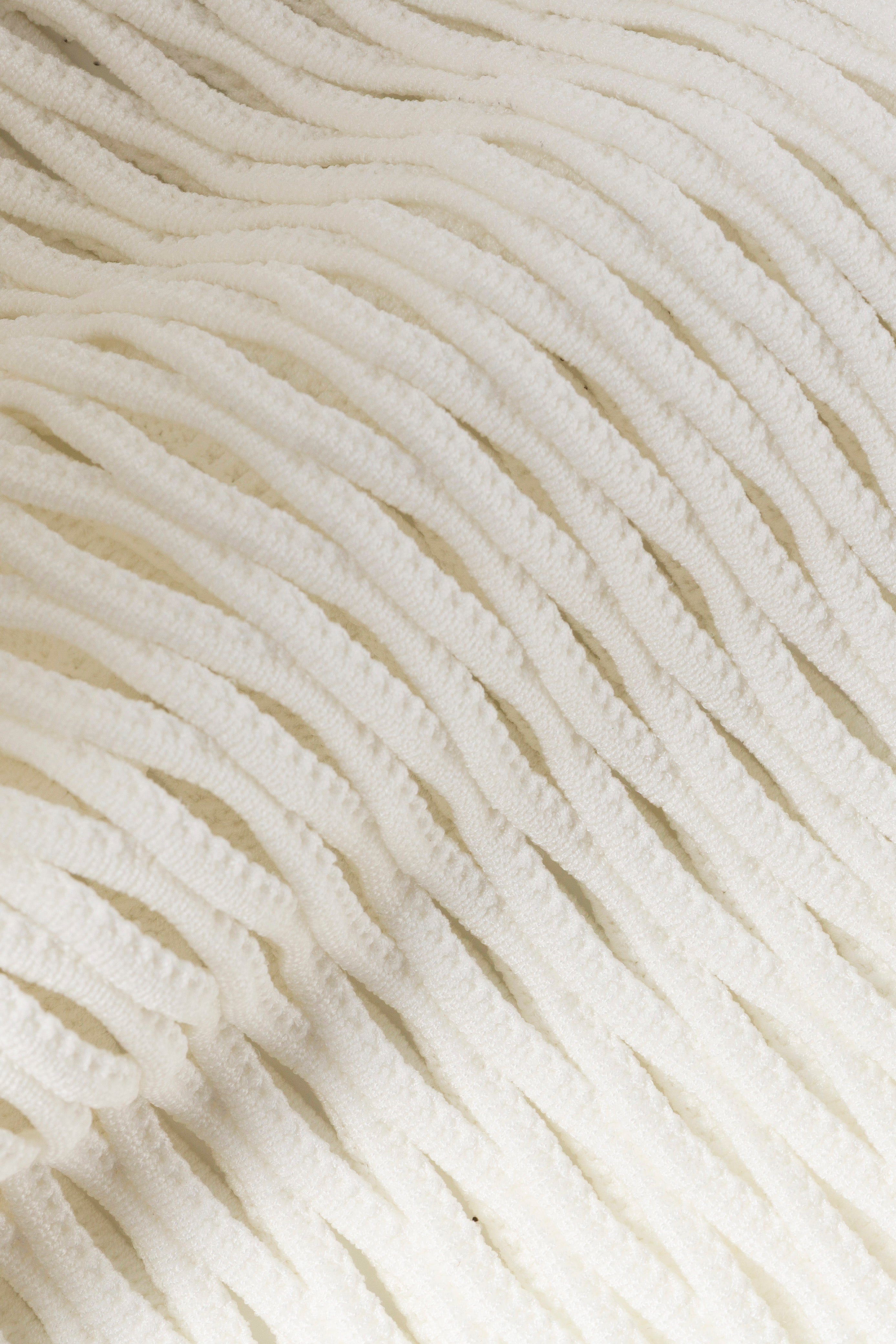 The Aldridge Knit Midi Skirt in Ivory. Crafted in an open weave knit construction, this skirt is designed with a straight silhouette and finished with a fringed hem, adding movement and textural depth to the design.