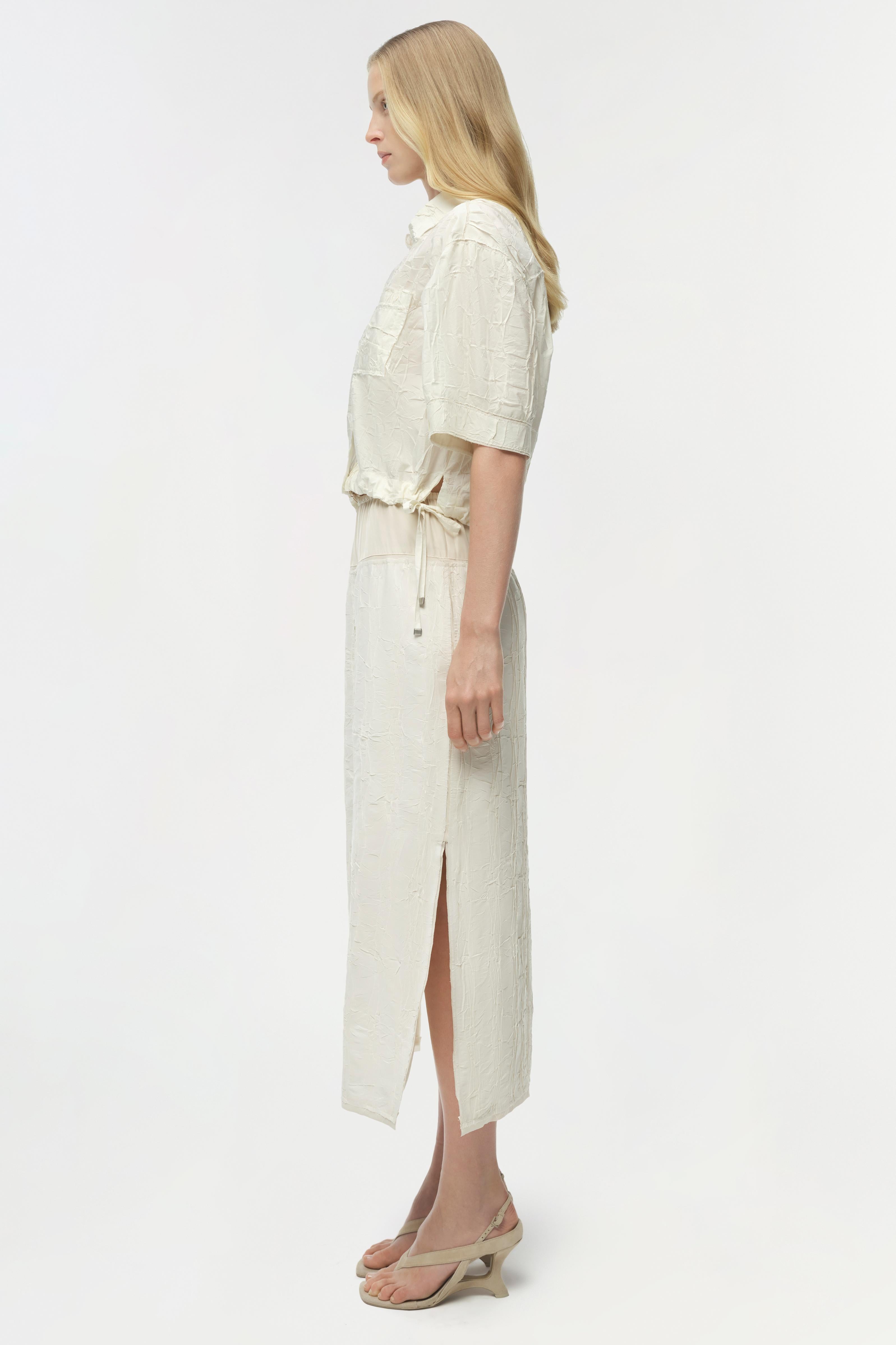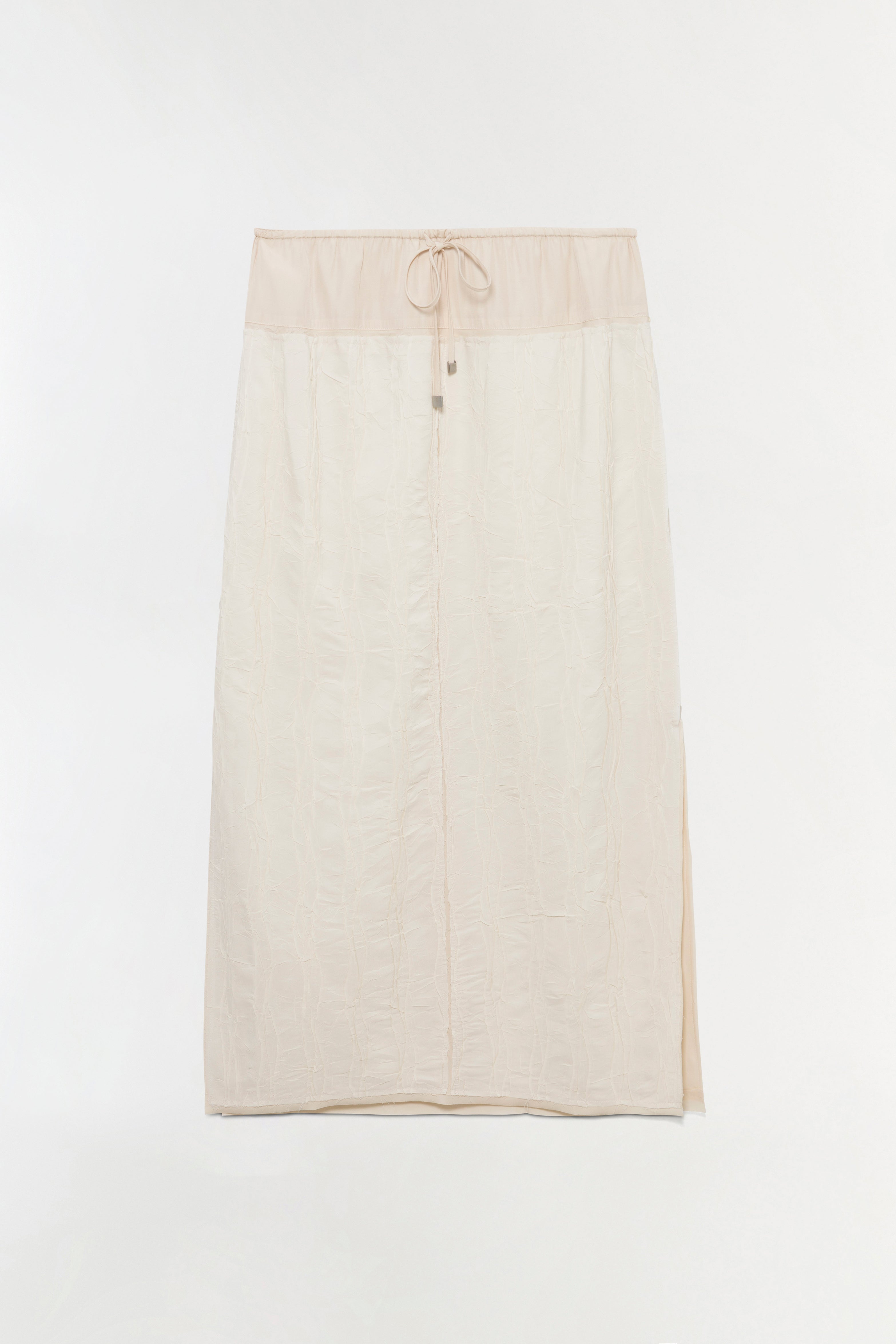The Huxen Midi Skirt in White Multi. Relaxed yet refined, this midi skirt is cut from a wave texture cotton-blend with a fluid drape. Sitting just above the waist, its drawstring fastening defines the silhouette while maintaining effortless, modern ease. Pair it with the Ryland Camp Shirt in White Multi to complete the look.