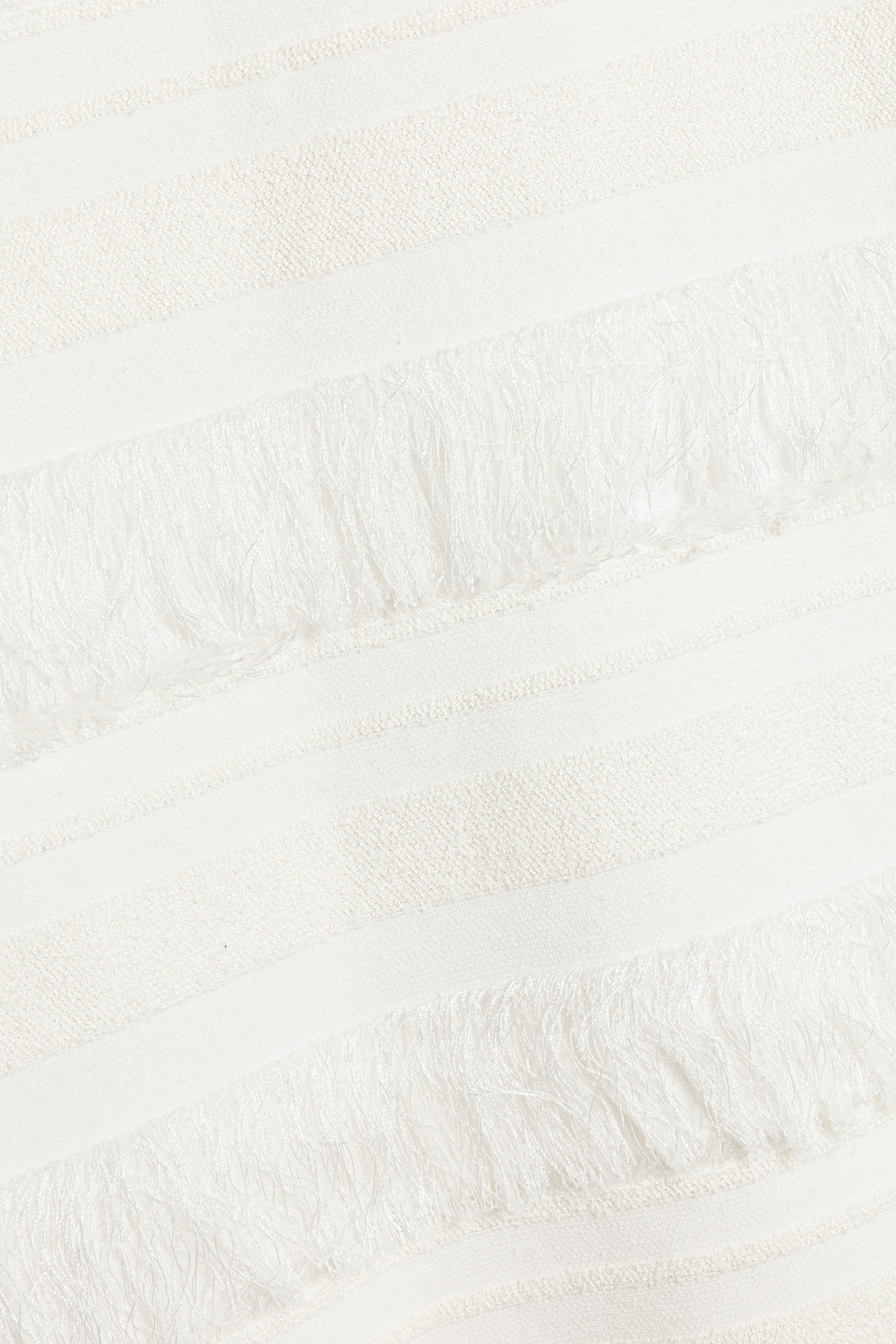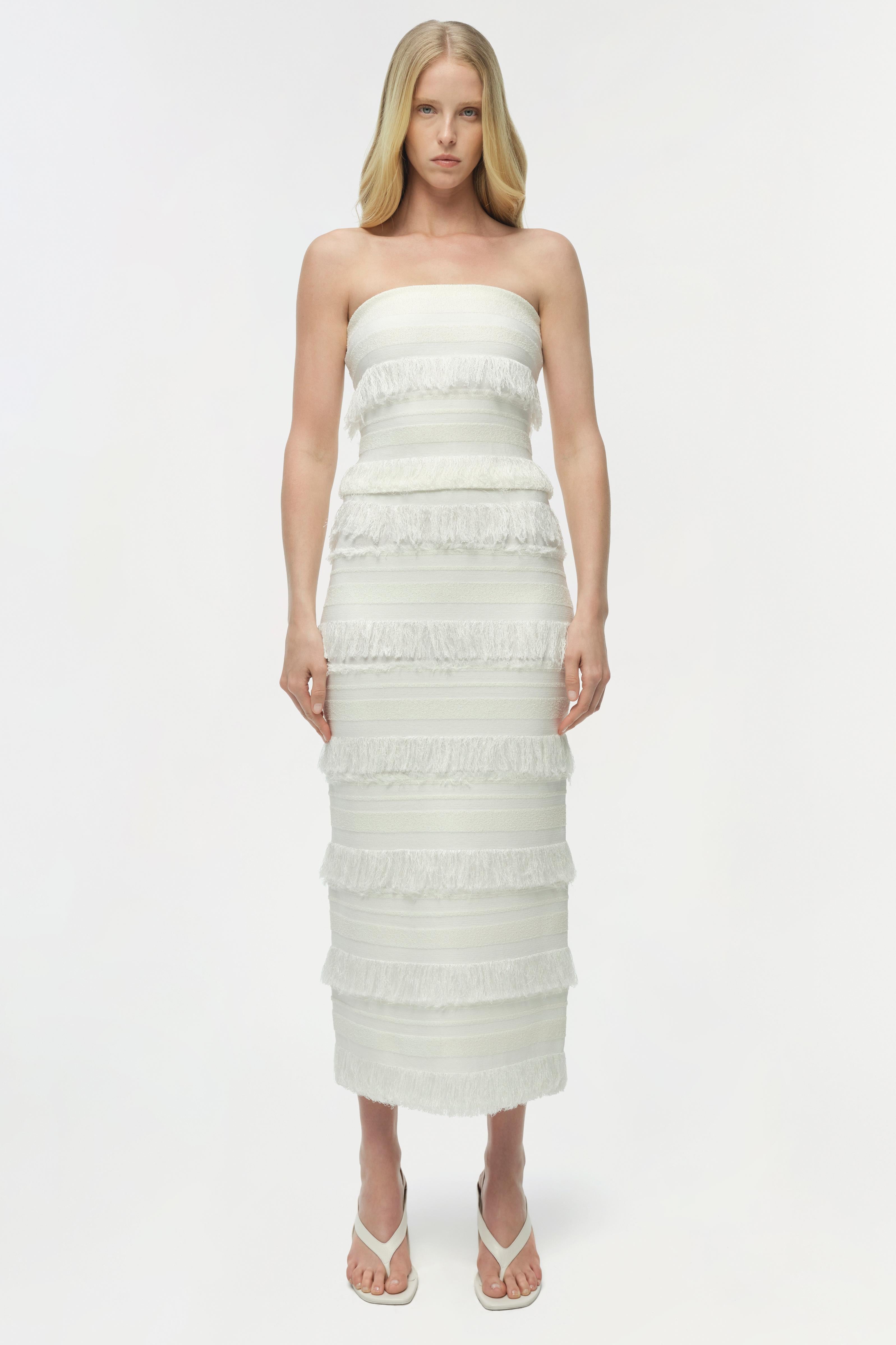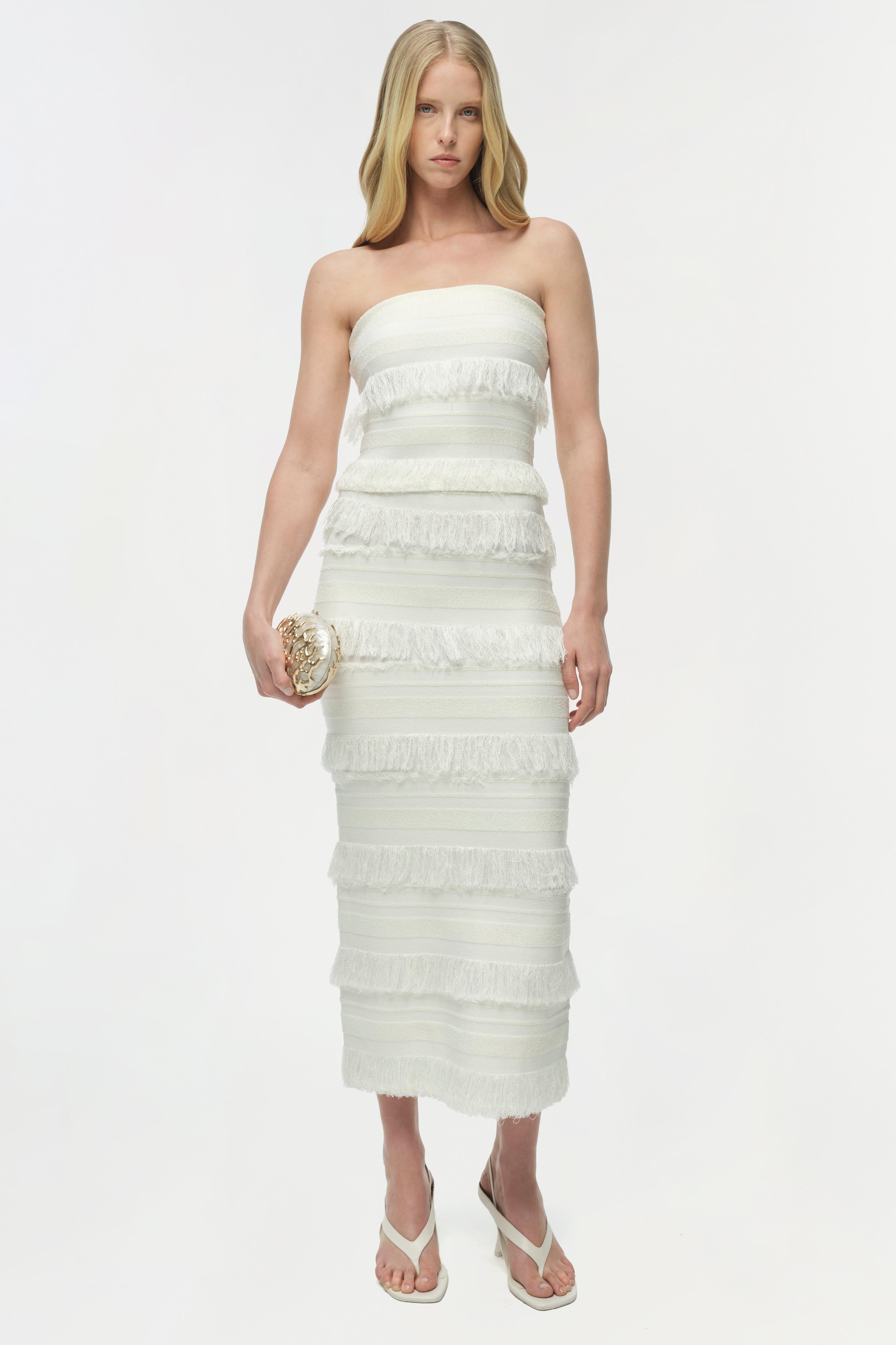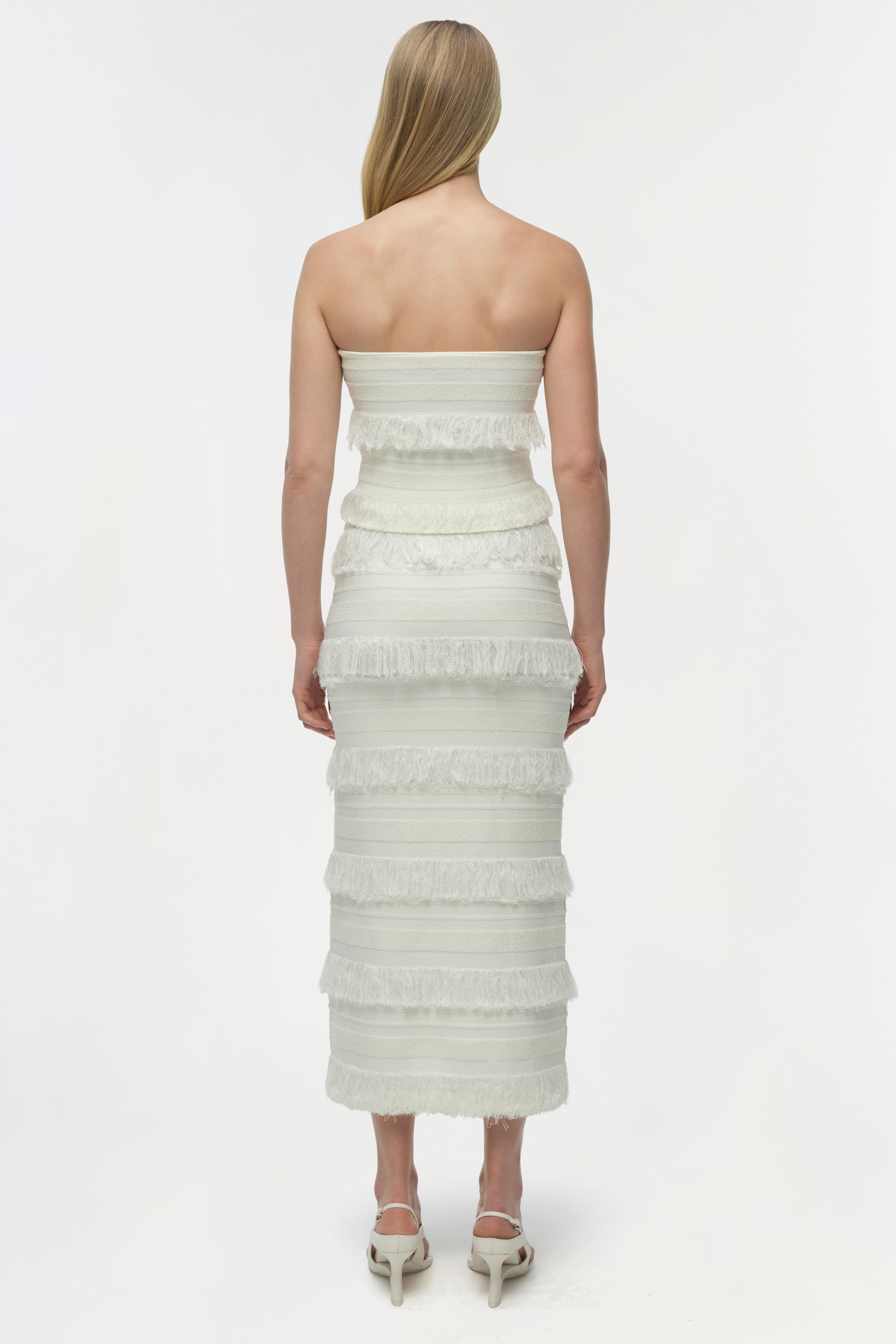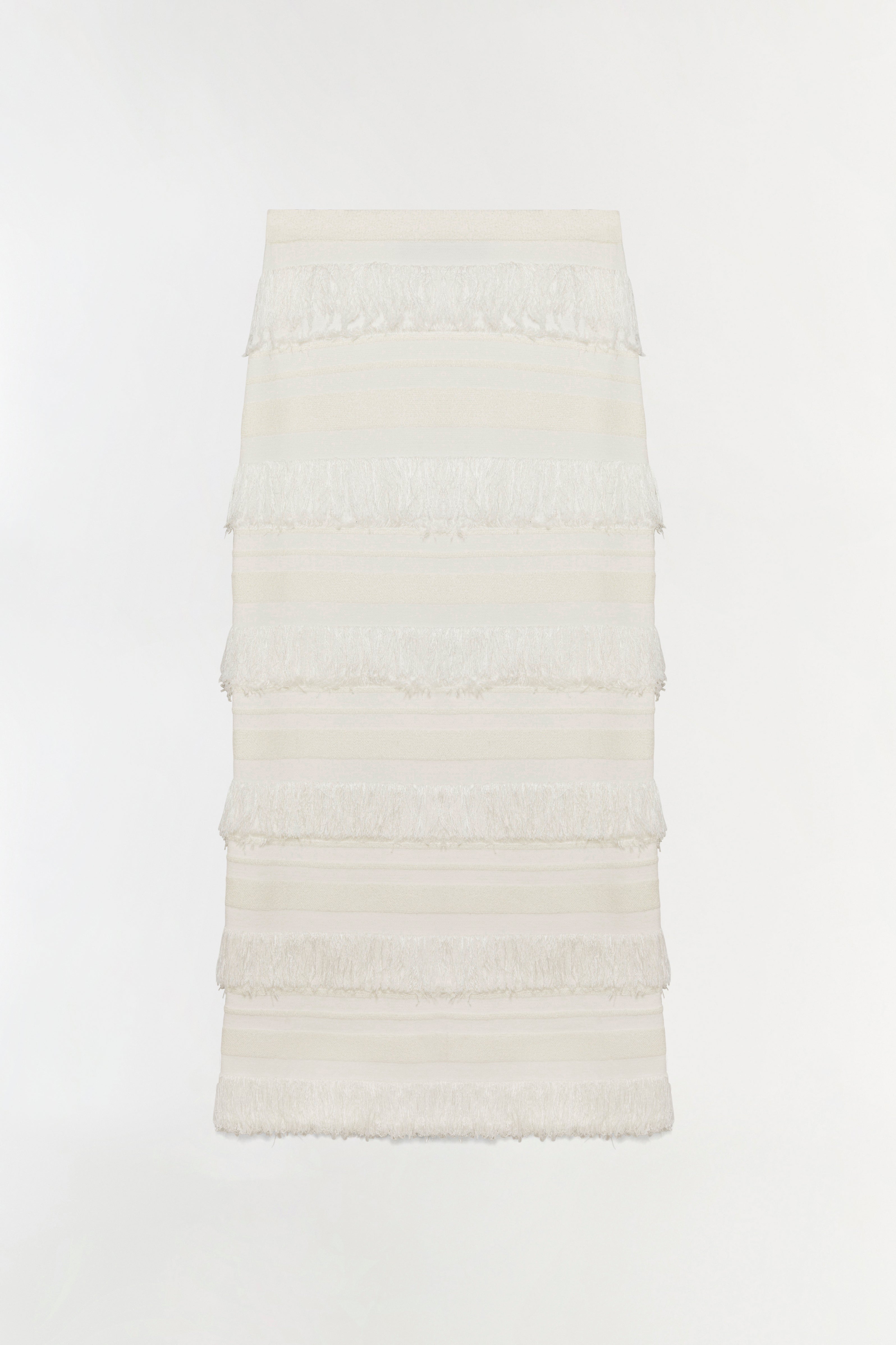 The Lula Knit Midi Skirt in Ivory Stripe. A midi skirt knit with horizontal striping and tonal fringe accents sits natural at the waist with an elongated silhouette. Pair it with the Cairo Knit Tube Top in Solar Stripe to complete the look.