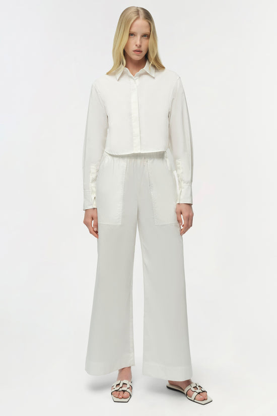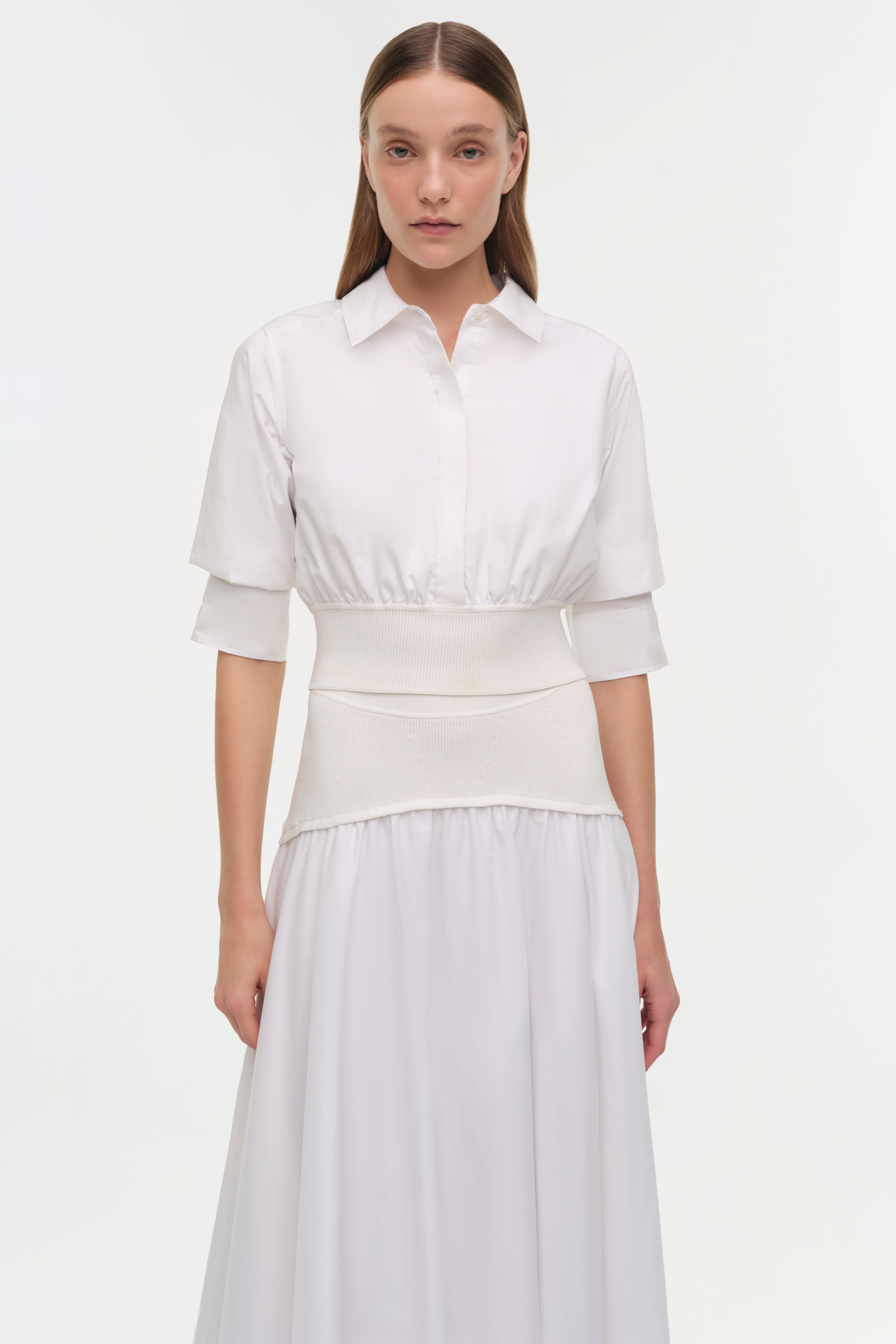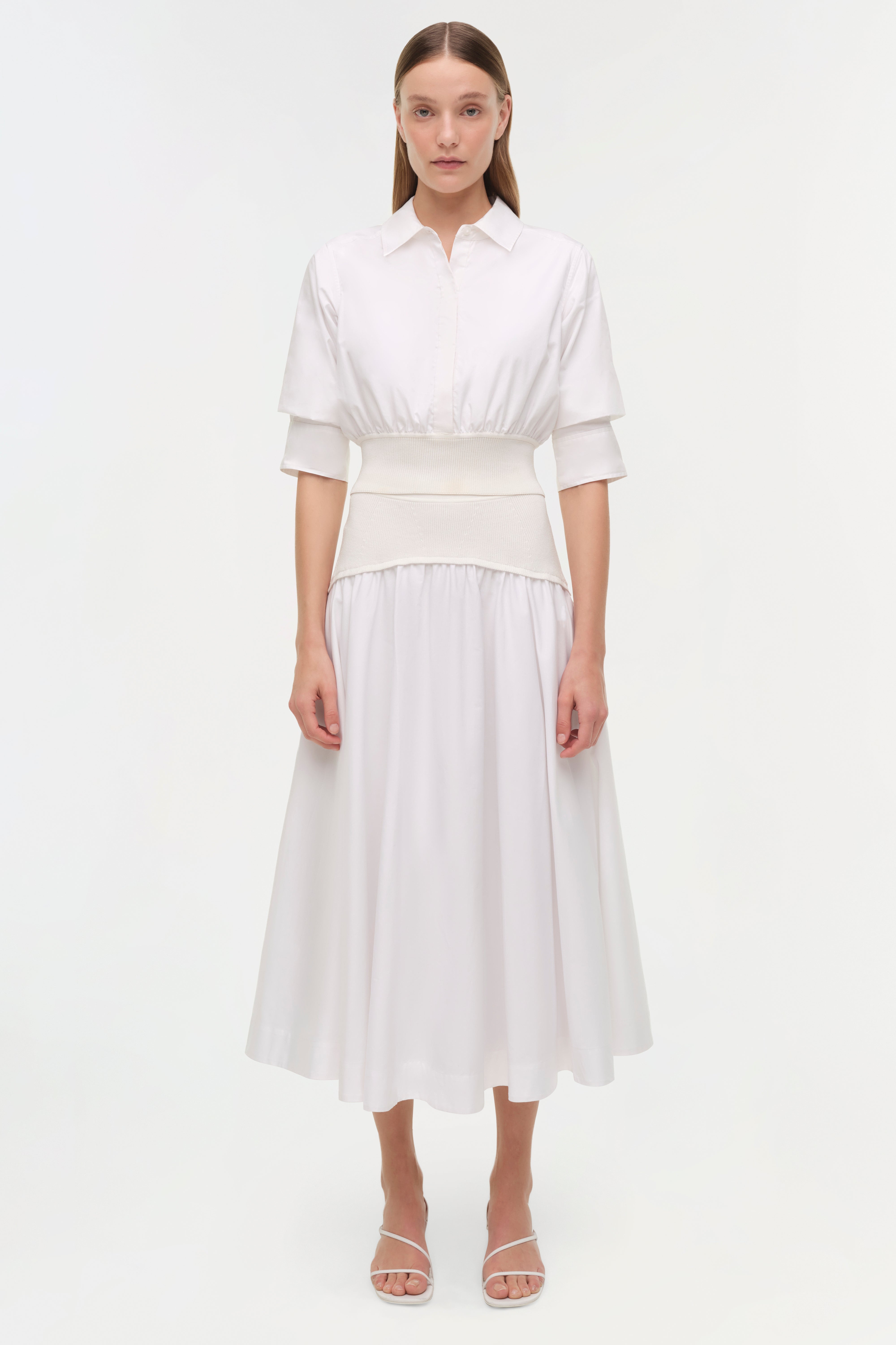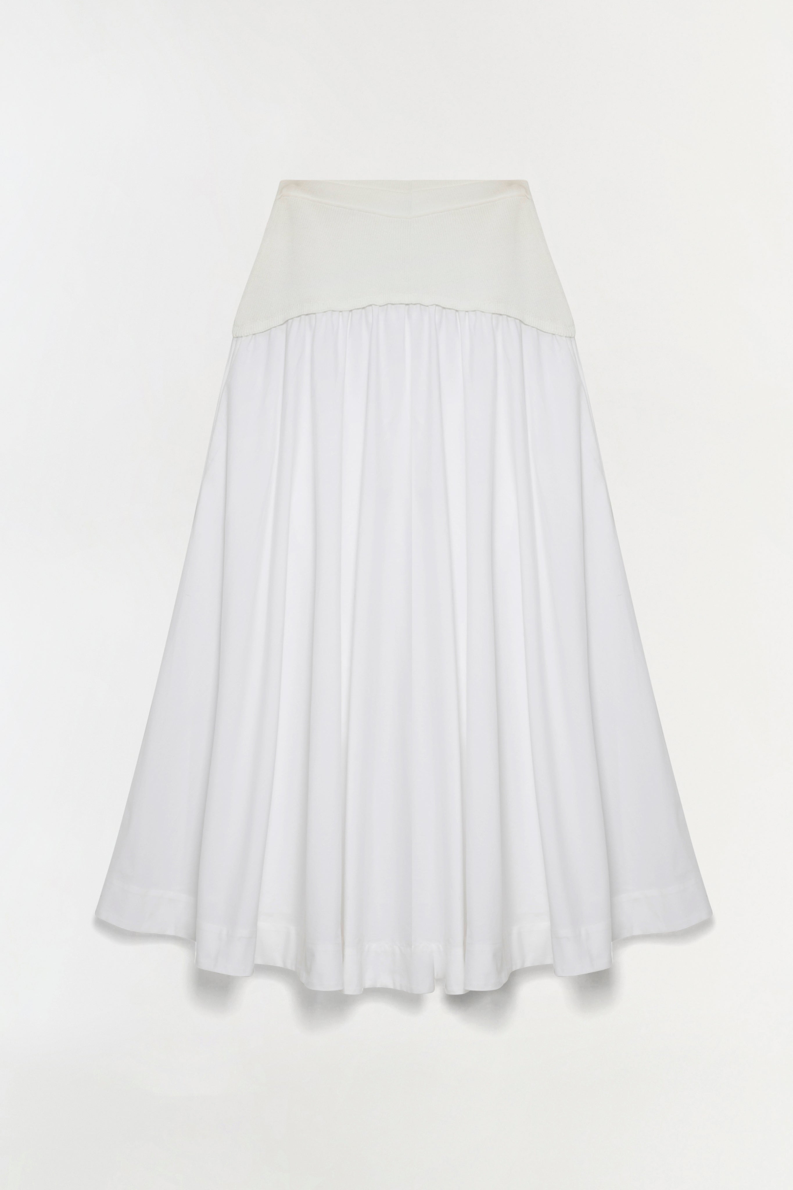 Made in lightweight cotton poplin, this skirt is set with a ribbed knit waistband that contours the waist. The gathered design opens into a fluid, mid-length silhouette. A refined mix of structure and motion. Pair with the Stiles Knit Cotton Shirt in White for a matching set.