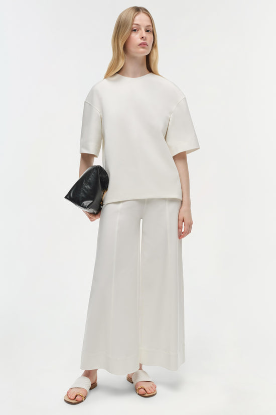 The Kallin Cotton Cropped Pant in White. Crafted from heavy cotton, these cropped wide-leg bottoms showcase a clean and structured silhouette with a contemporary edge.