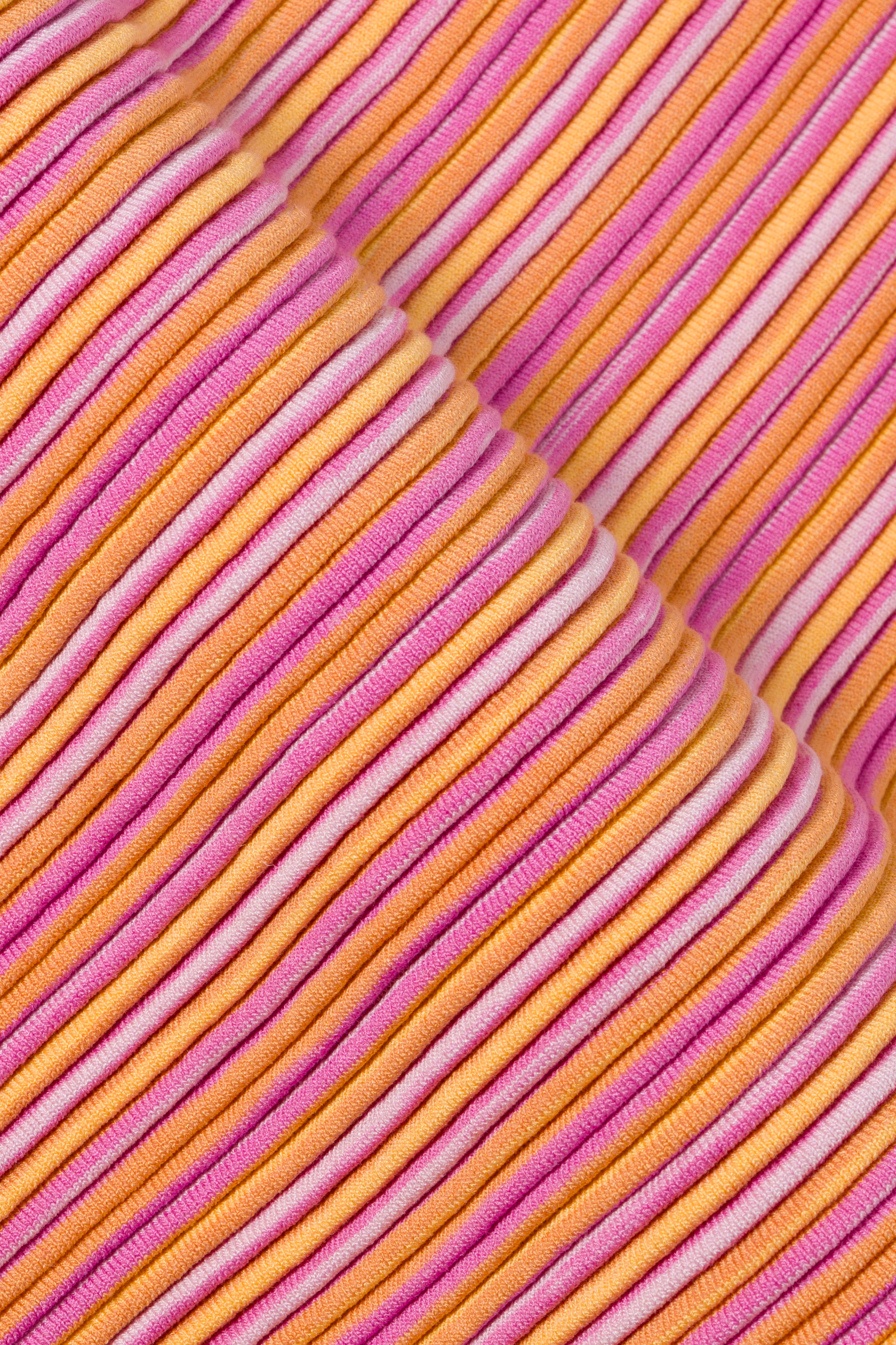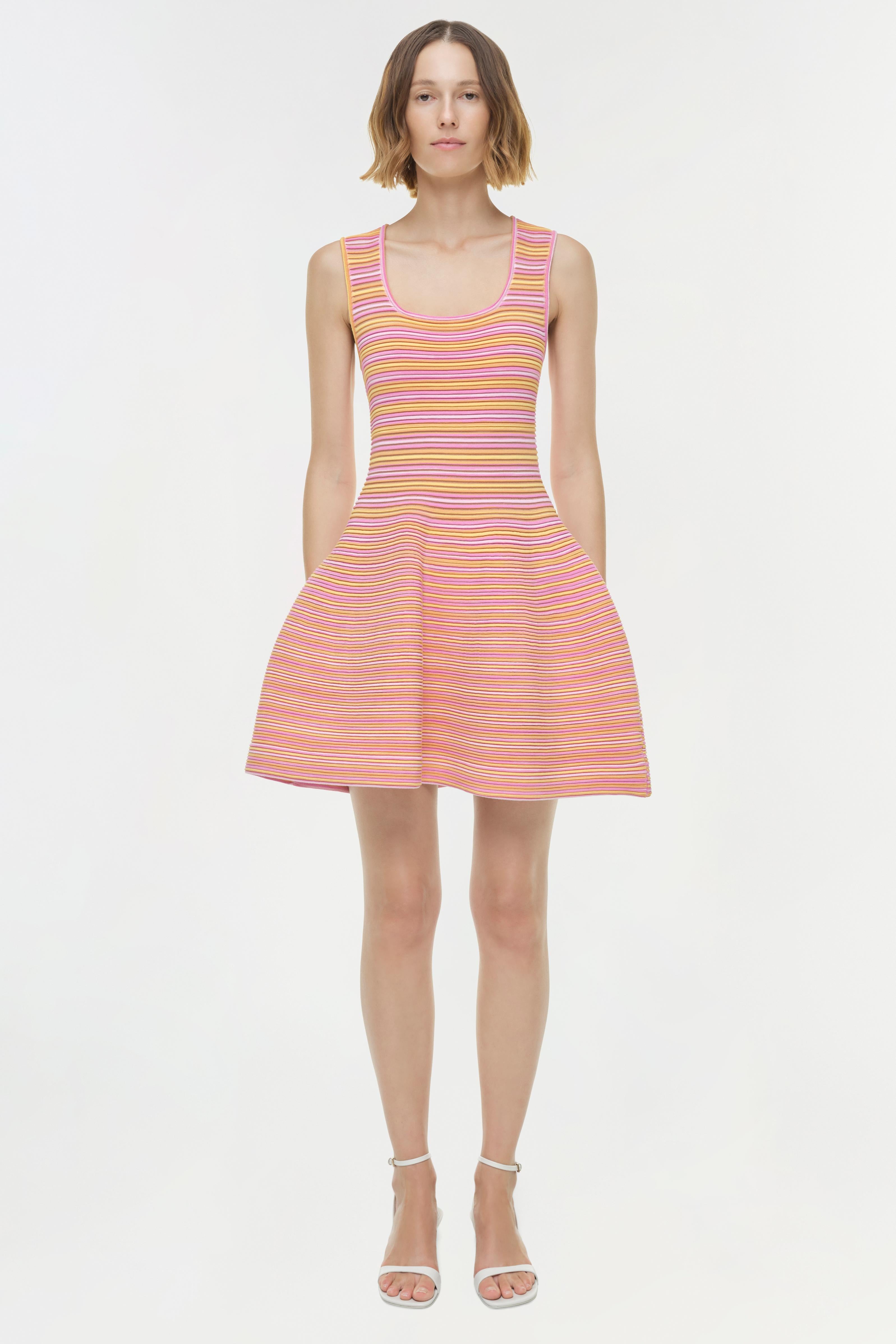The Cally Mini Dress in Citrus Multi. This scoop-neck mini dress is made from space-dyed knit and is crafted with structured, voluminous pleats that flare out to create a flattering, sculpted silhouette. The defined pleating adds movement and a modern edge to the design.