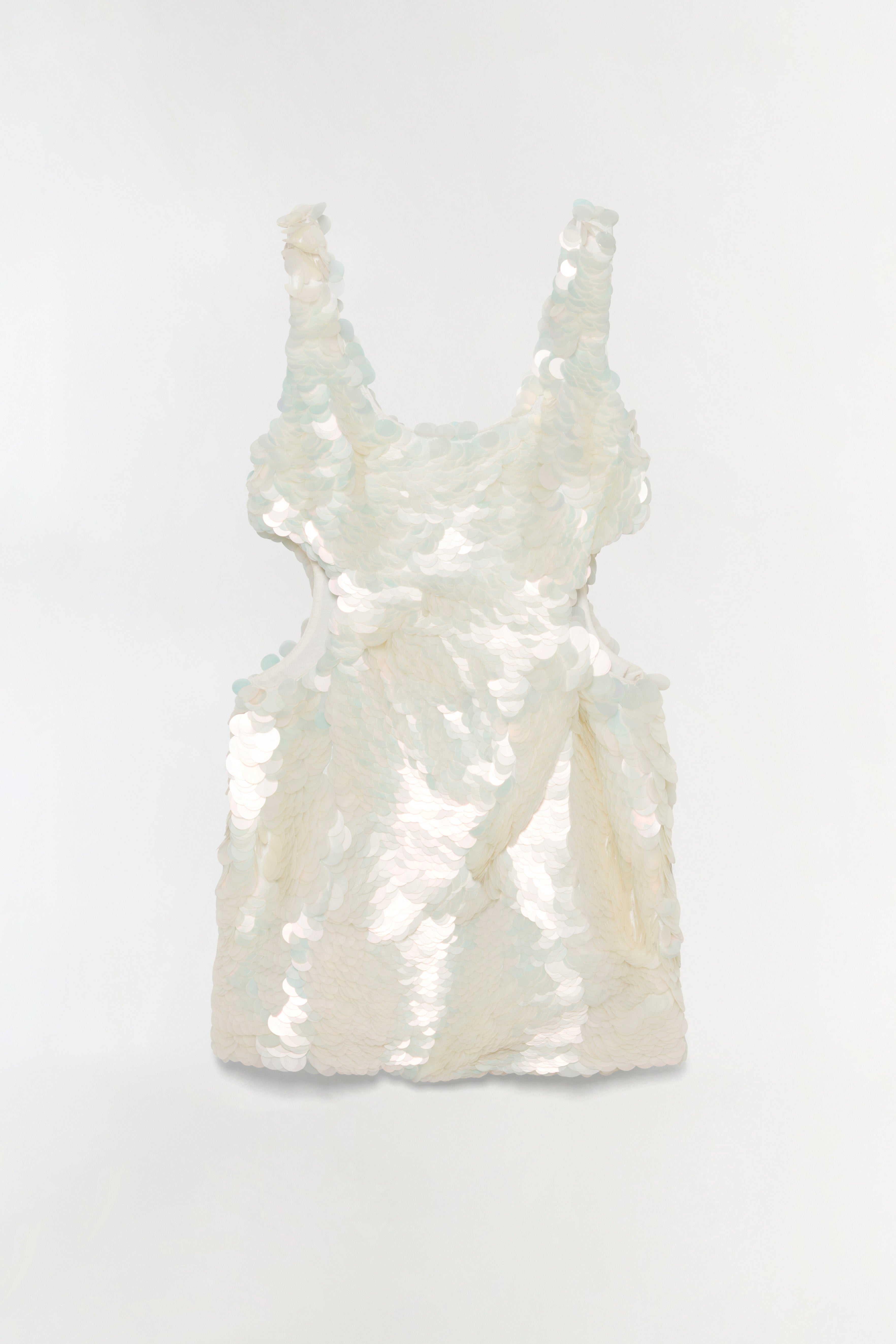 Layered sequins form a rhythmic, light-reflective pattern that create dimension and movement throughout. Side cutouts contour the waist, lending the silhouette a sculpted, modern edge.