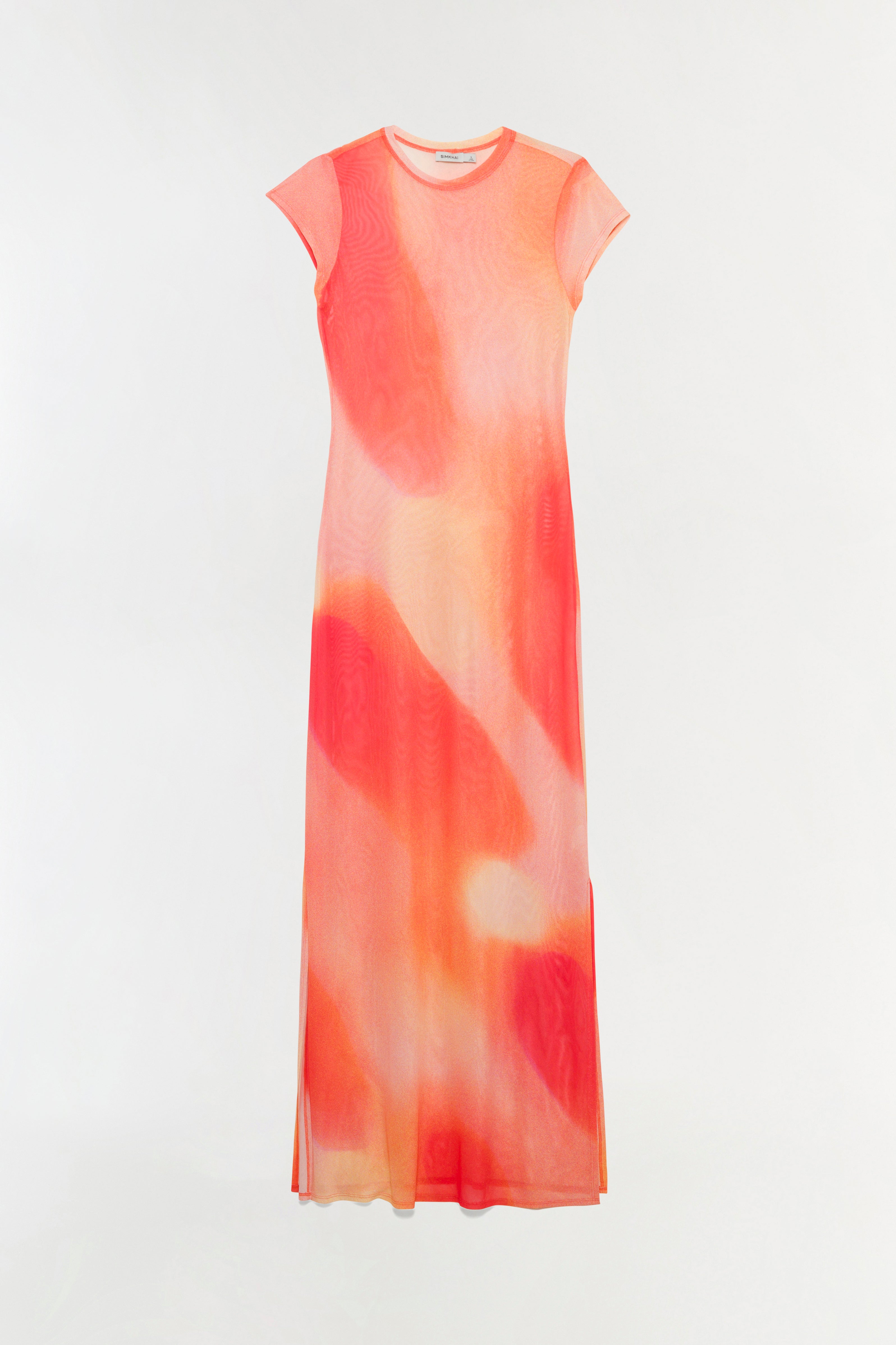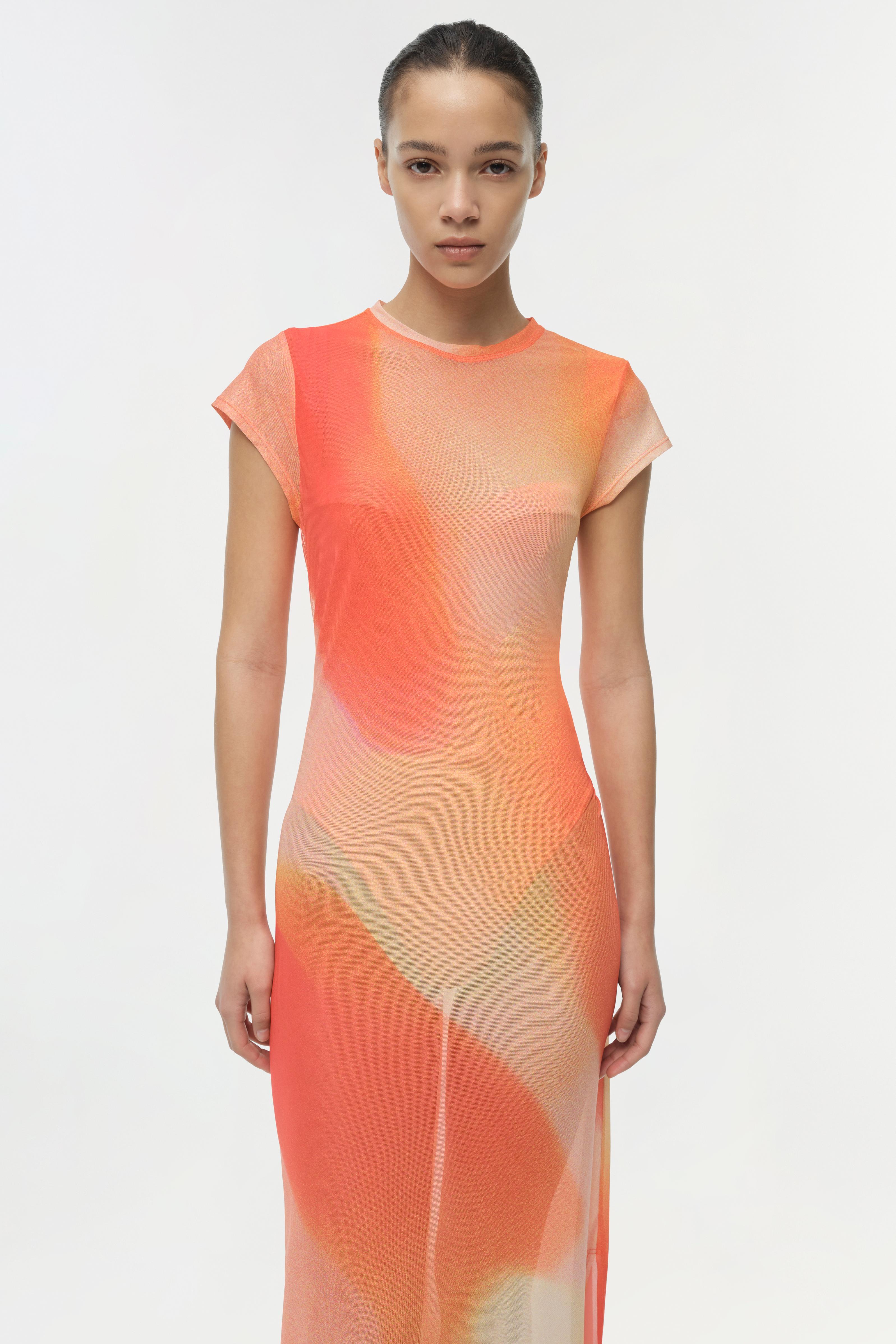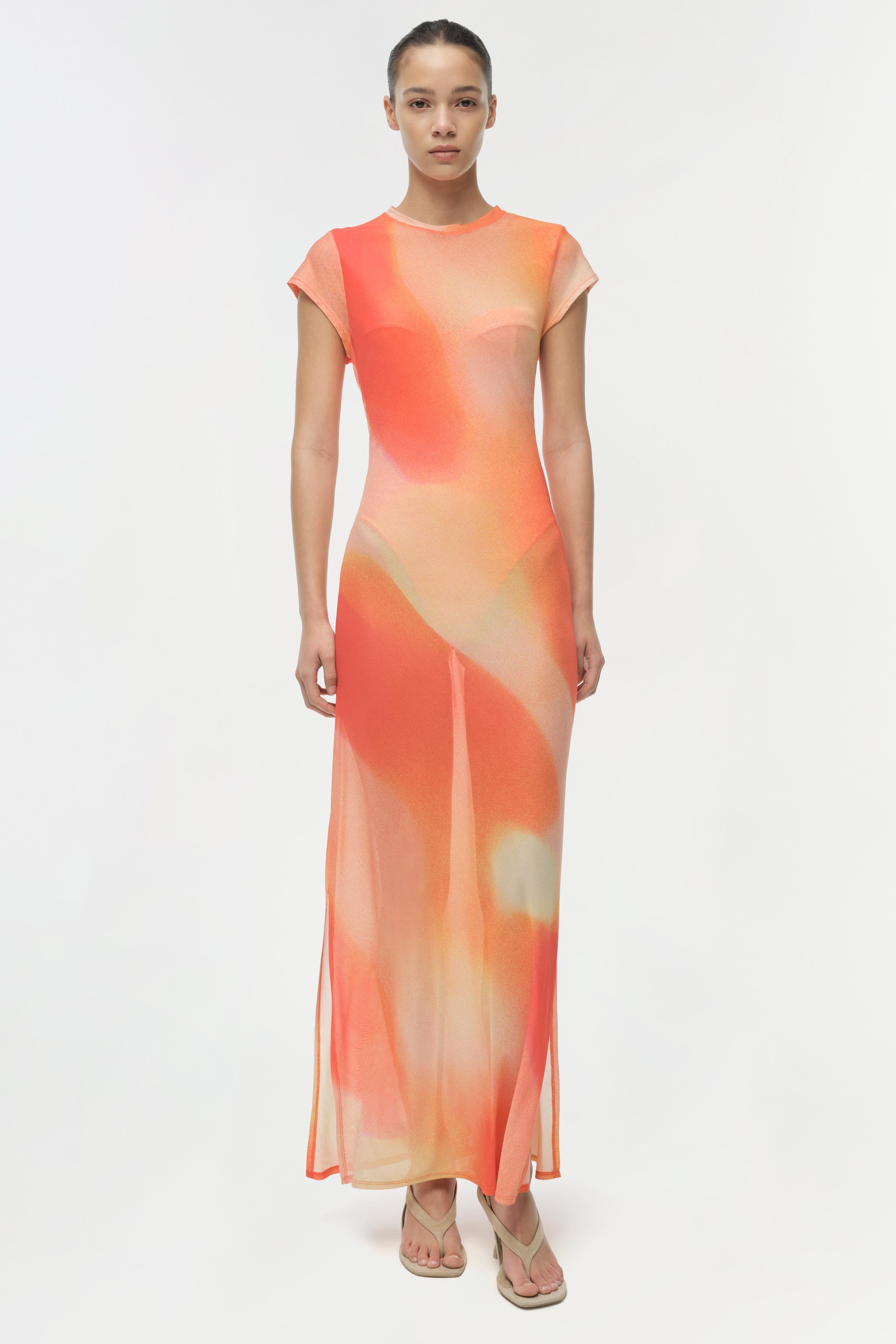 The Fia Mesh Midi Dress in Golden Hour Sunset. Rendered in printed mesh, this midi dress cover-up features cap sleeves and a slightly sheer finish, draping gracefully for a refined, lightweight layer.