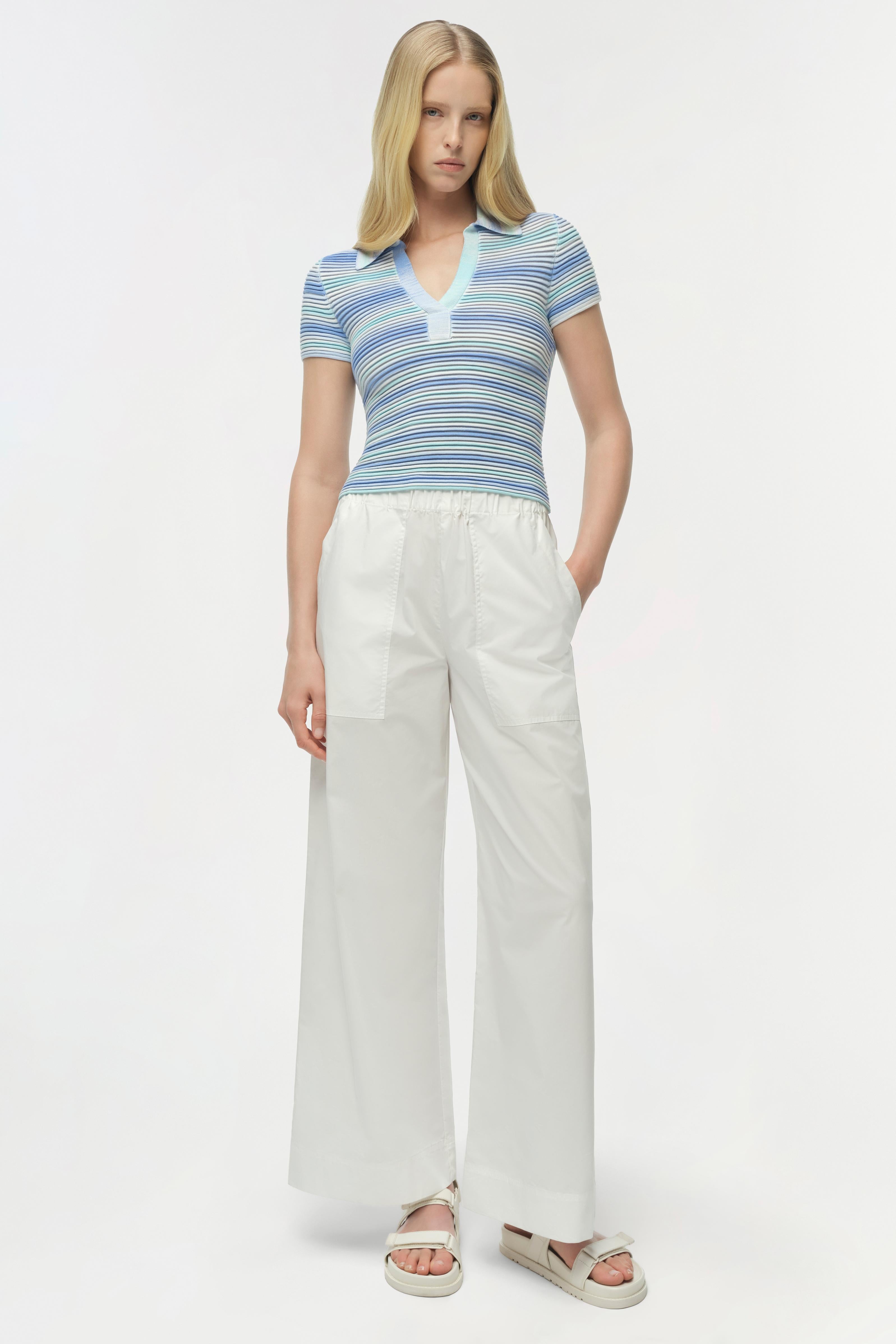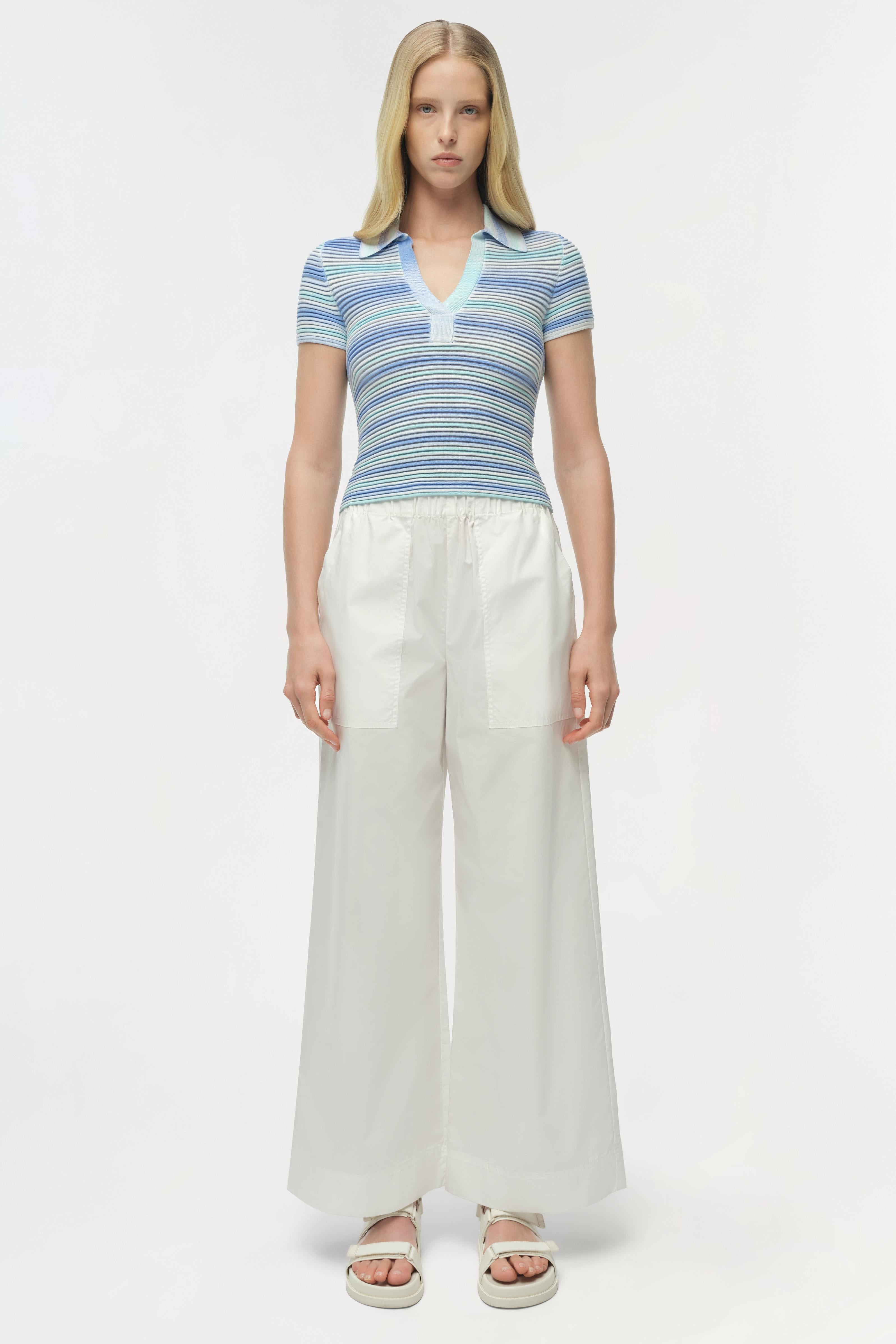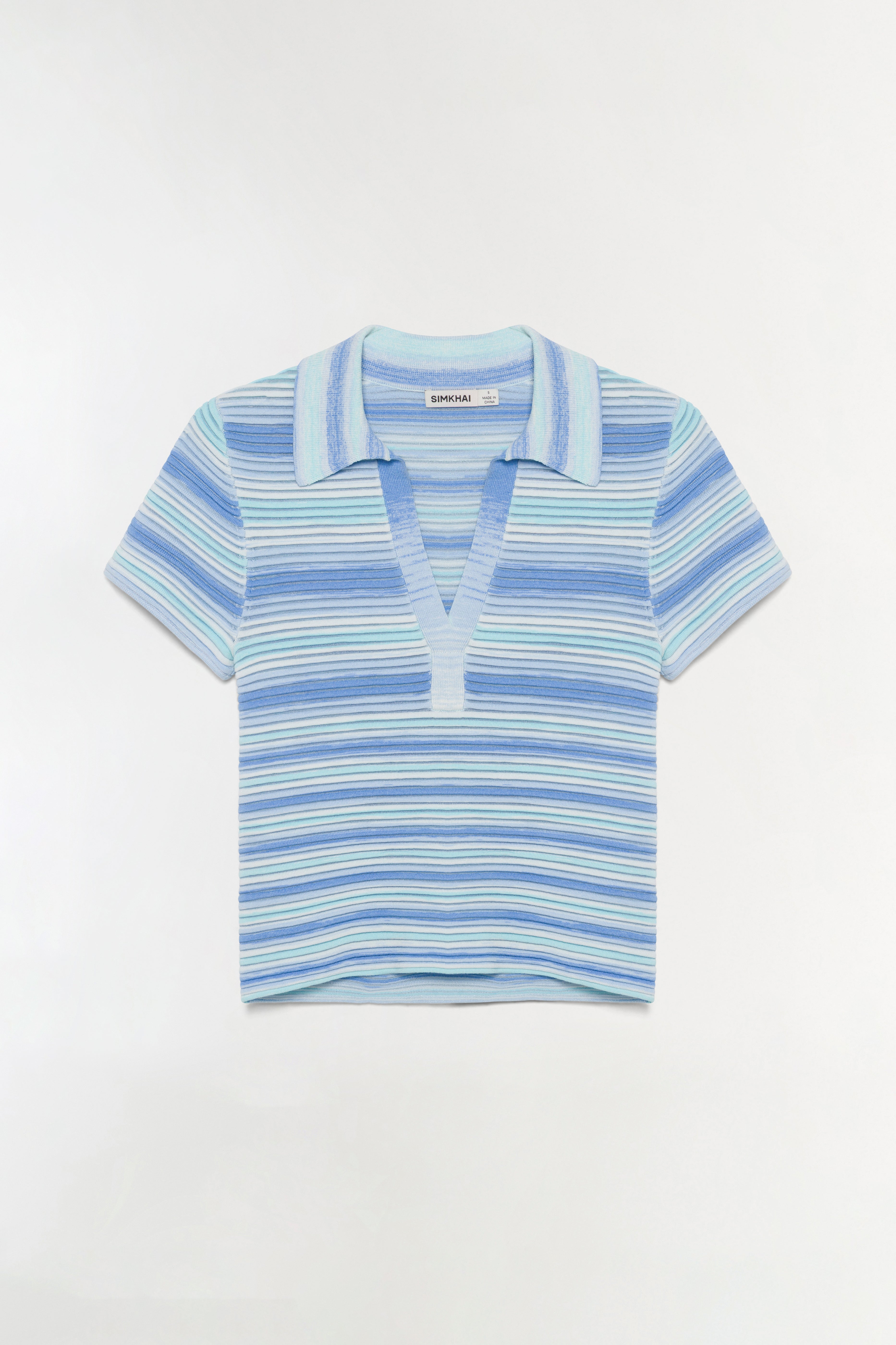 The Paxton Knit Polo in Periwinkle Multi. Crafted from space-dyed knit, this short-sleeve polo top features a fitted silhouette and an open neckline for a sleek, modern finish. The tonal variation in the fabric adds subtle texture and depth.