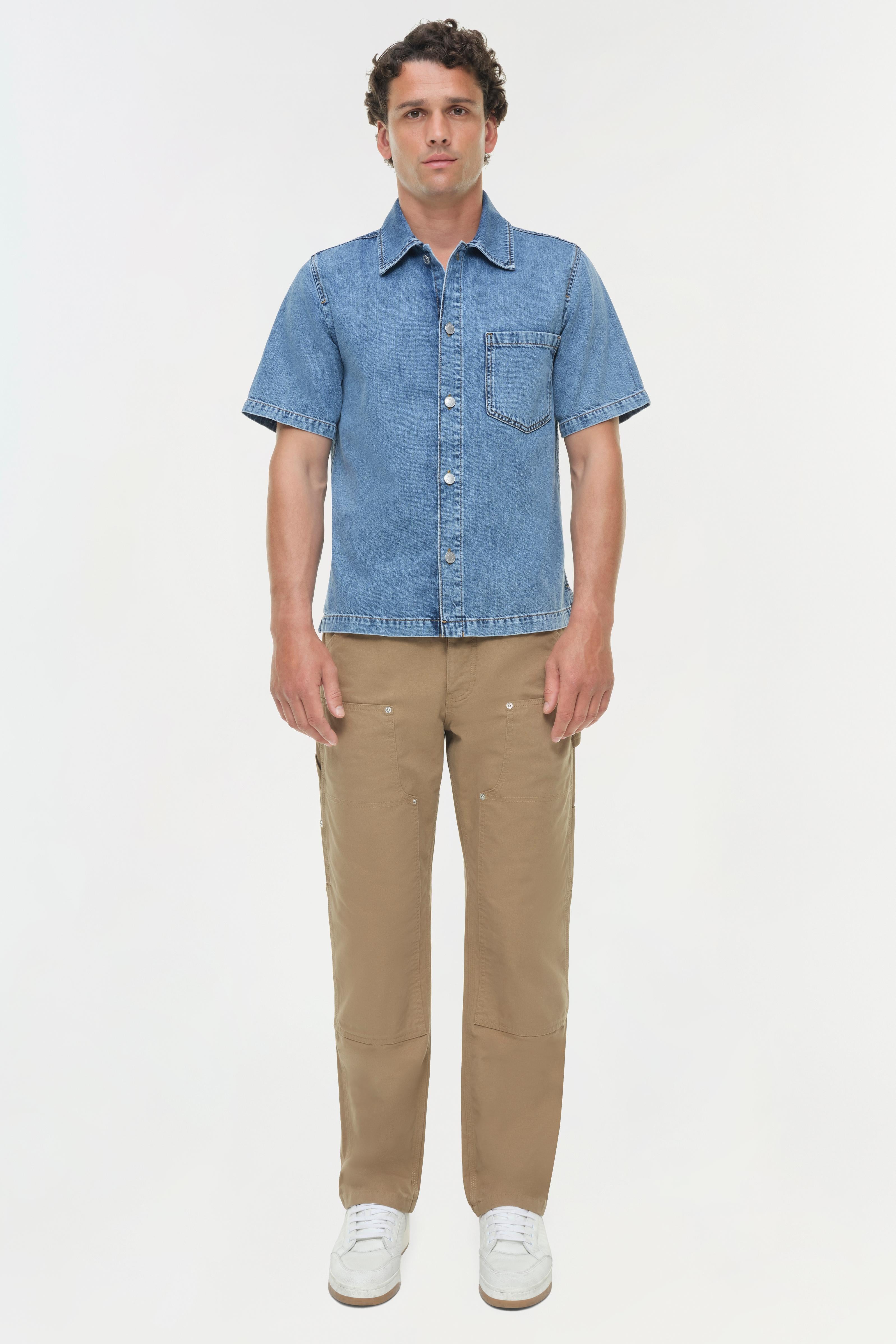 The Ardent Denim Shirt in Powell. This denim short-sleeve shirt features a structured collar and buttoned front, delivering a casual, versatile silhouette.