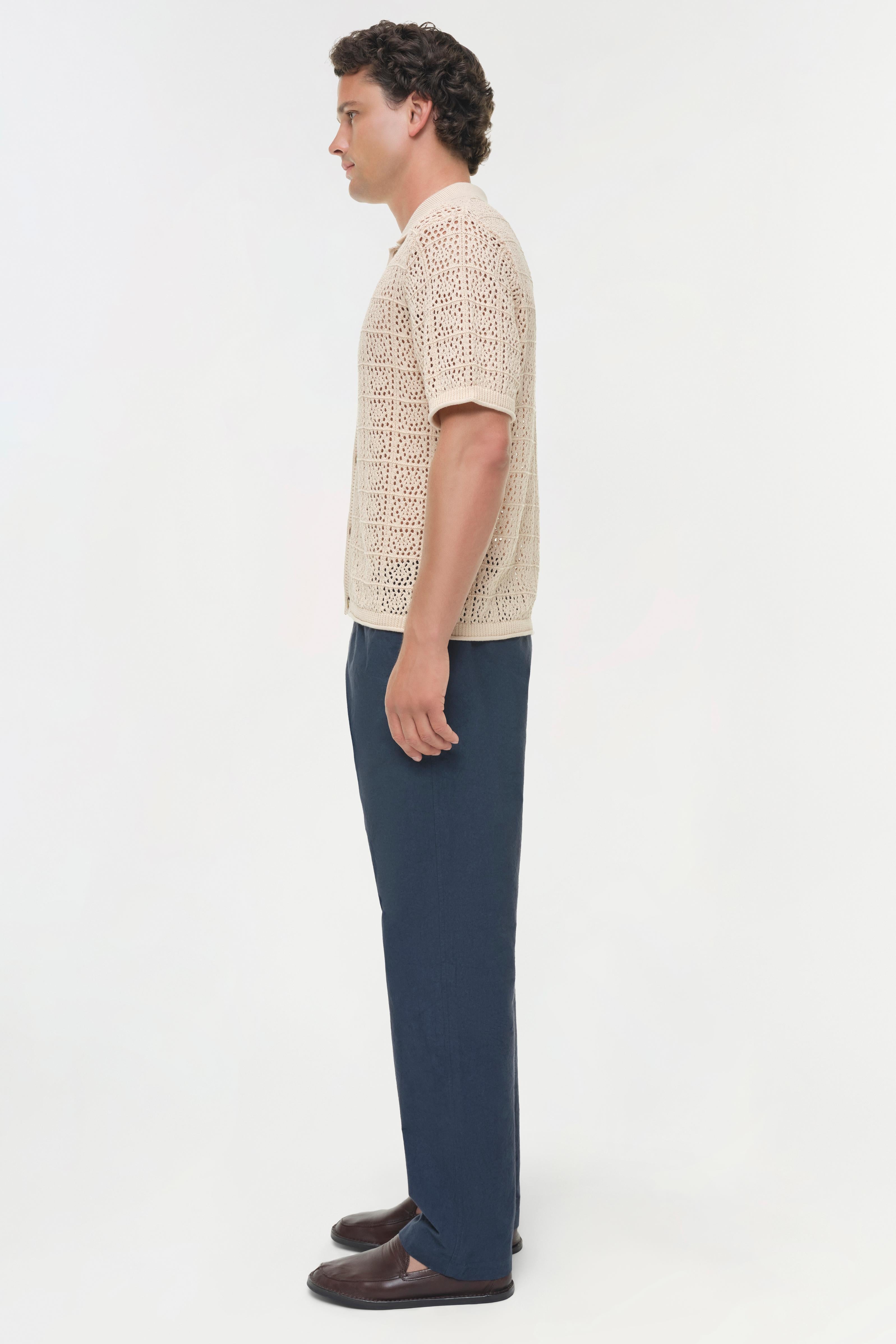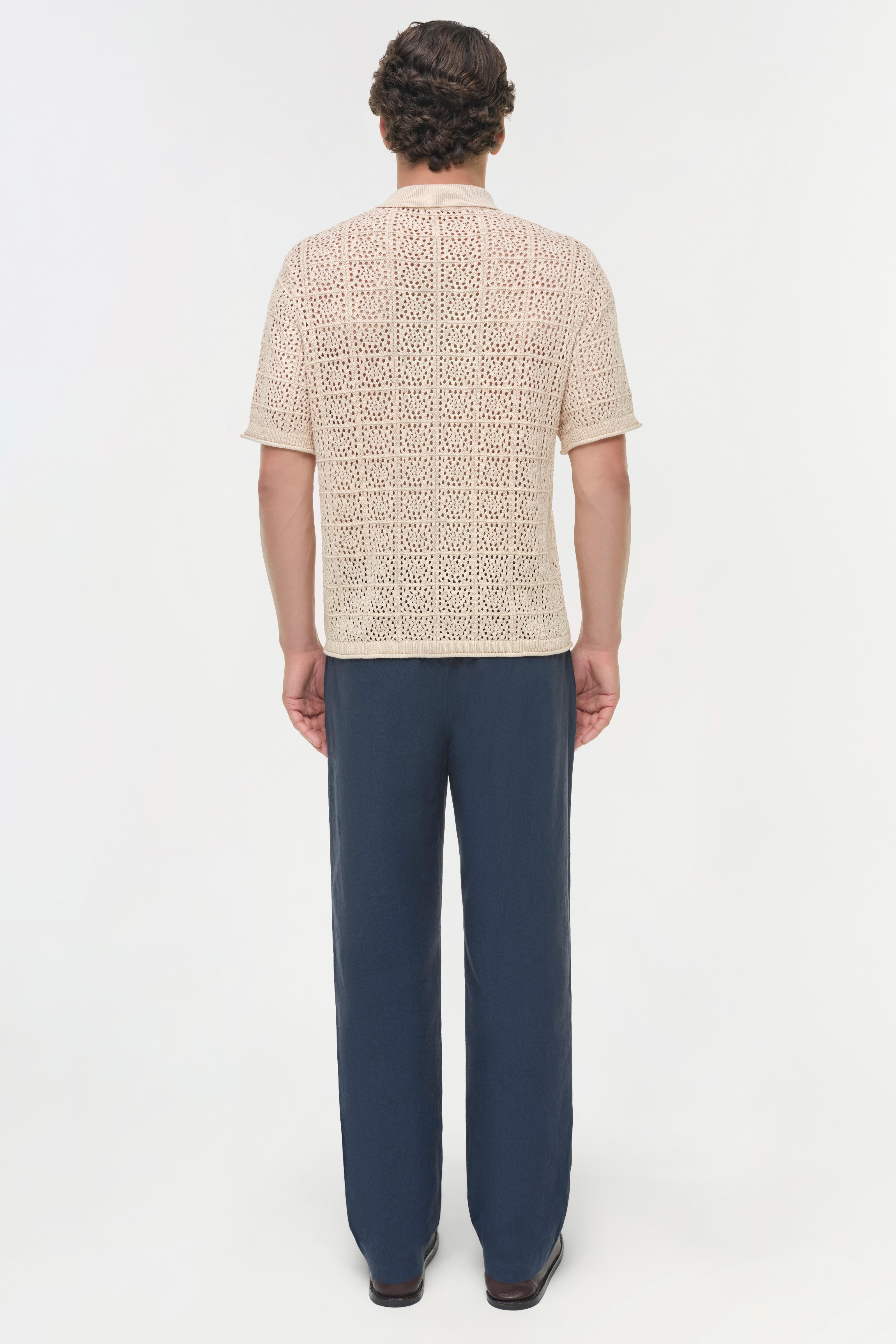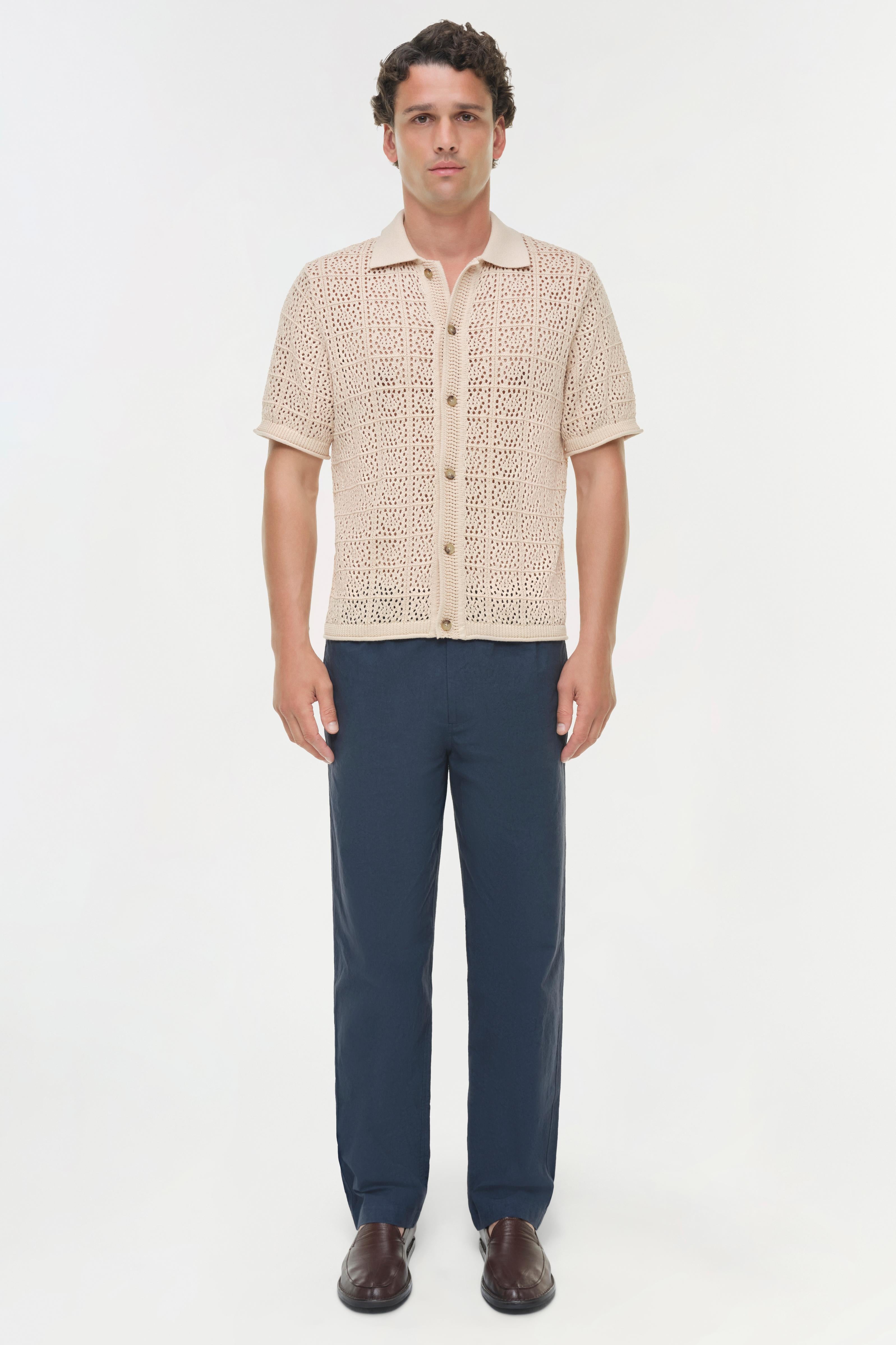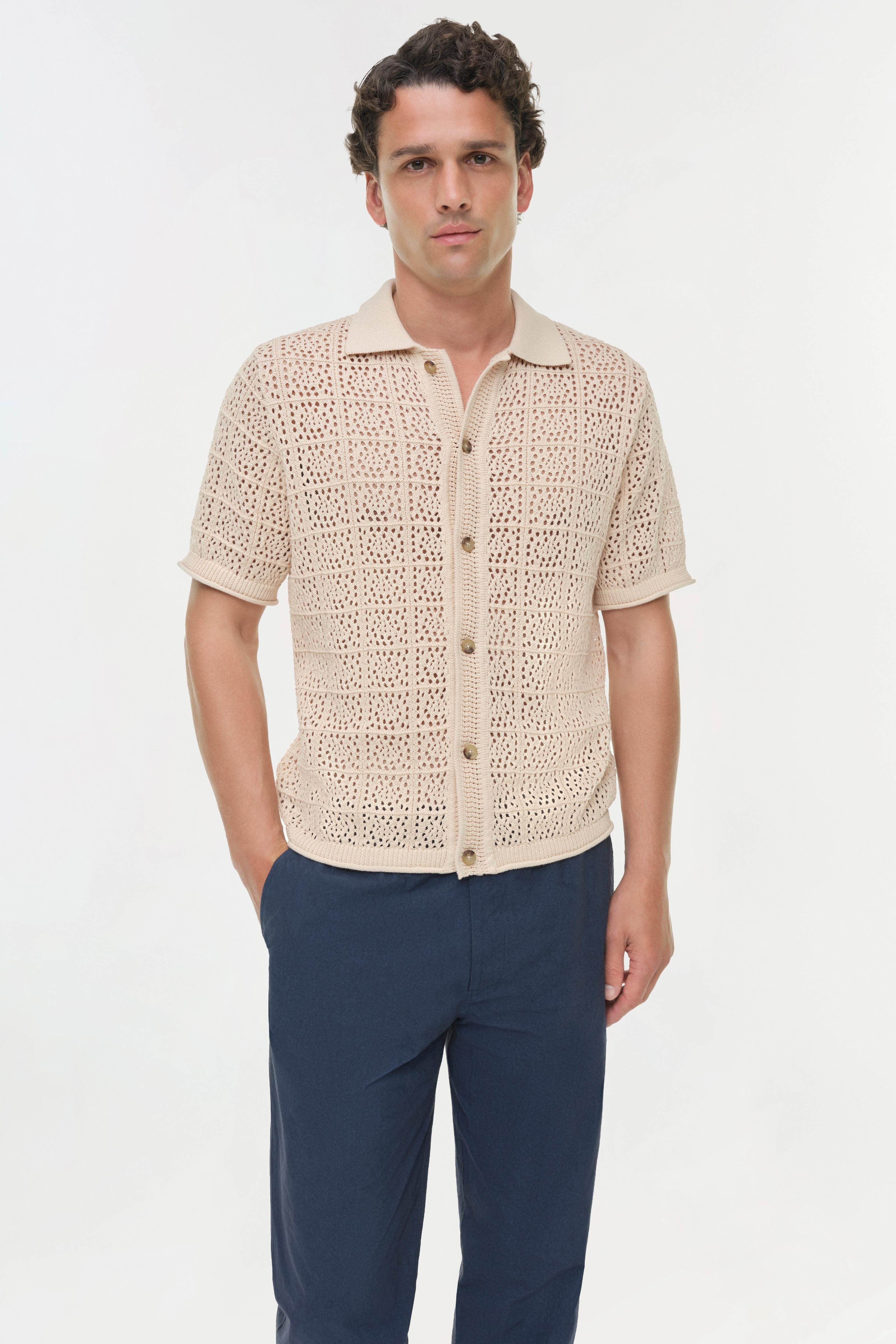The Billy Open Knit Shirt in Beige. Crafted in an open knit, this short-sleeve button-down features a relaxed silhouette and soft collar, offering an effortlessly stylish finish.