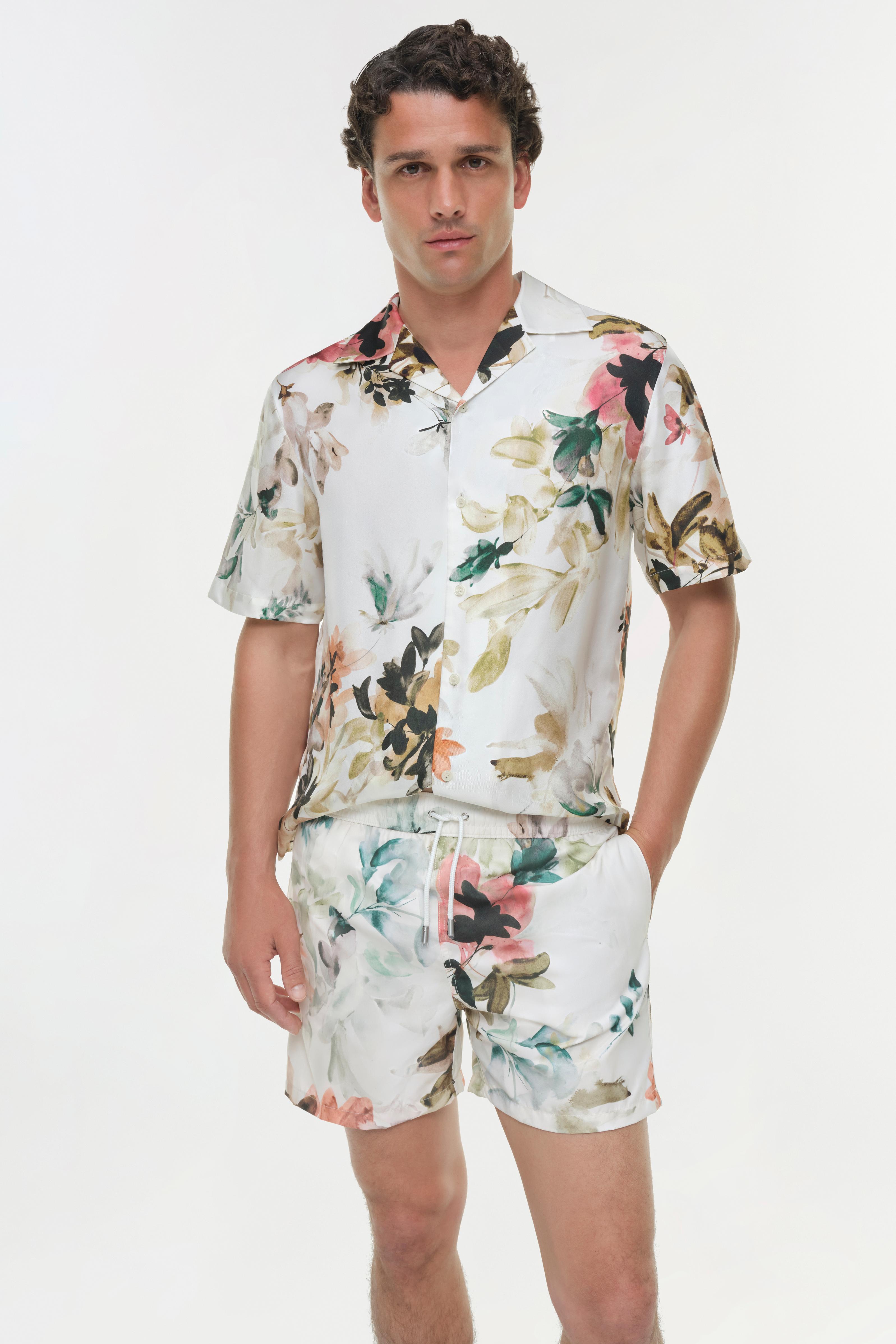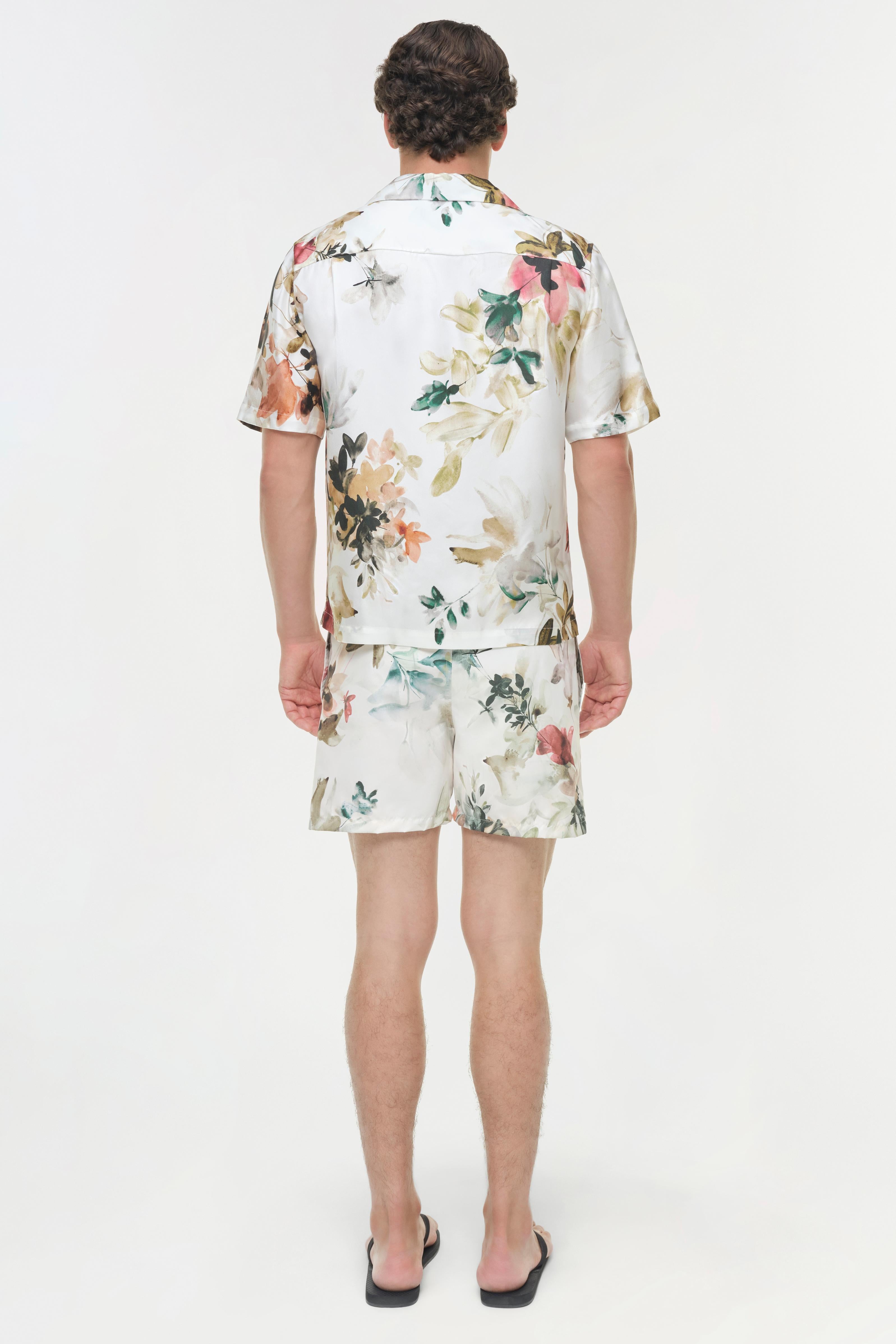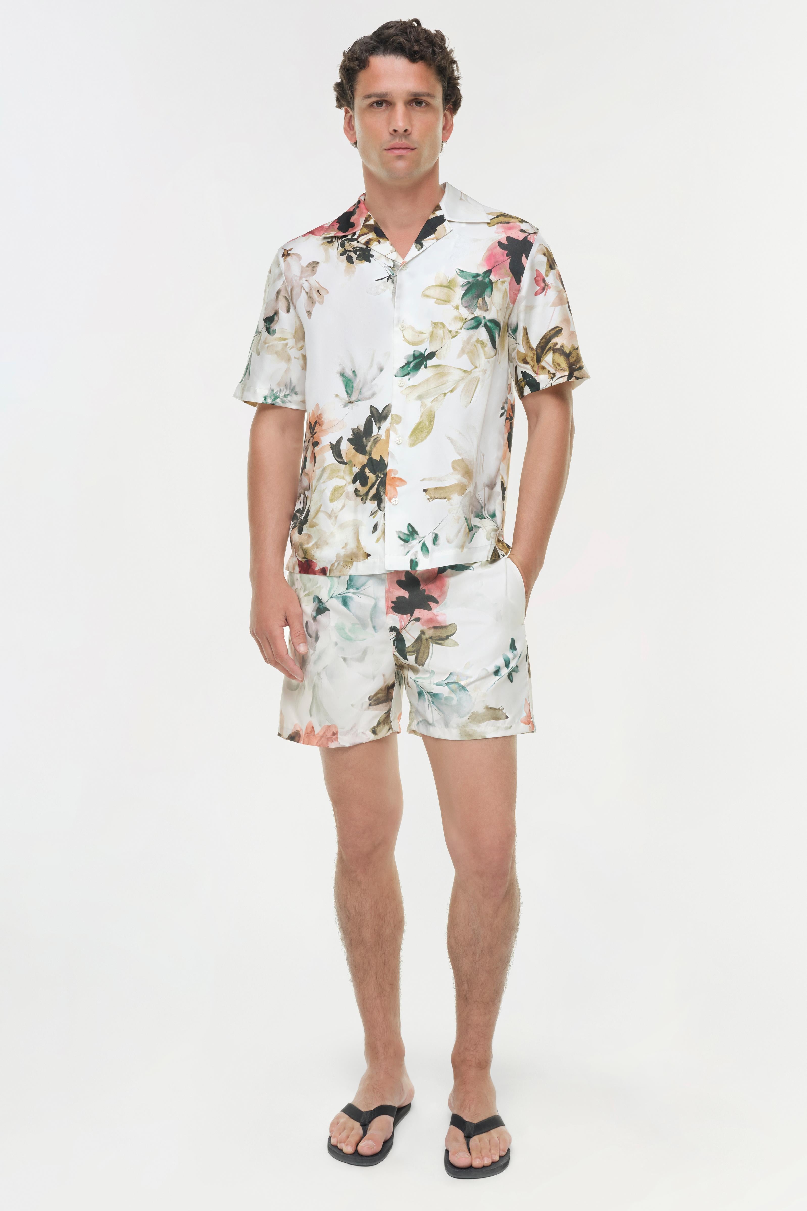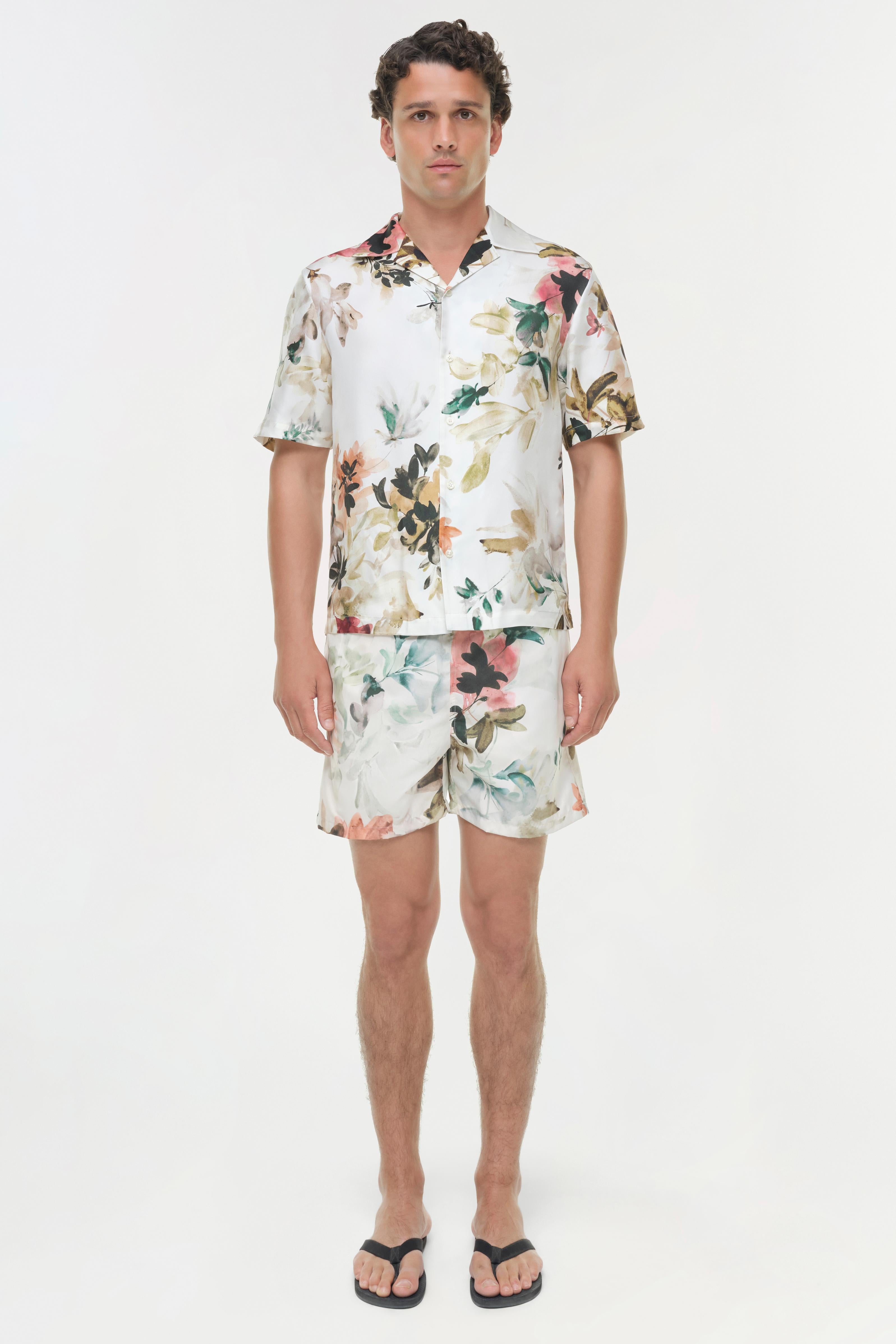 The Lowell Floral Printed Swim Shorts in Ivory Watercolor Floral. Constructed in a lightweight, swim fabrication, these shorts combine practicality with effortless style. The drawstring waist and relaxed leg ensure ease of movement, making them a refined choice for beach or poolside wear. Wear it solo for standout simplicity or pair it back to the Casper Printed Silk Shirt for a matching look.