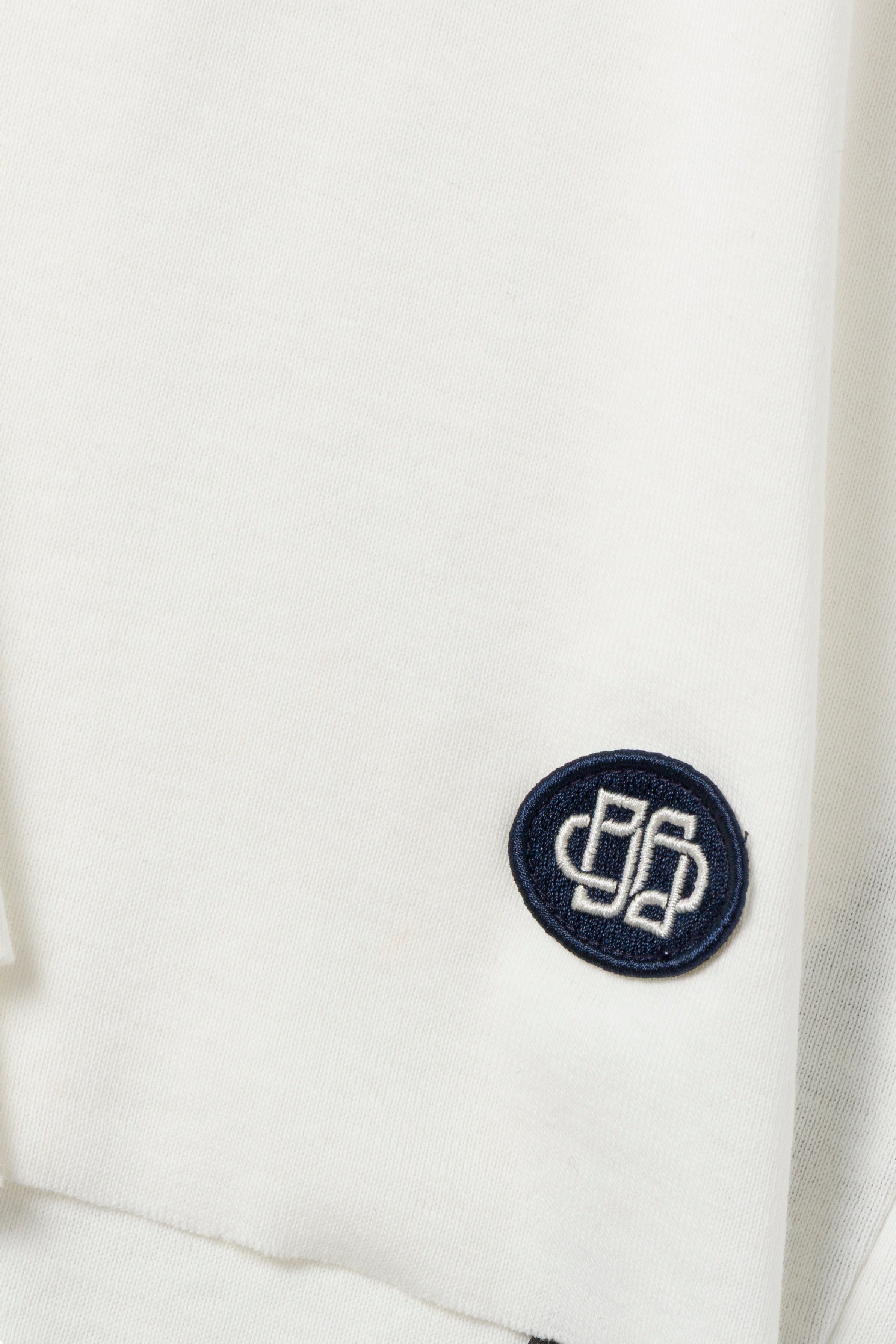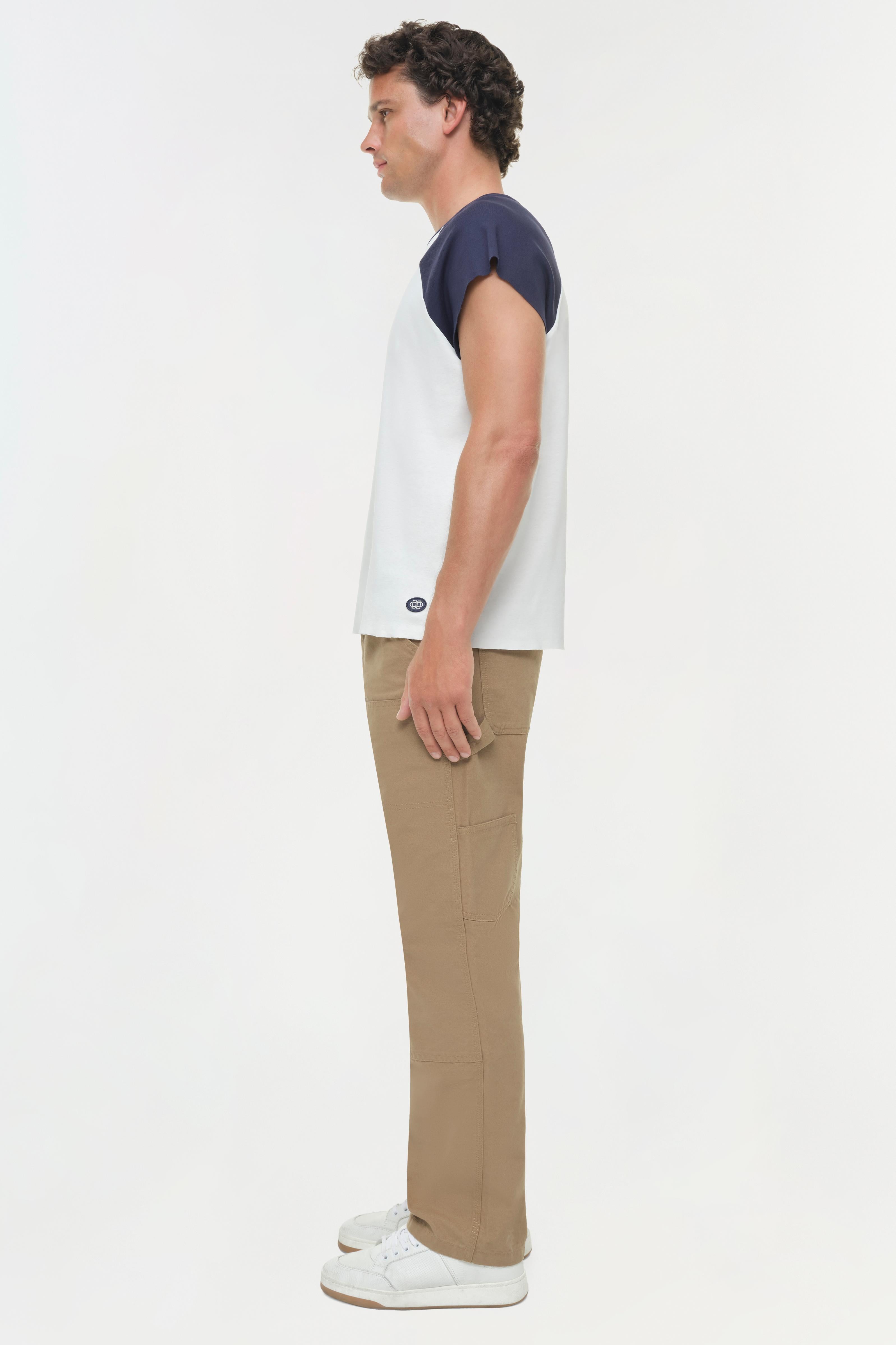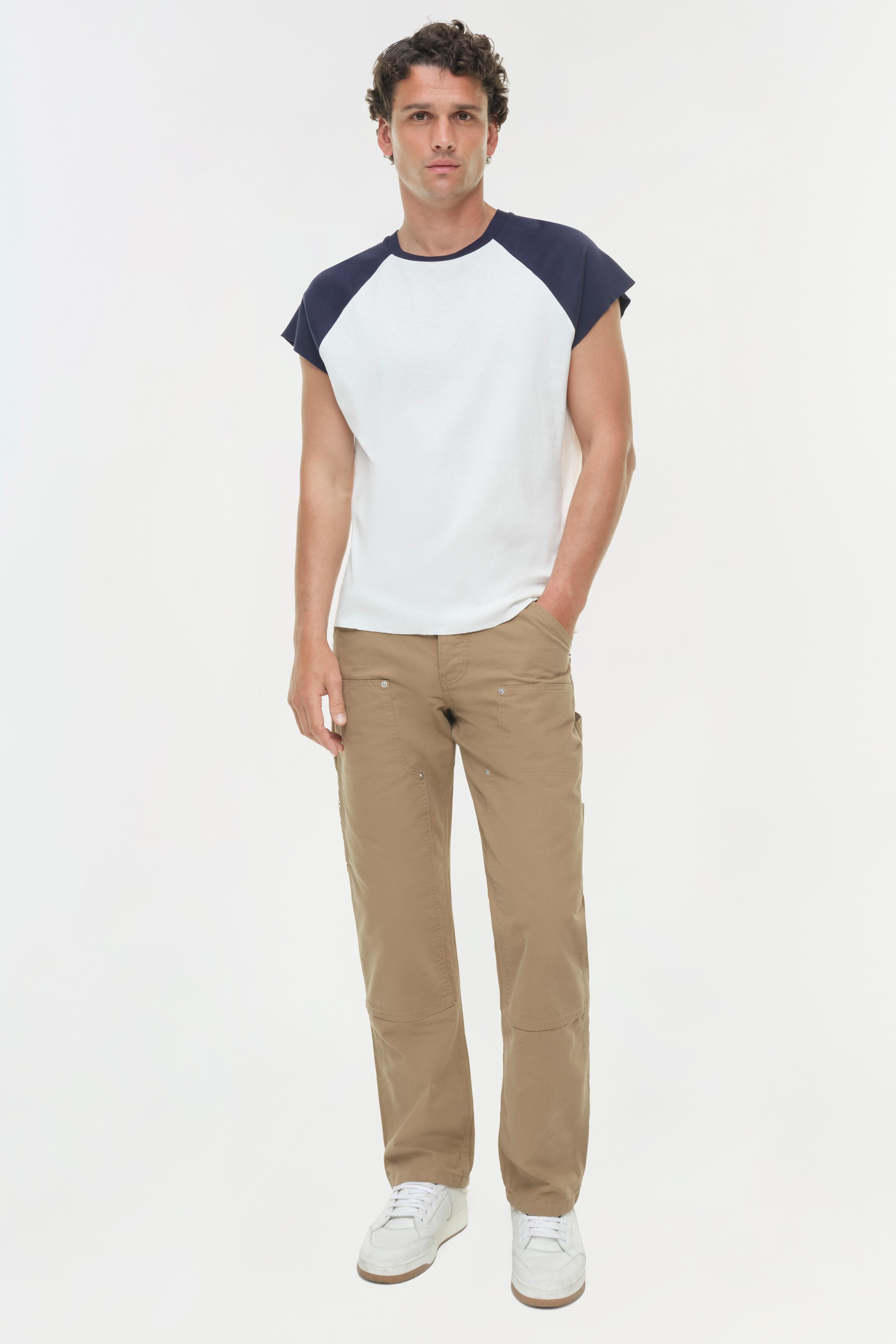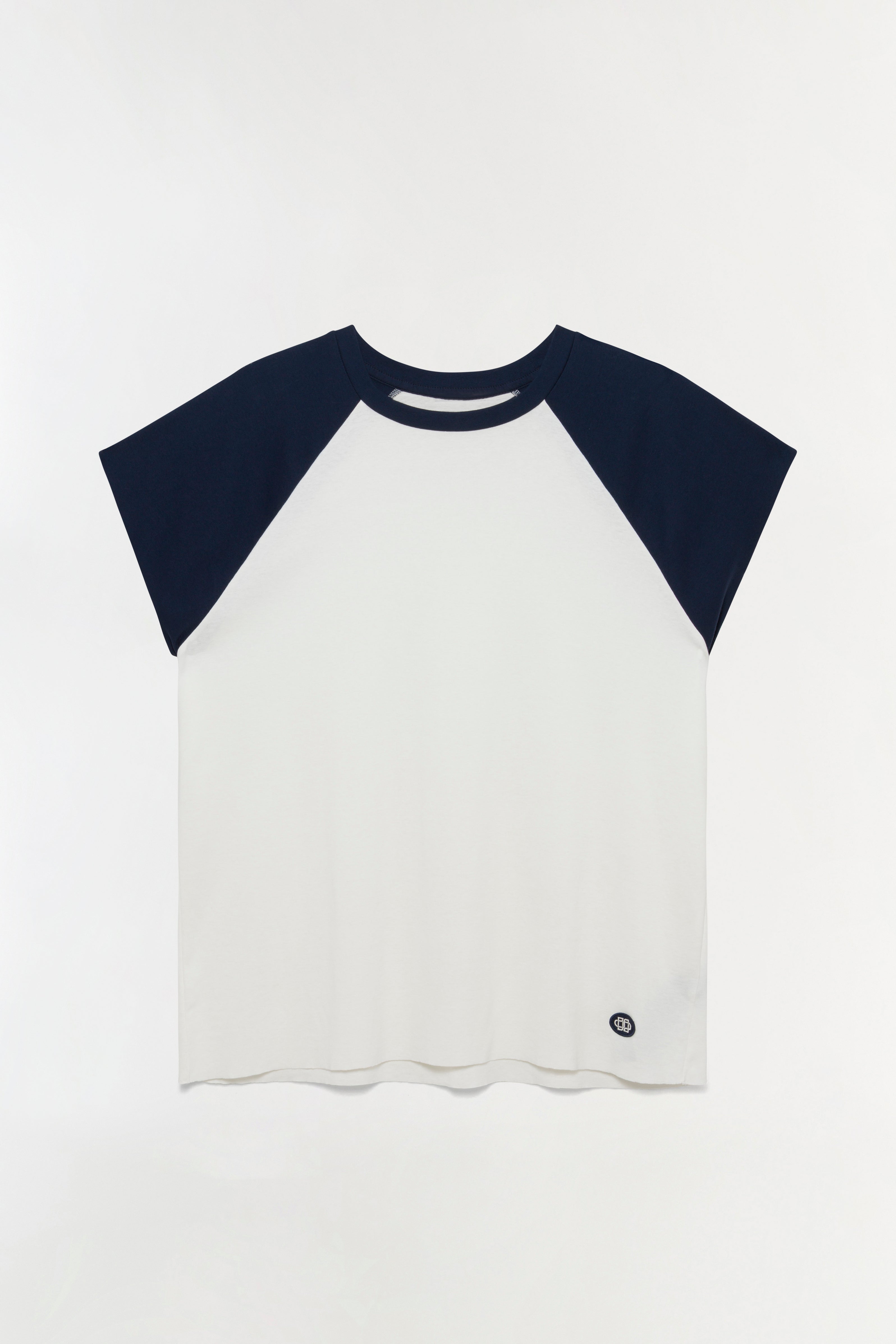 The Reuben T-Shirt in Ivory Multi. This raglan short-sleeve tee, made from soft jersey, is defined by contrast-color detailing and a cut-off fit, blending modern style with a classic, laid-back silhouette.