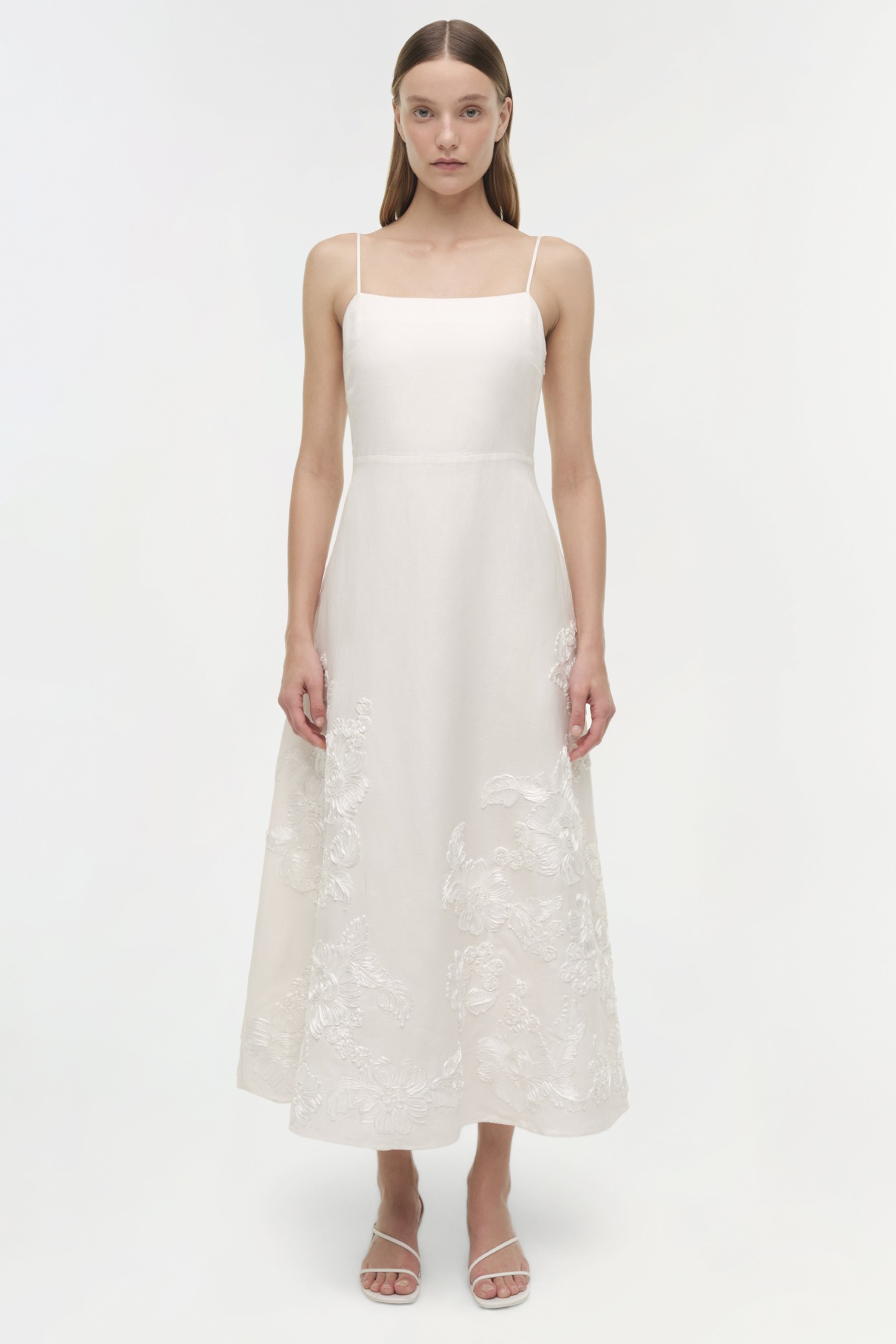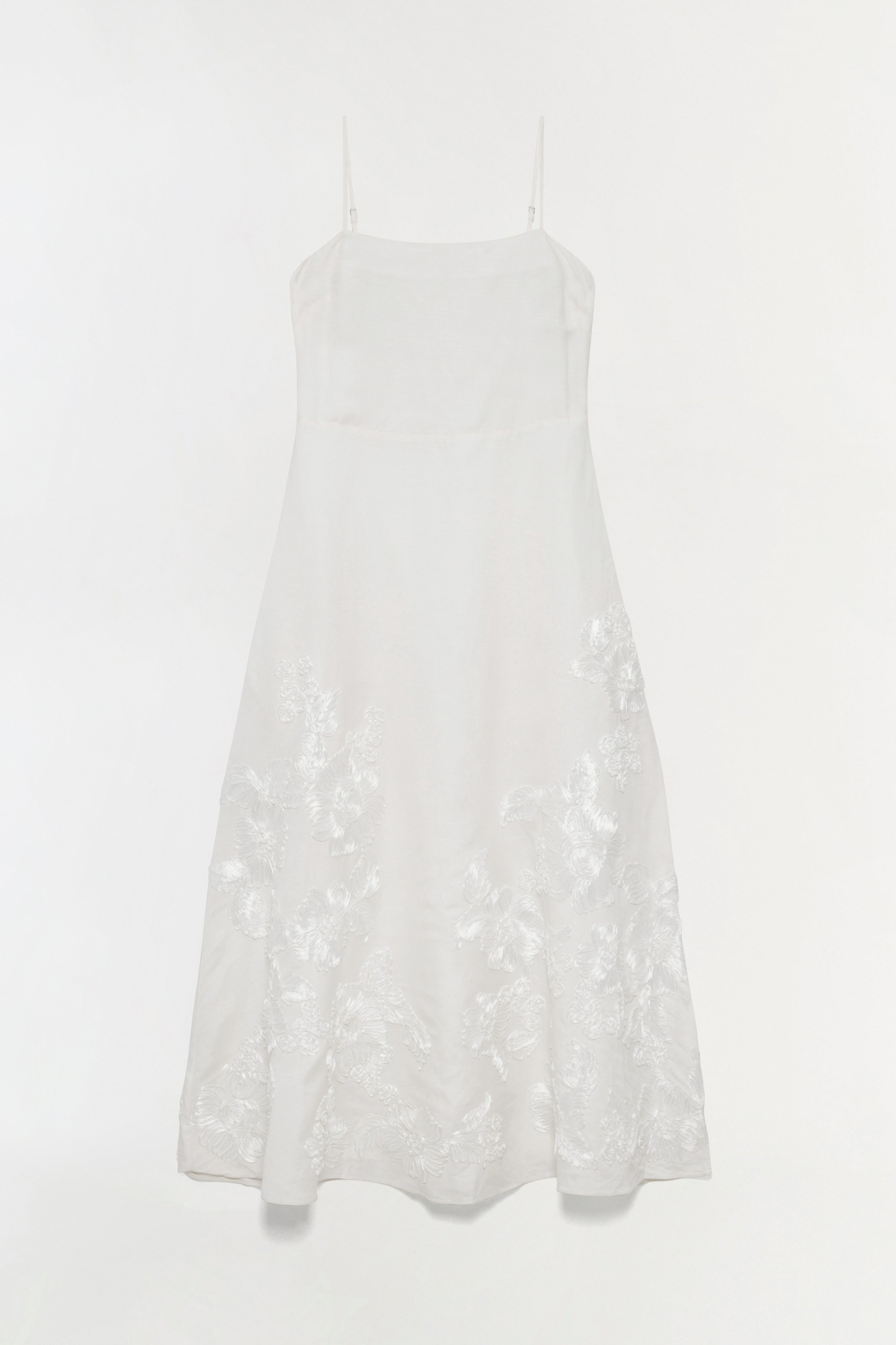 Crafted from a structured yet breathable linen blend, this dress is traced with delicate soutache embroidery that contrasts its clean lines. Cut to a flattering midi length, the silhouette is finished with a delicate cami neckline for an effortless, refined mood.