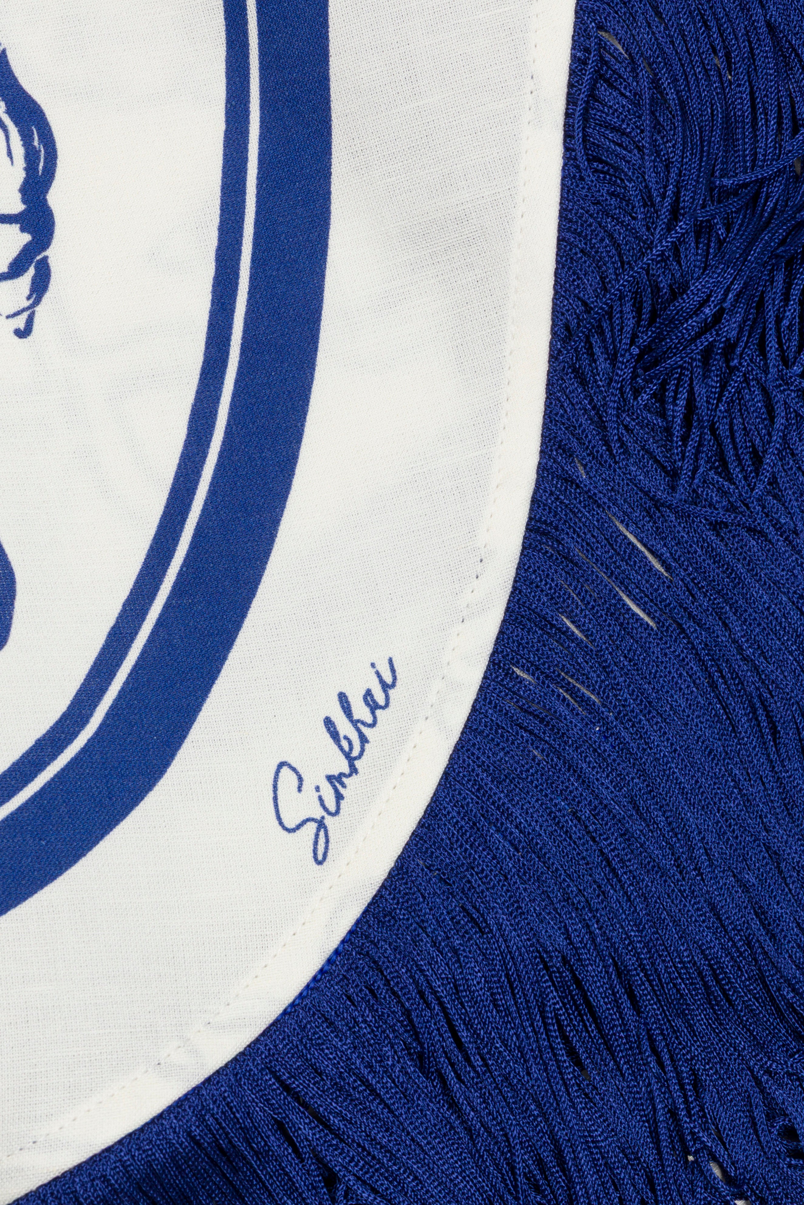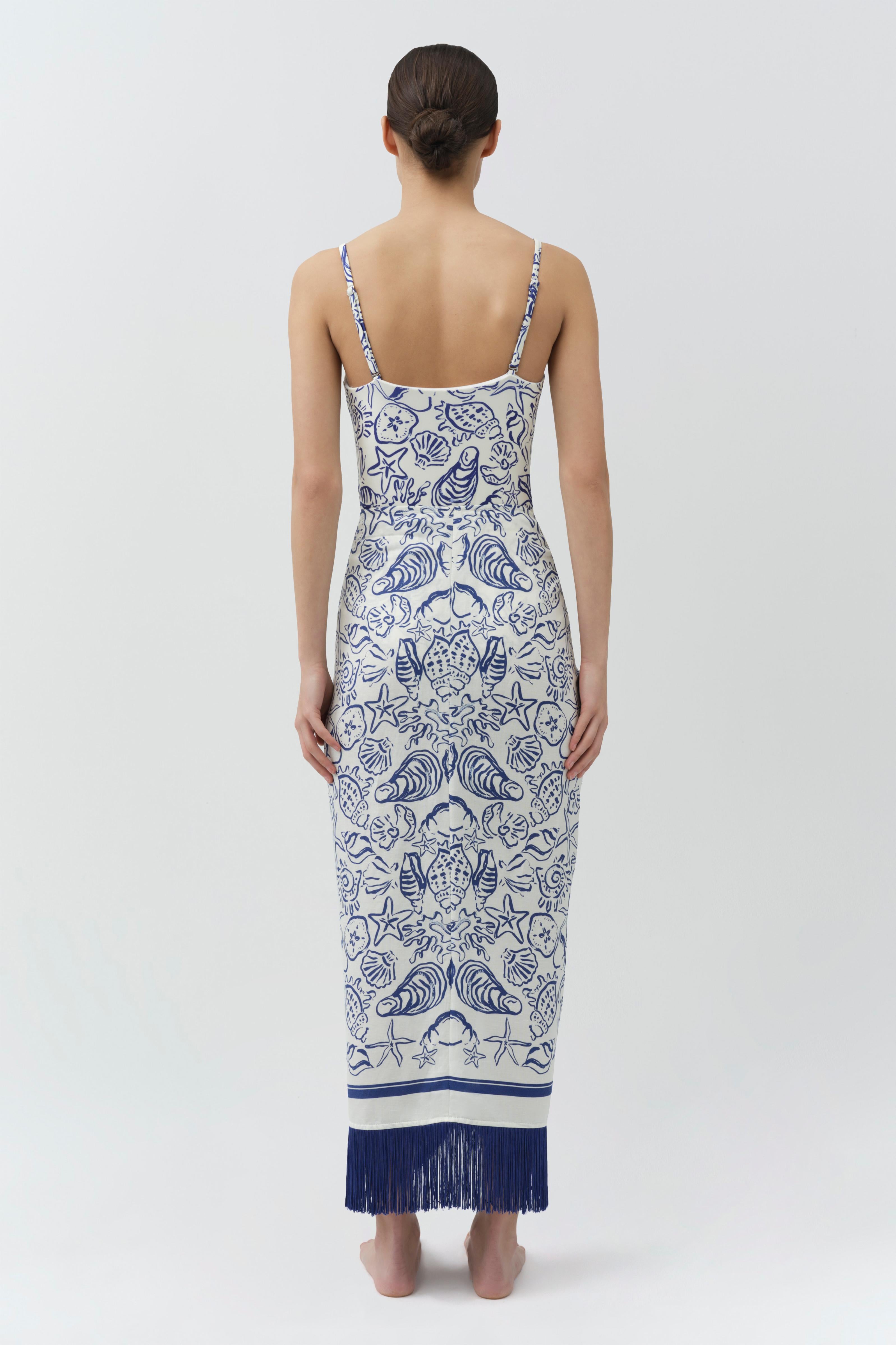 The Russo Printed Linen Pareo in Blueberry Multi. Crafted in a seashell motif print, this pareo is designed as a wrap silhouette with fringe detailing. The placement print and contrast border add graphic detail while fringe adds movement and intrigue.