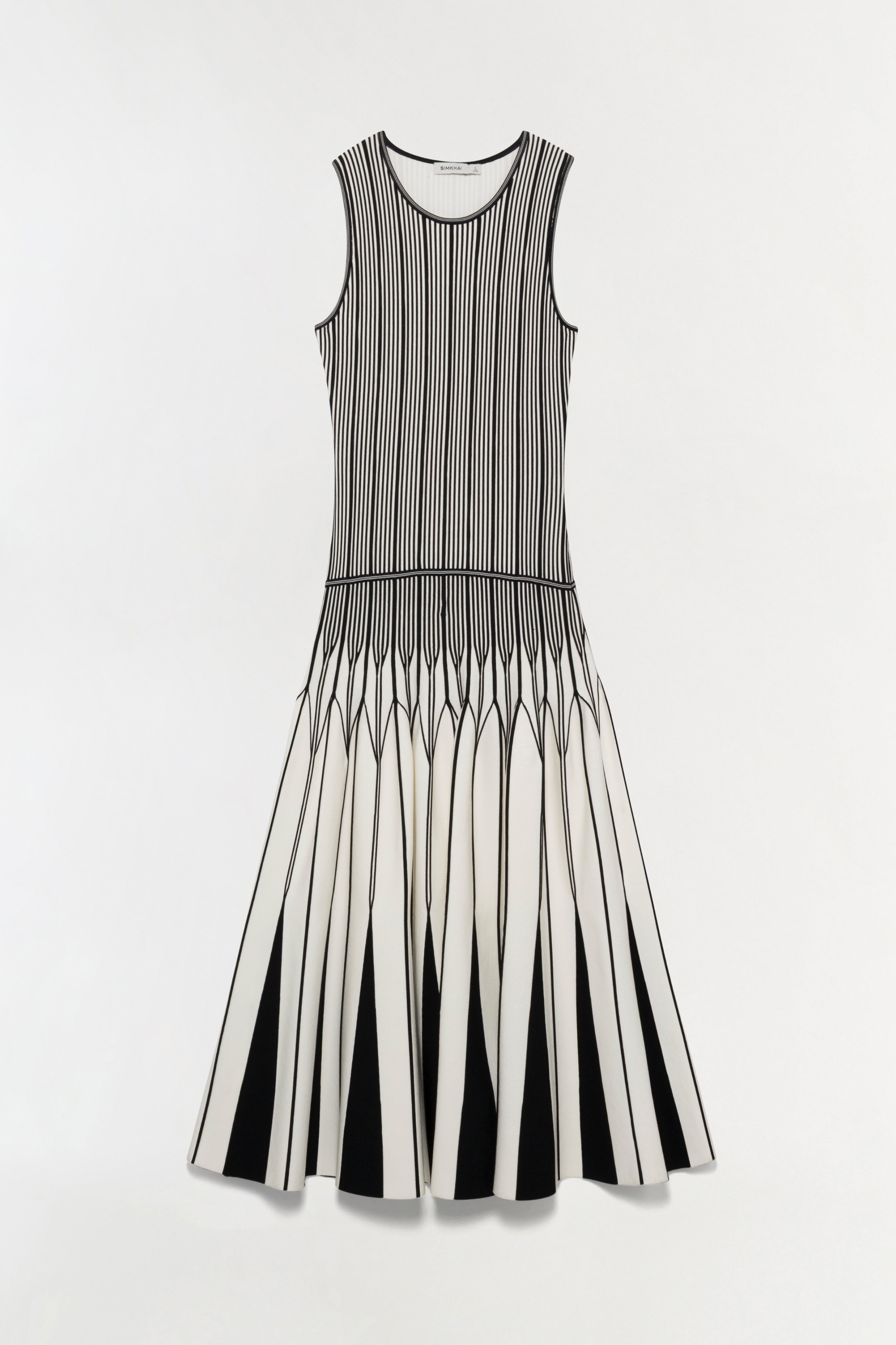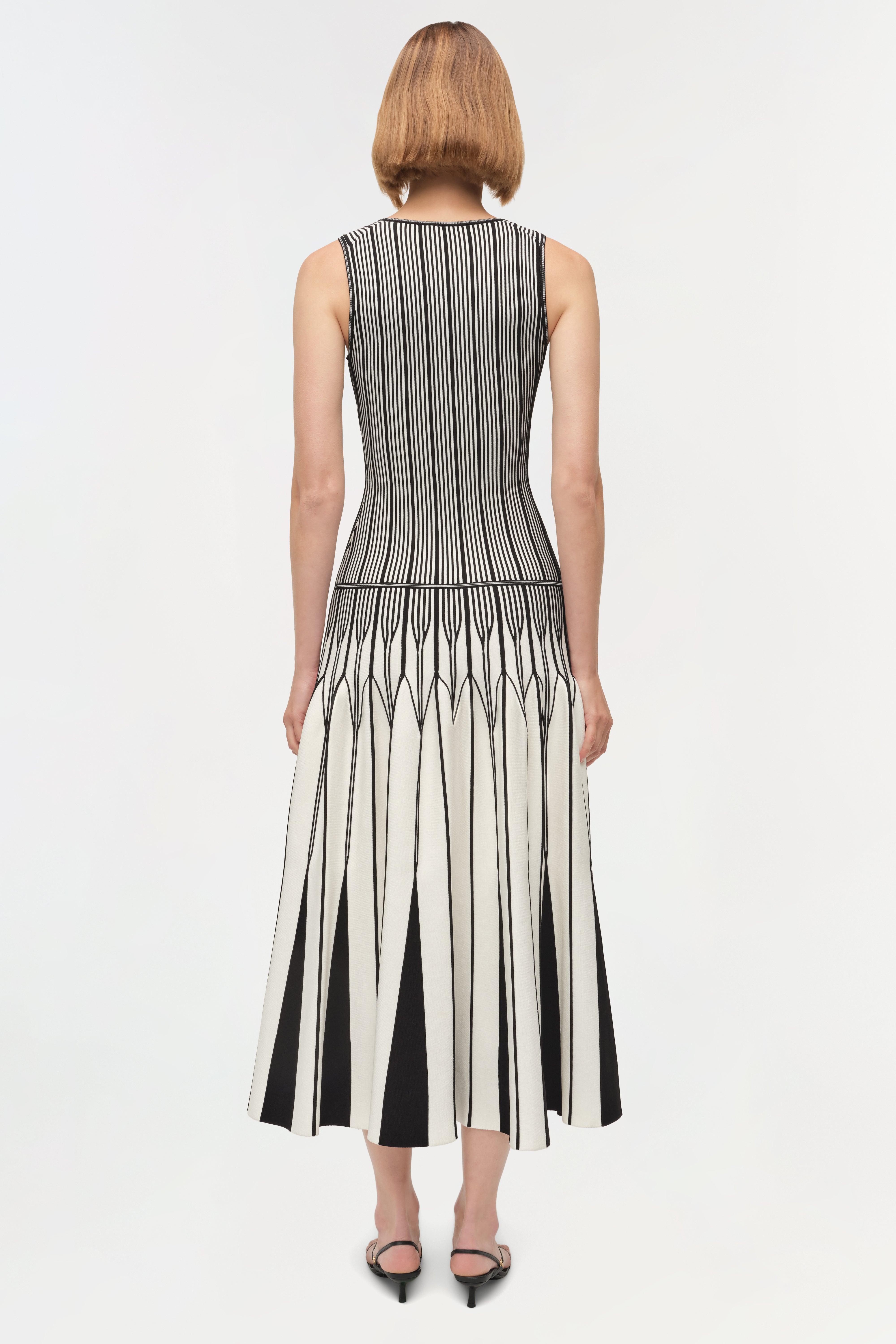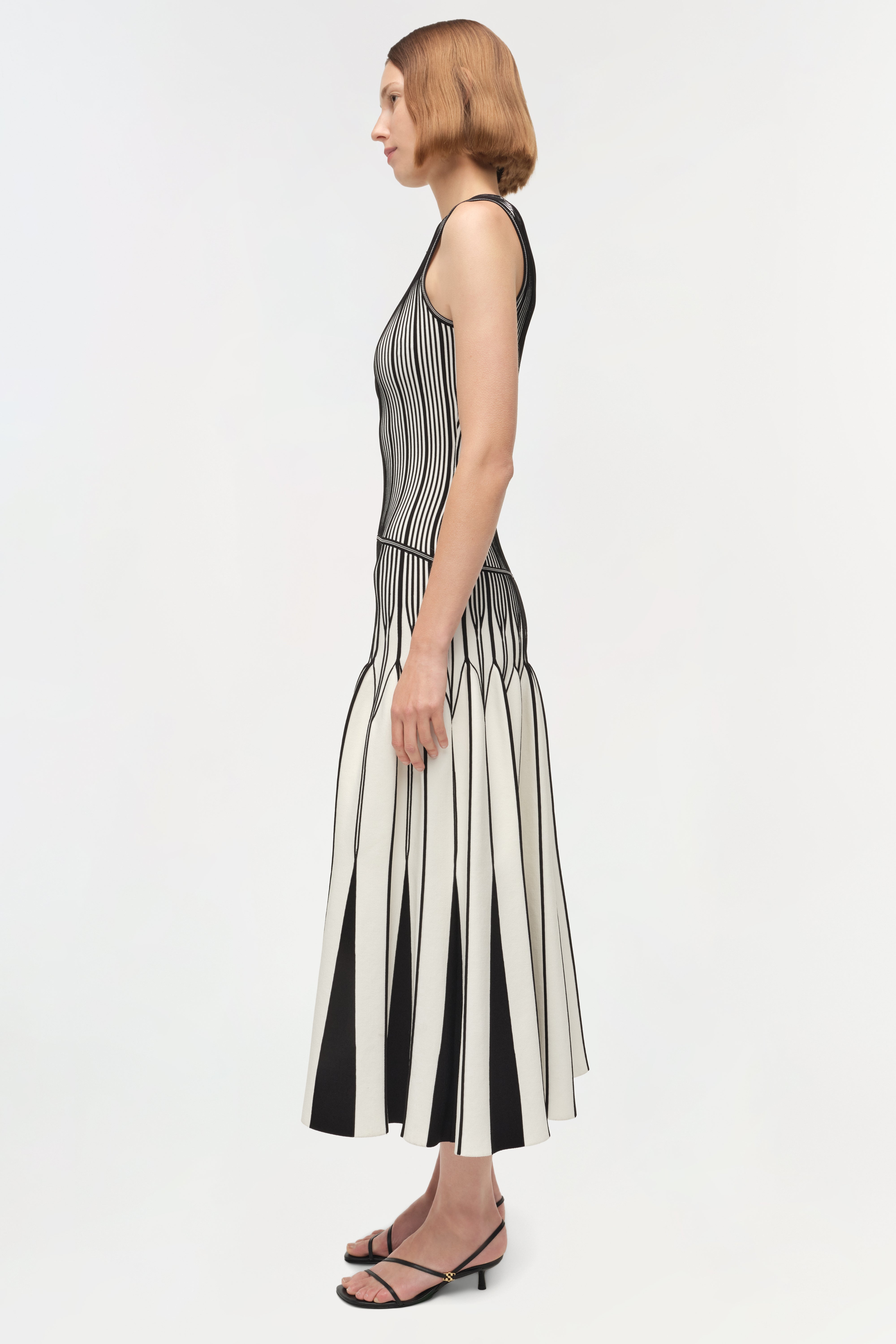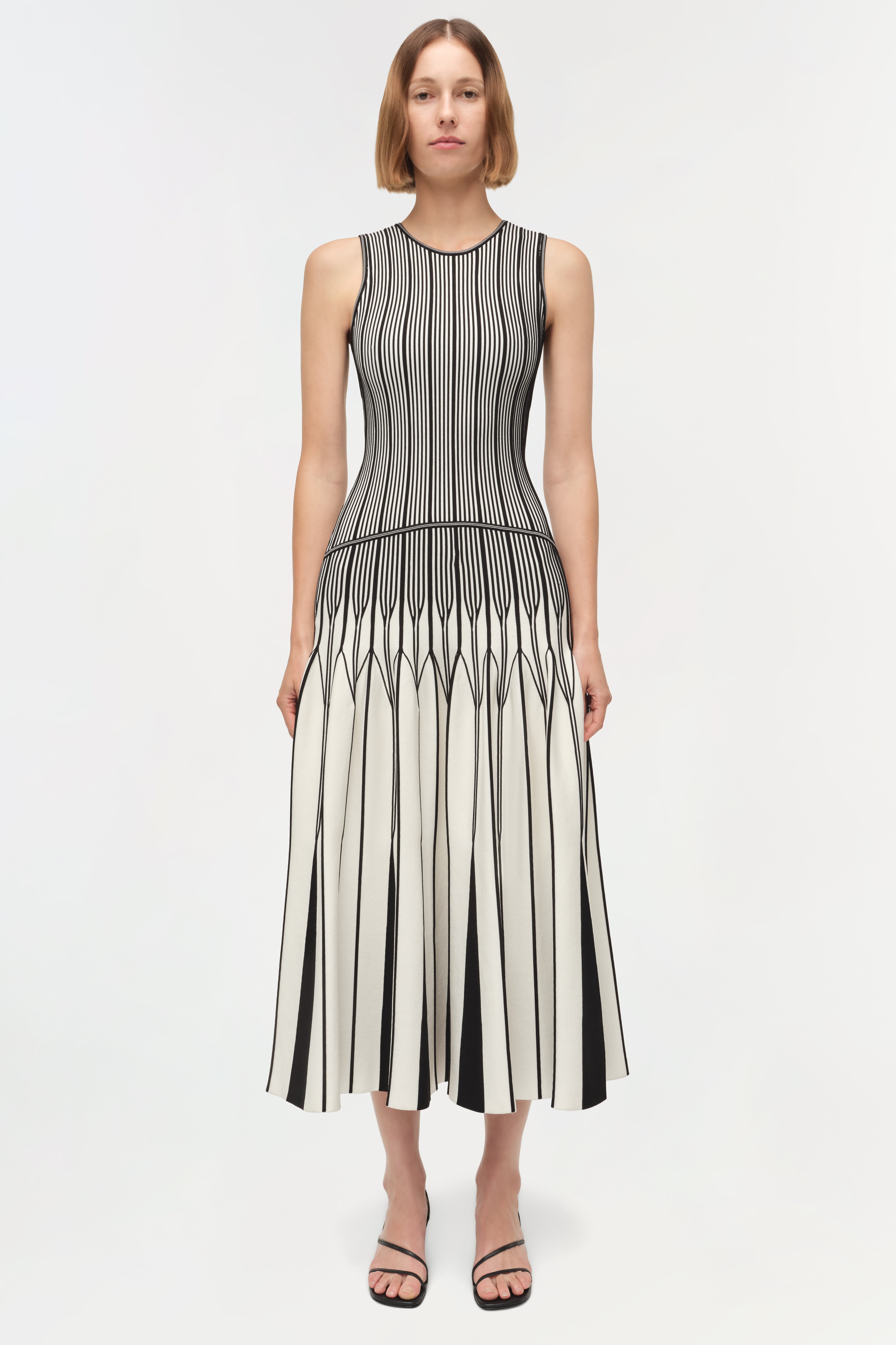 Knit in a compact construction, this sleeveless midi dress contours the body before releasing into a flared skirt. The engineered vertical lines create a precise, elongating effect. A streamlined silhouette defined by balance and movement.