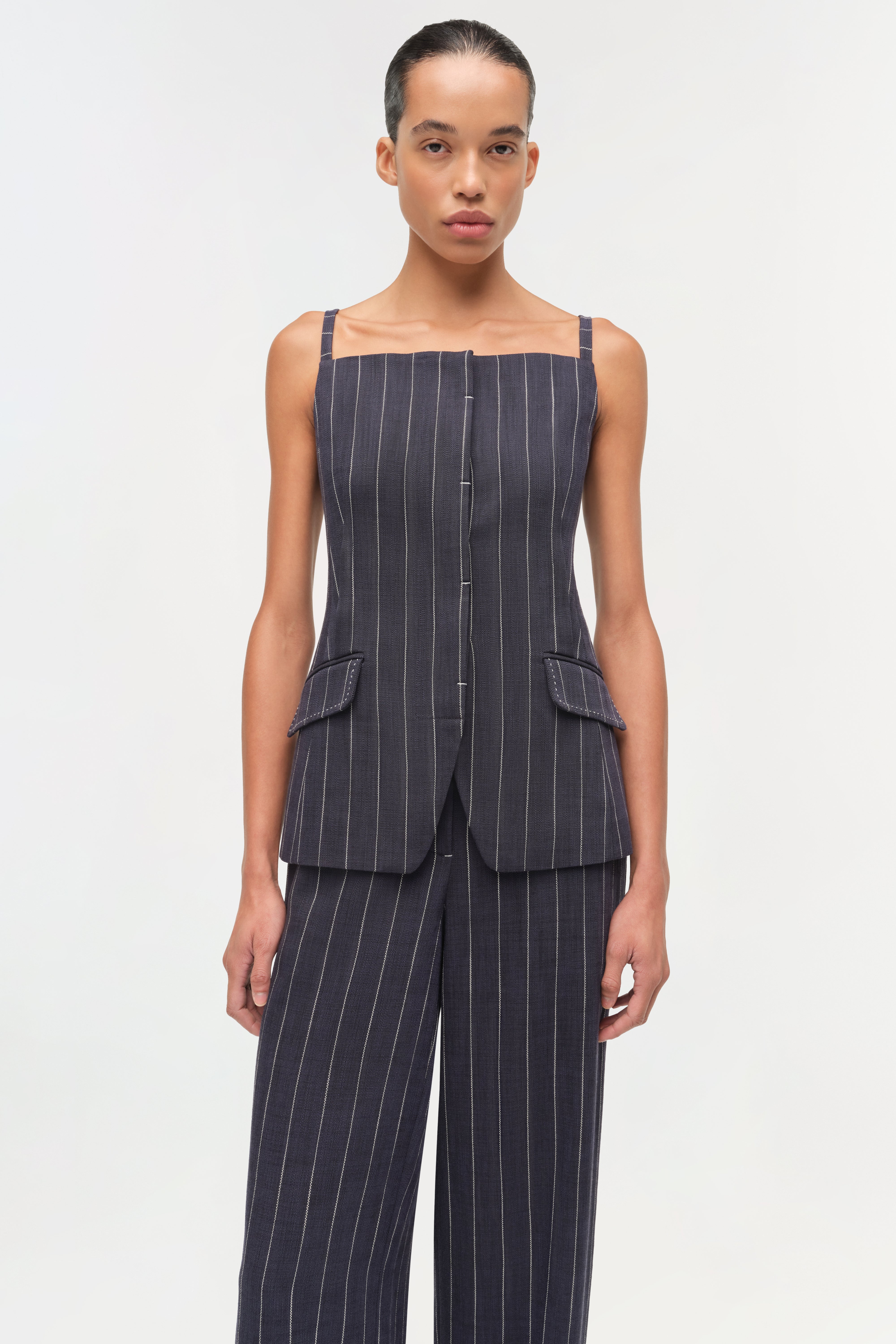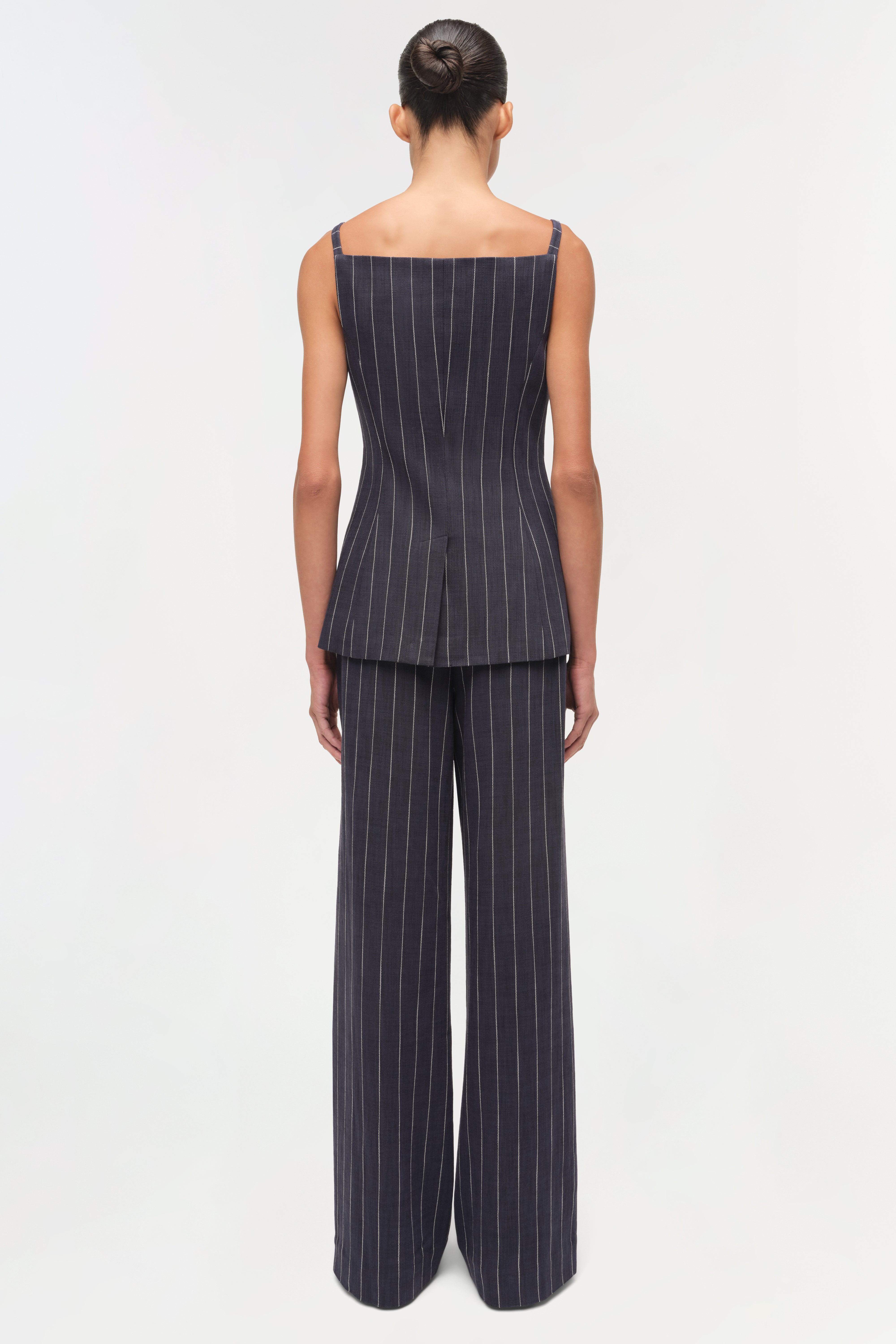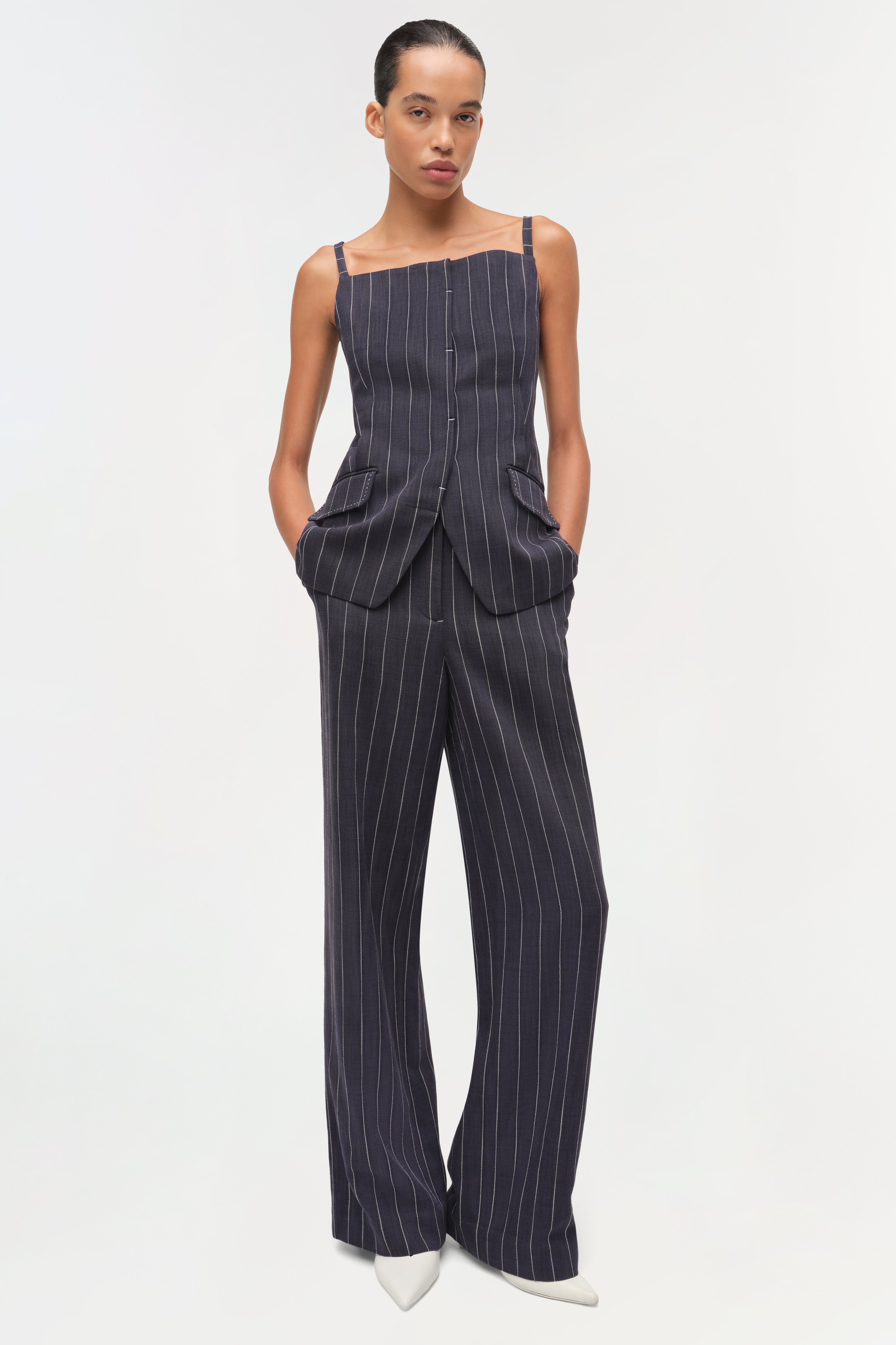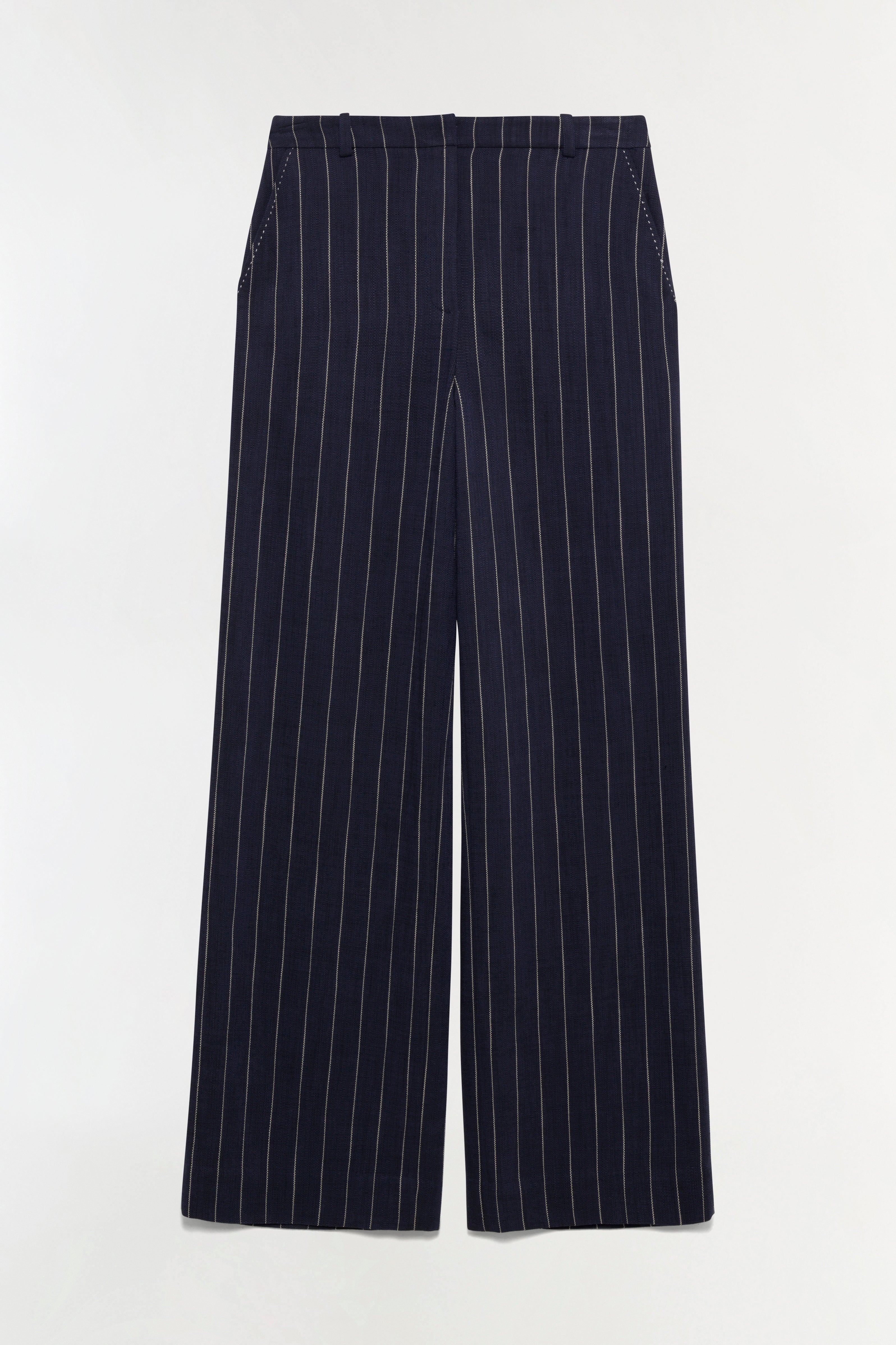 Cut from fine striped suiting, these trousers feature a structured waist and full, straight leg. The vertical lines draw the silhouette long and lean. Effortless tailoring with contemporary clarity.