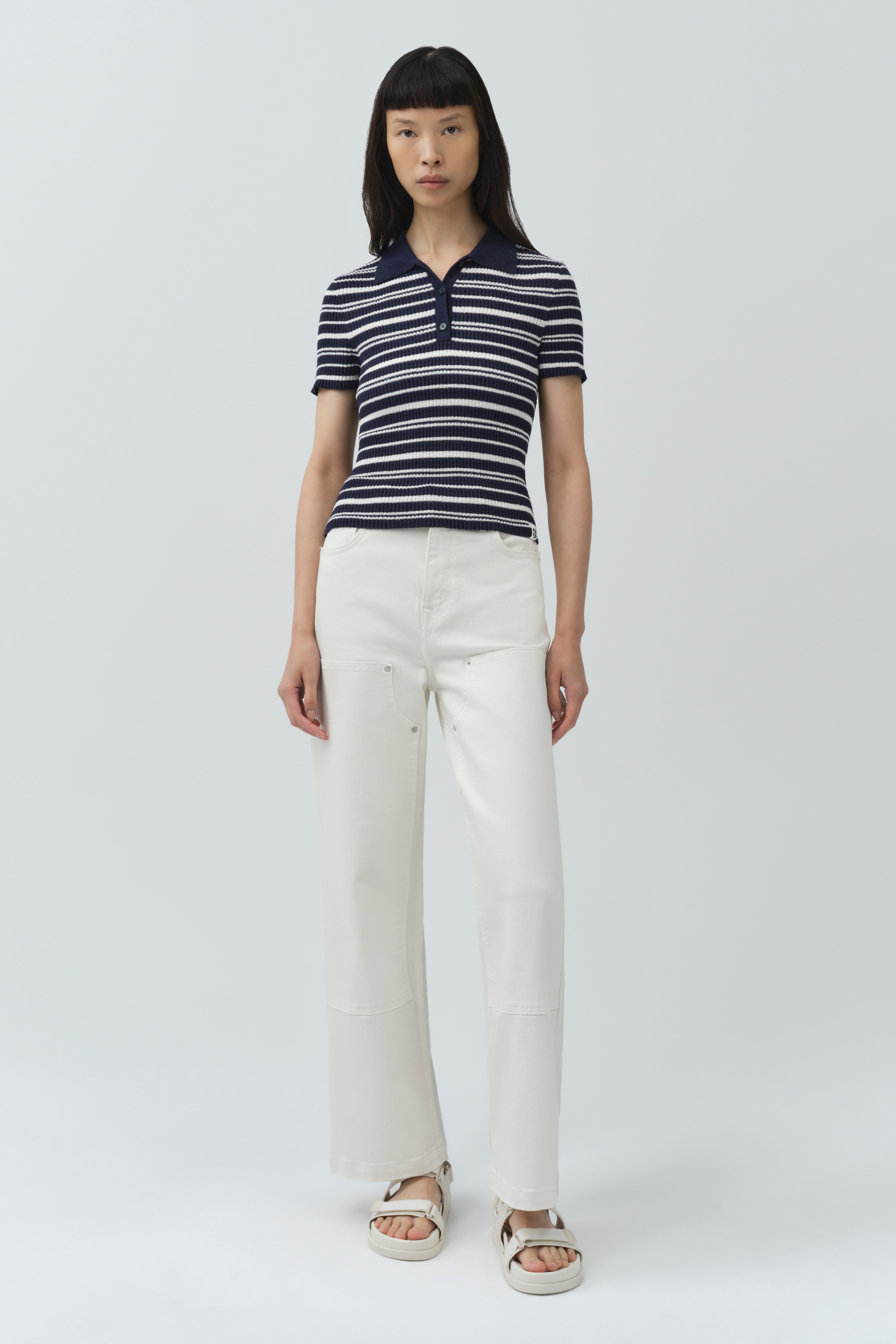 The Averie Knit Polo in Midnight Stripe. Knit in micro cotton boucle, this polo features a button-up closure, classic collar, and a streamlined silhouette.
