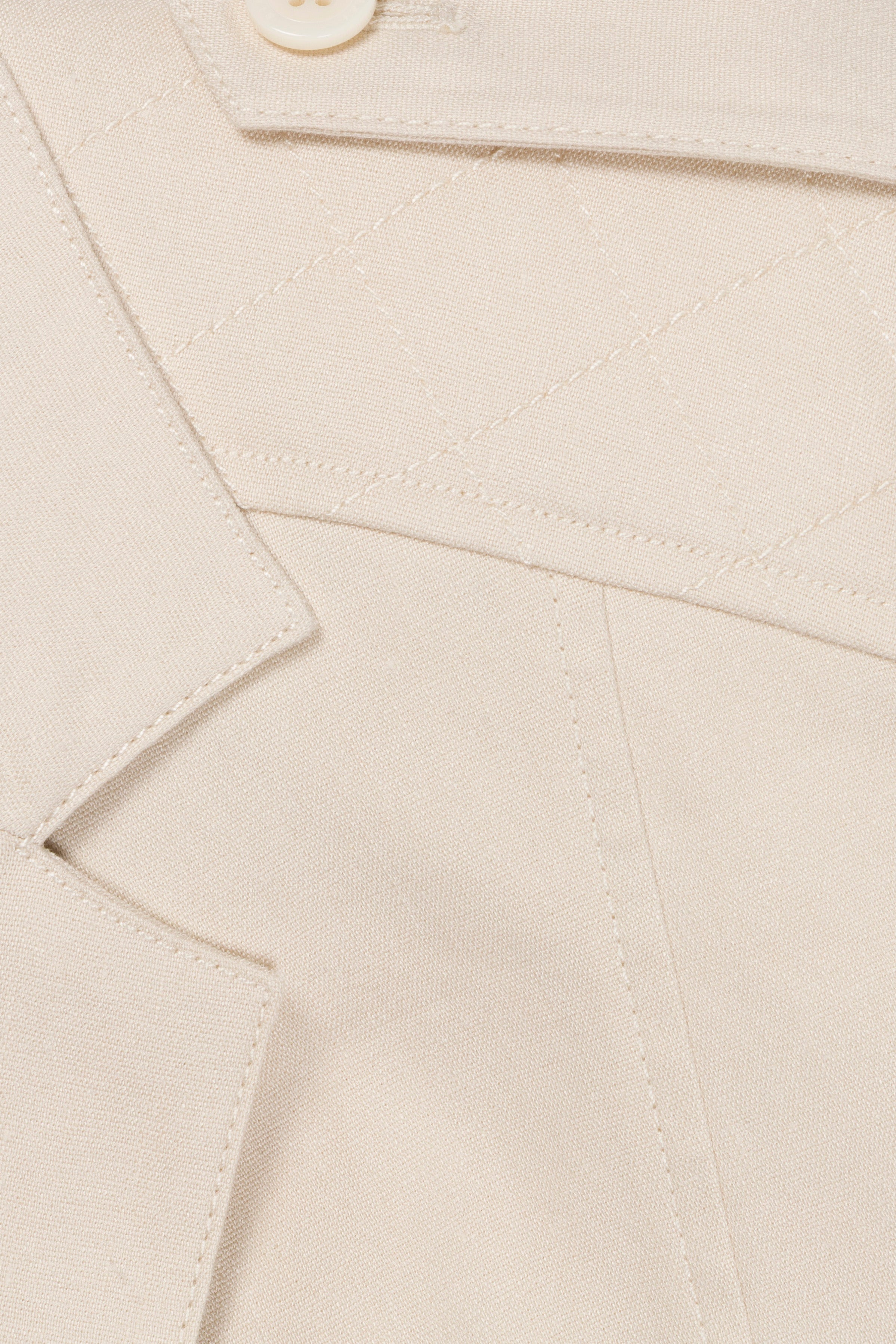 The York Cropped Linen Vest in Sand. Crafted from linen, this cropped vest features a tailored fit with soft shoulder padding for subtle structure. Epaulettes at the shoulder and quilted detailing along the back lend a modern utility influence with a clean, polished finish.