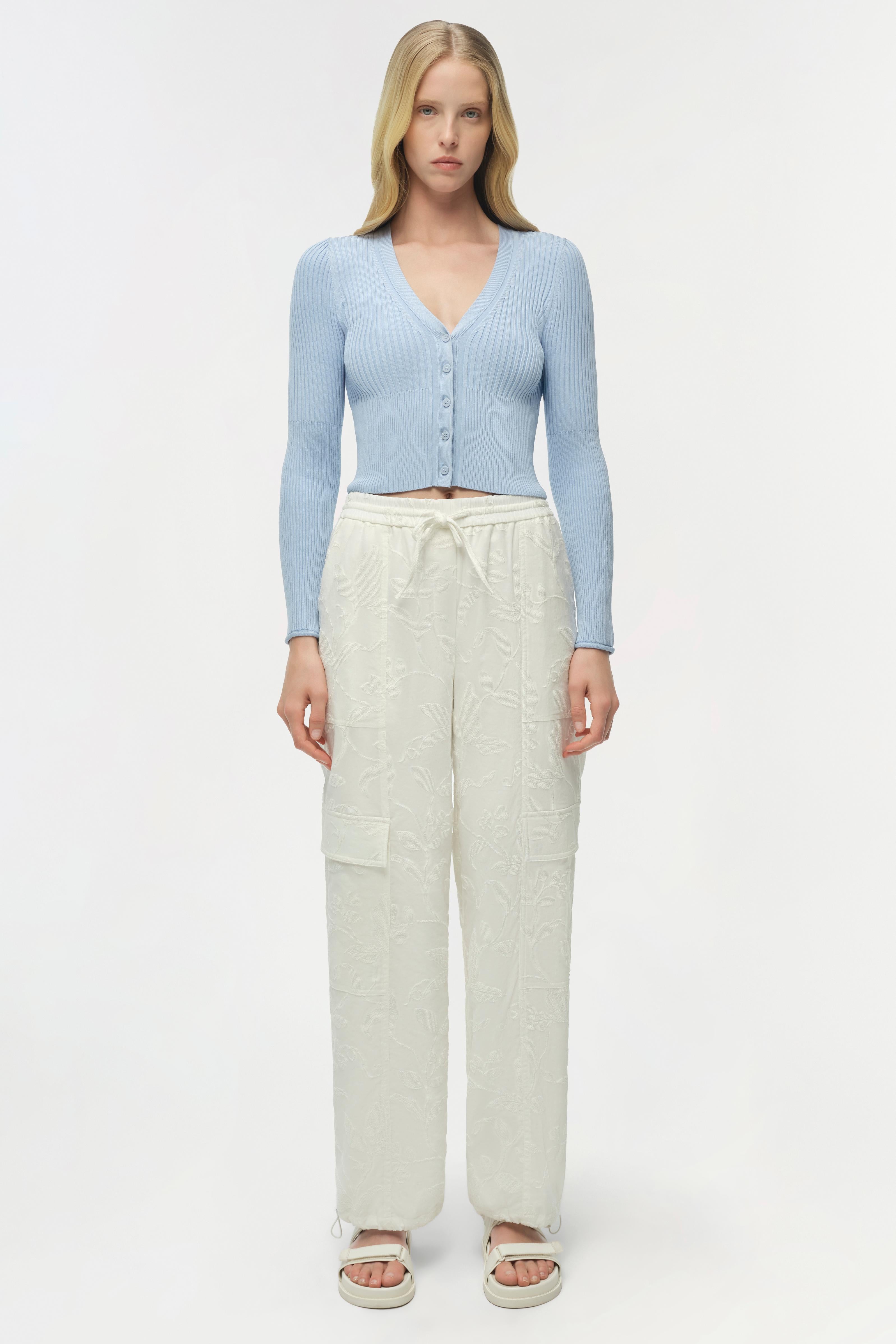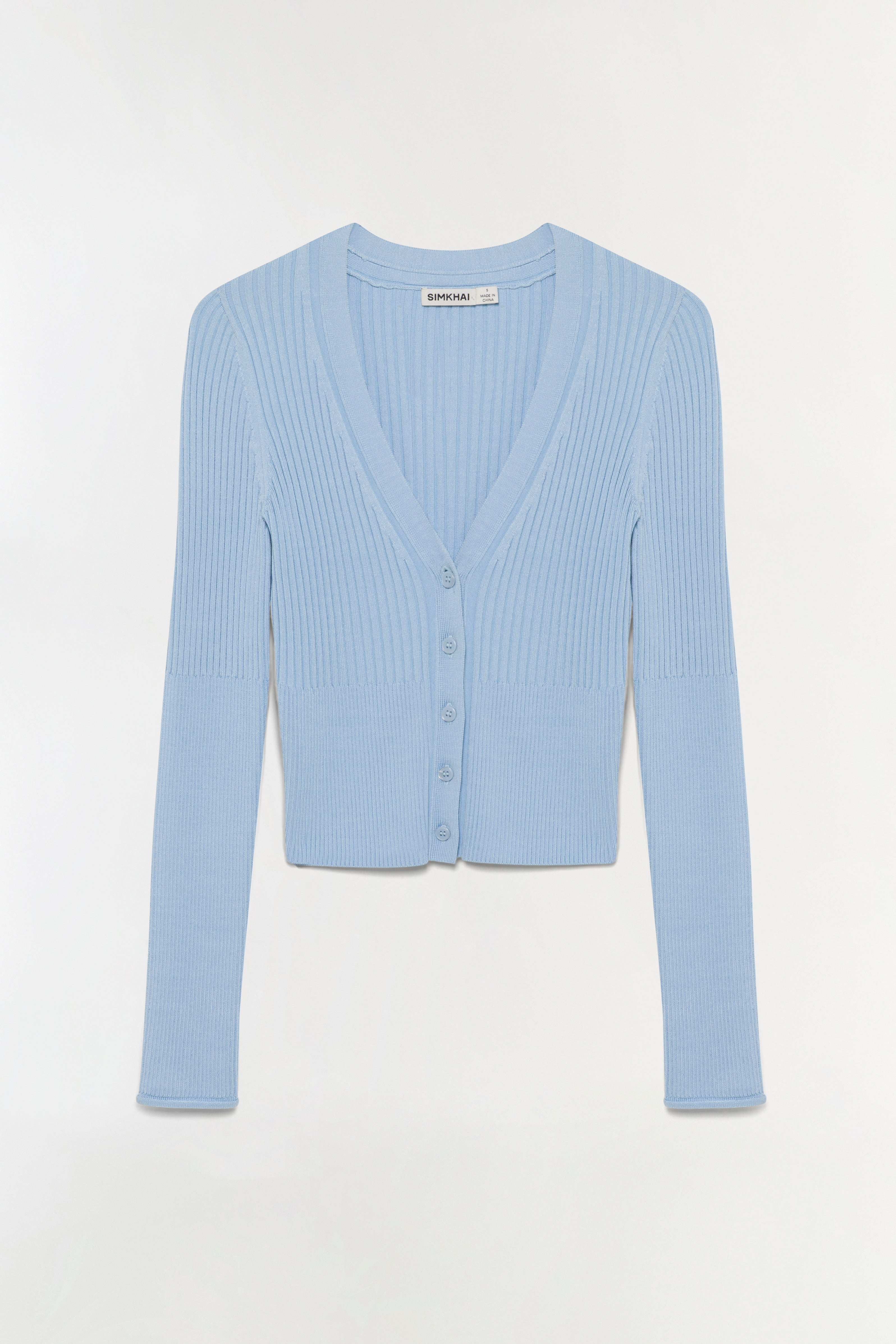 The Ailany Knit Cardigan in Tidepool. Crafted in compact rib knit, this fitted shrunken cardigan features a streamlined silhouette with button-front detailing. Its cropped length makes it an ideal partner to high-waisted trousers, creating a harmonious balance between cozy and chic.