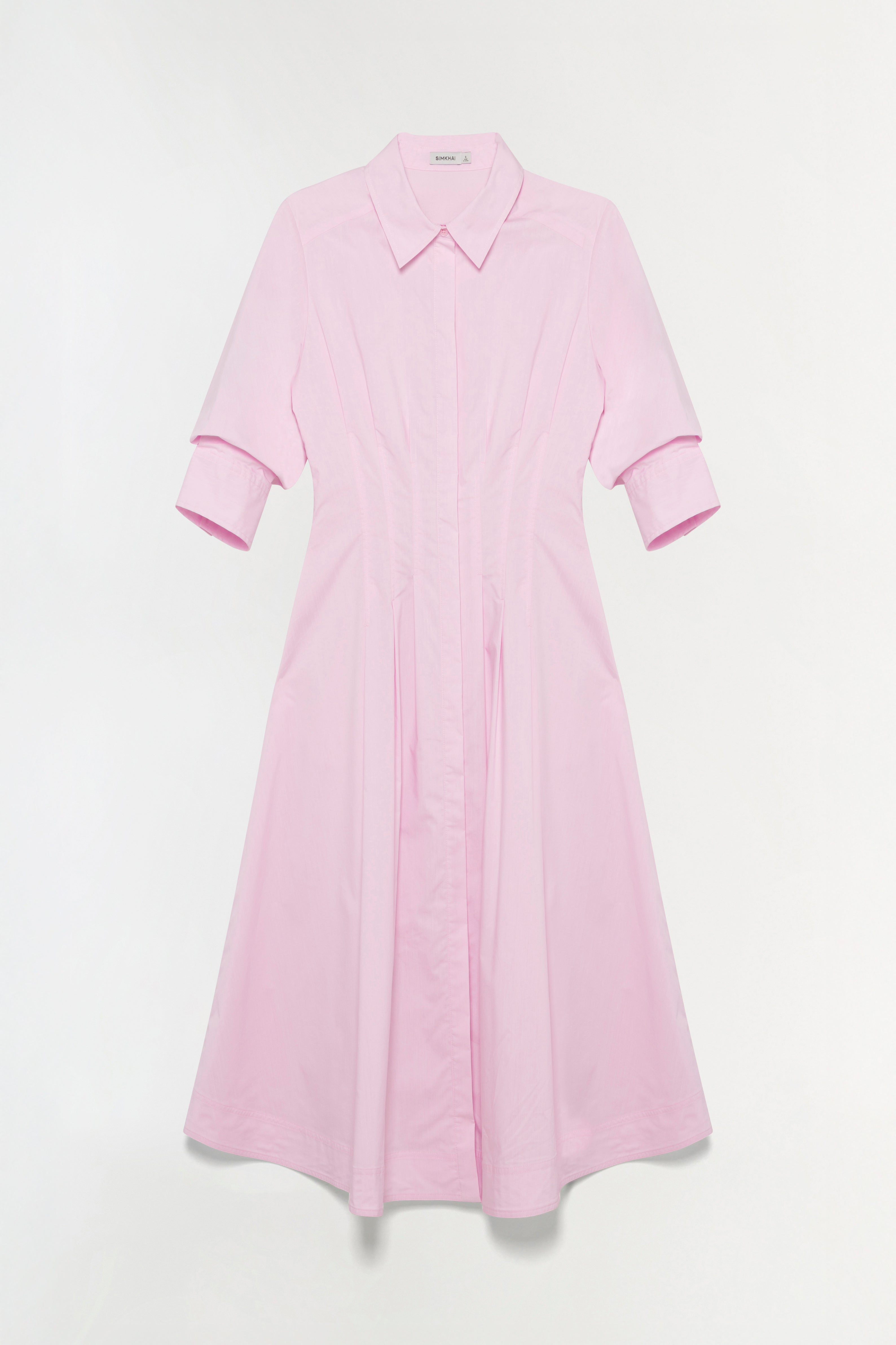 The Jazz Pintuck Midi Dress in Tulip. This polished pintuck midi, crafted from crisp cotton poplin features a defined waist, structured collar, and a flowing A-line silhouette.