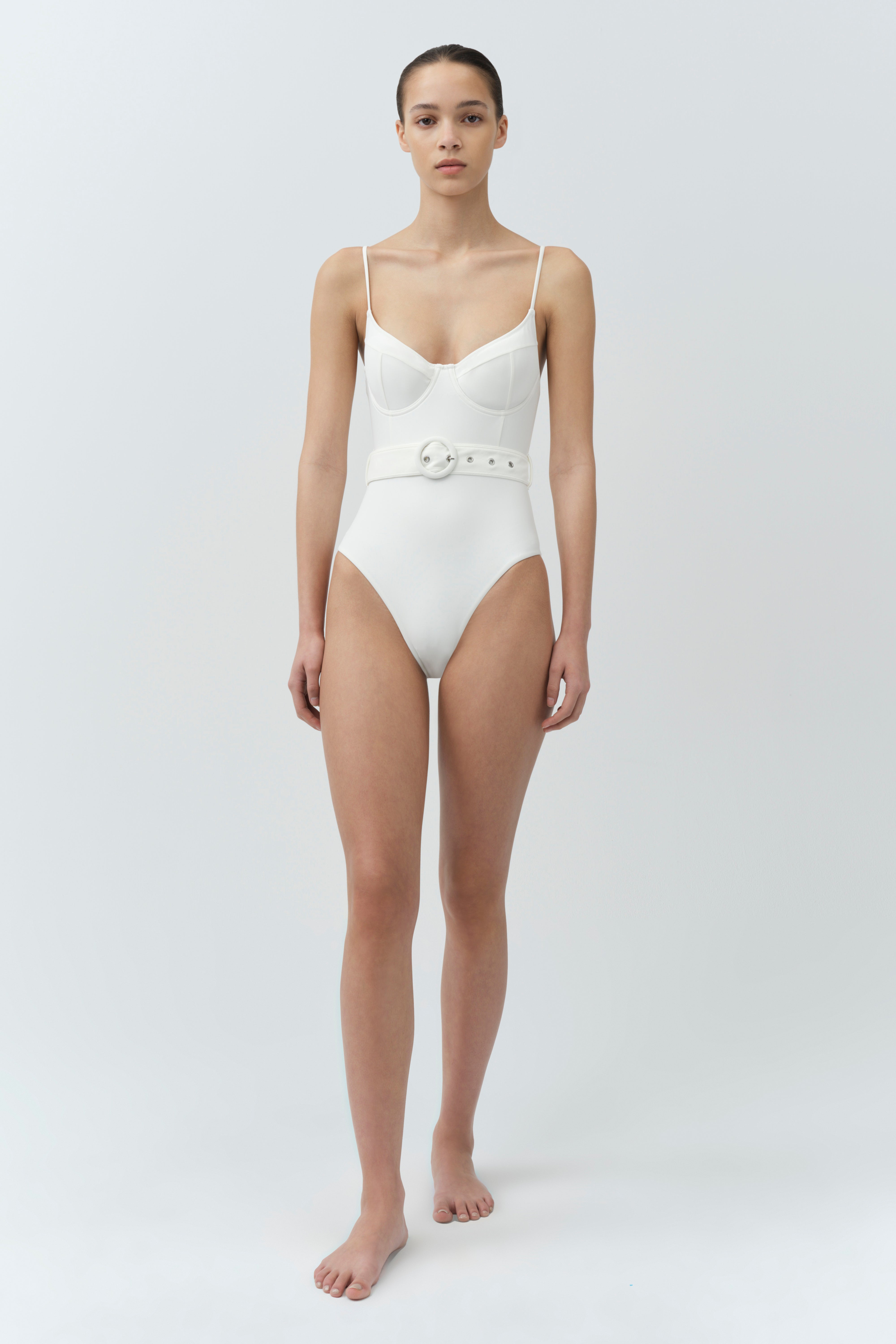 Our Signature Noa Swimsuit in White. Slimming one-piece swimsuit, with sweetheart neckline, boned bustier underwire and tonal belted waist.