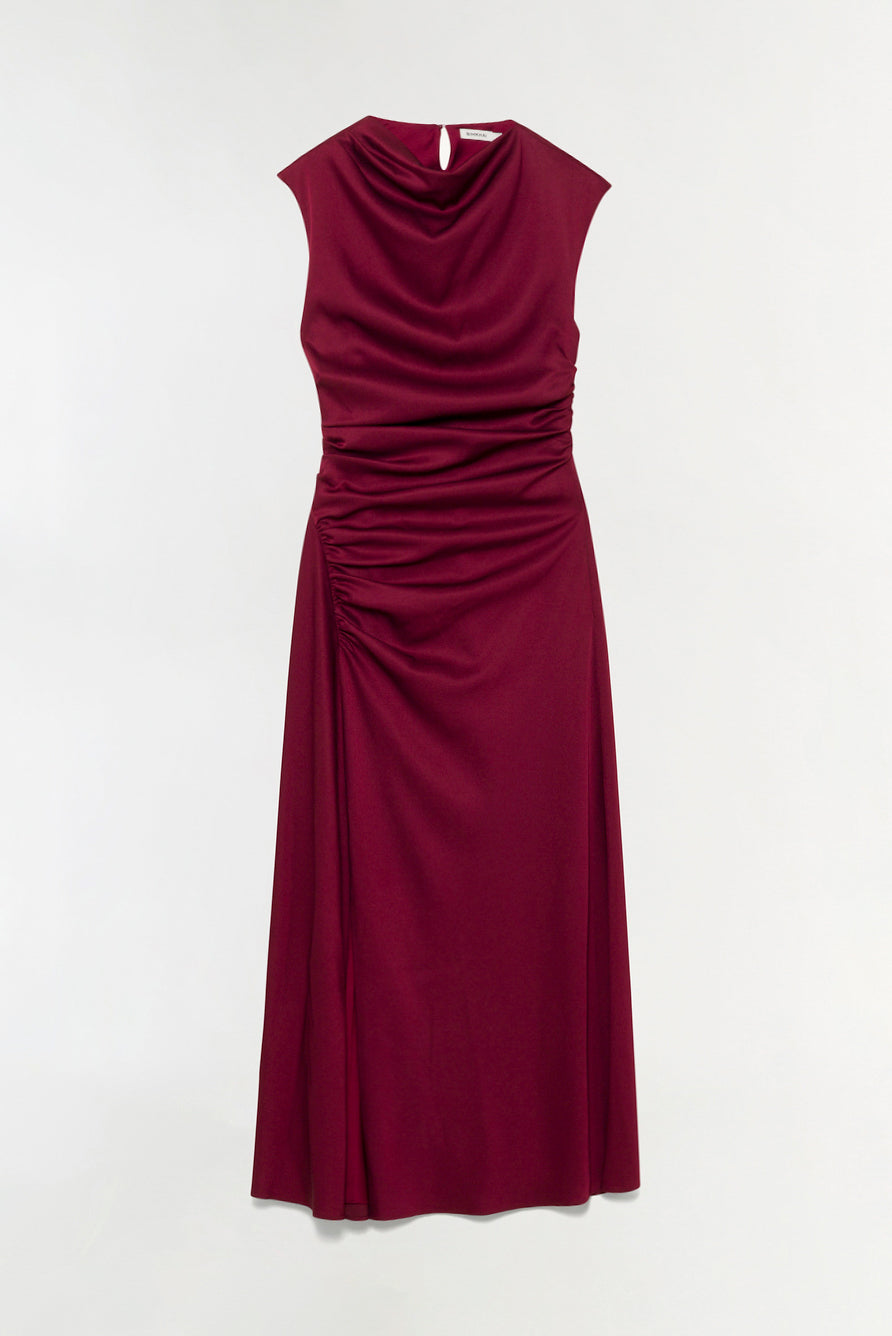 This satin midi dress is cut with a fluid draped neckline that frames the shoulders with ease. Gentle gathering shapes the waist, creating soft texture through the bodice. A side slit adds movement, balancing structure with fluidity.