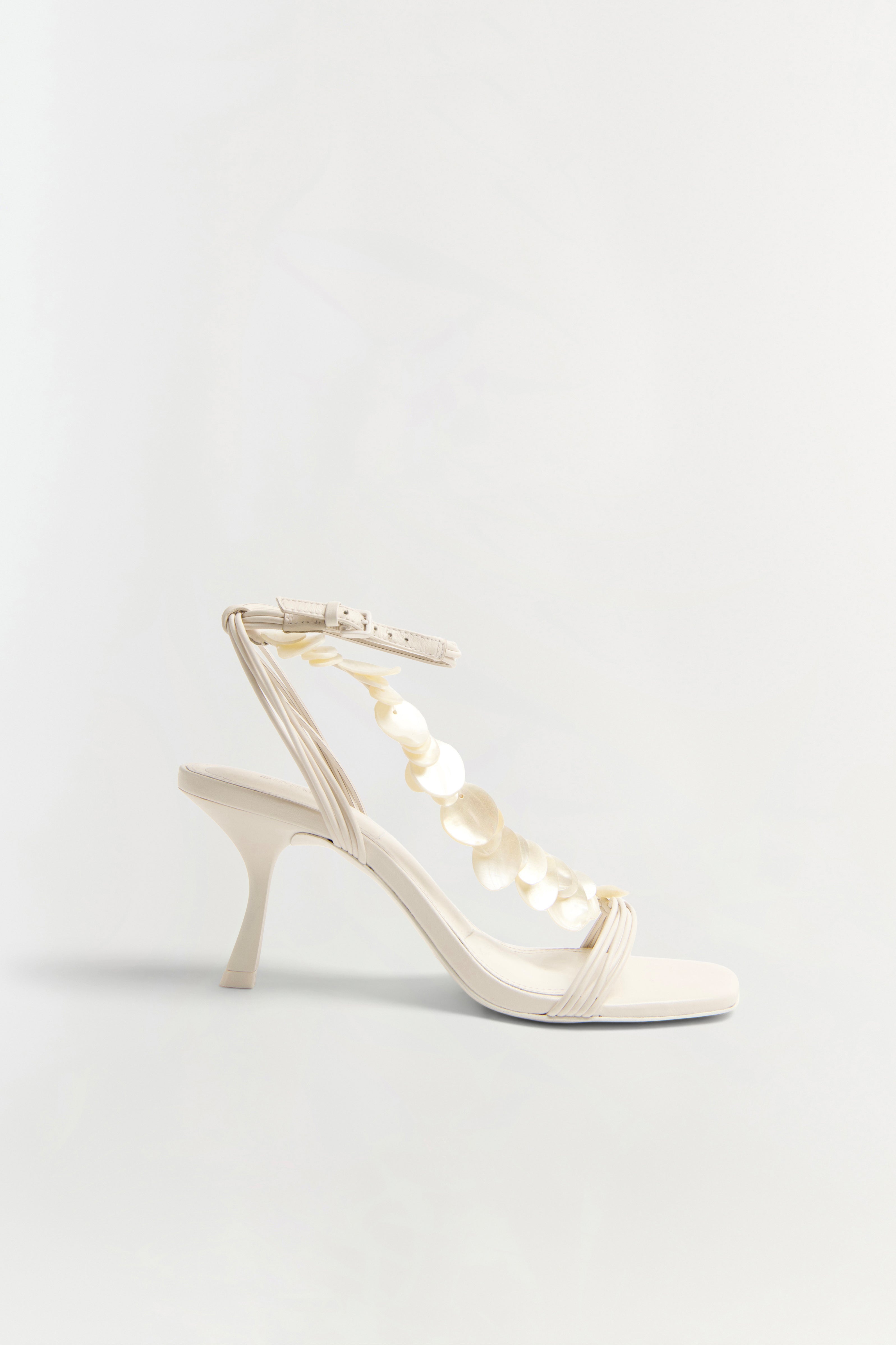 The Elin Shell Beaded Strappy Heel in Alabaster. This ankle-strap heel is accented with shell embellishments along the front, adding texture and elevated sophistication.