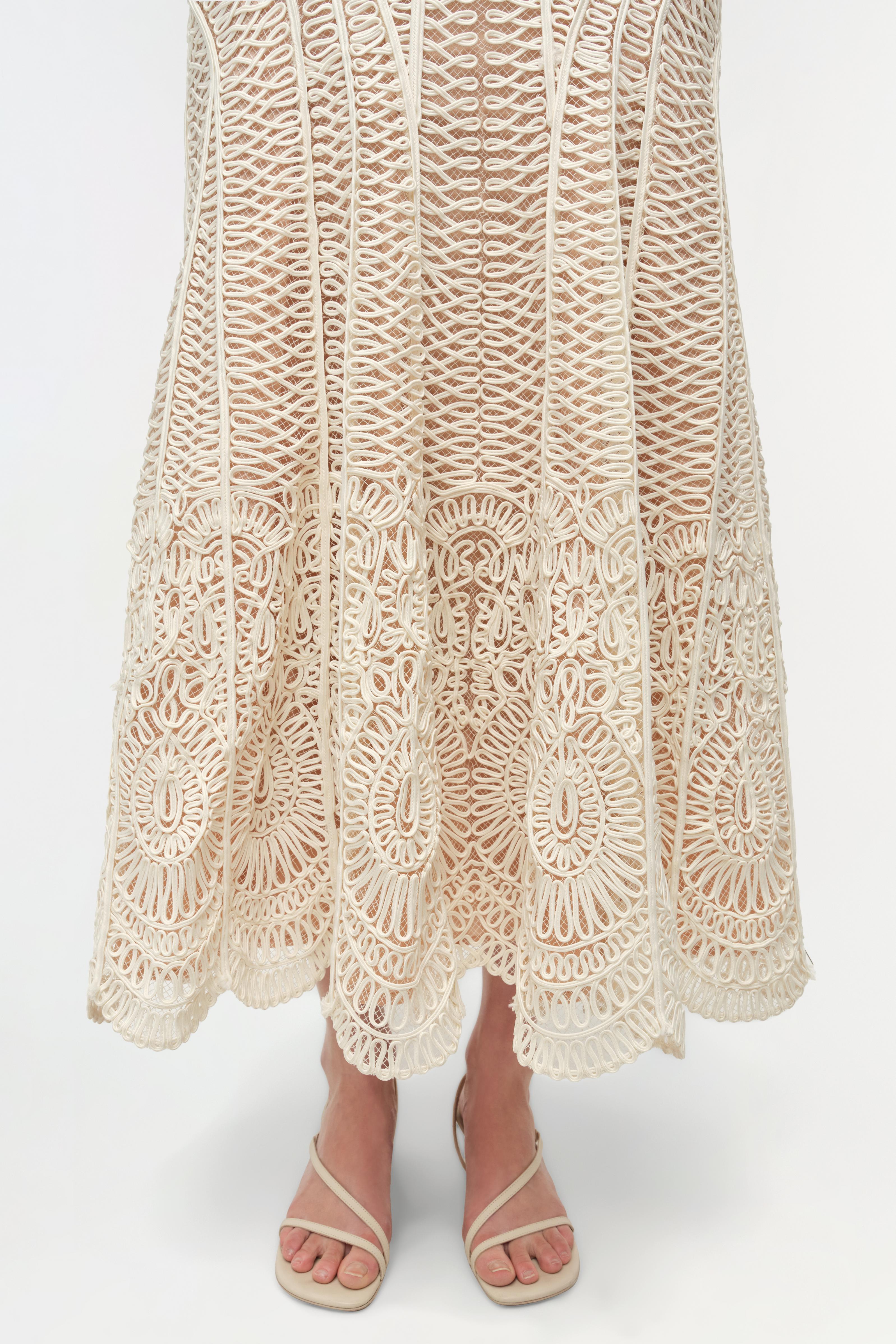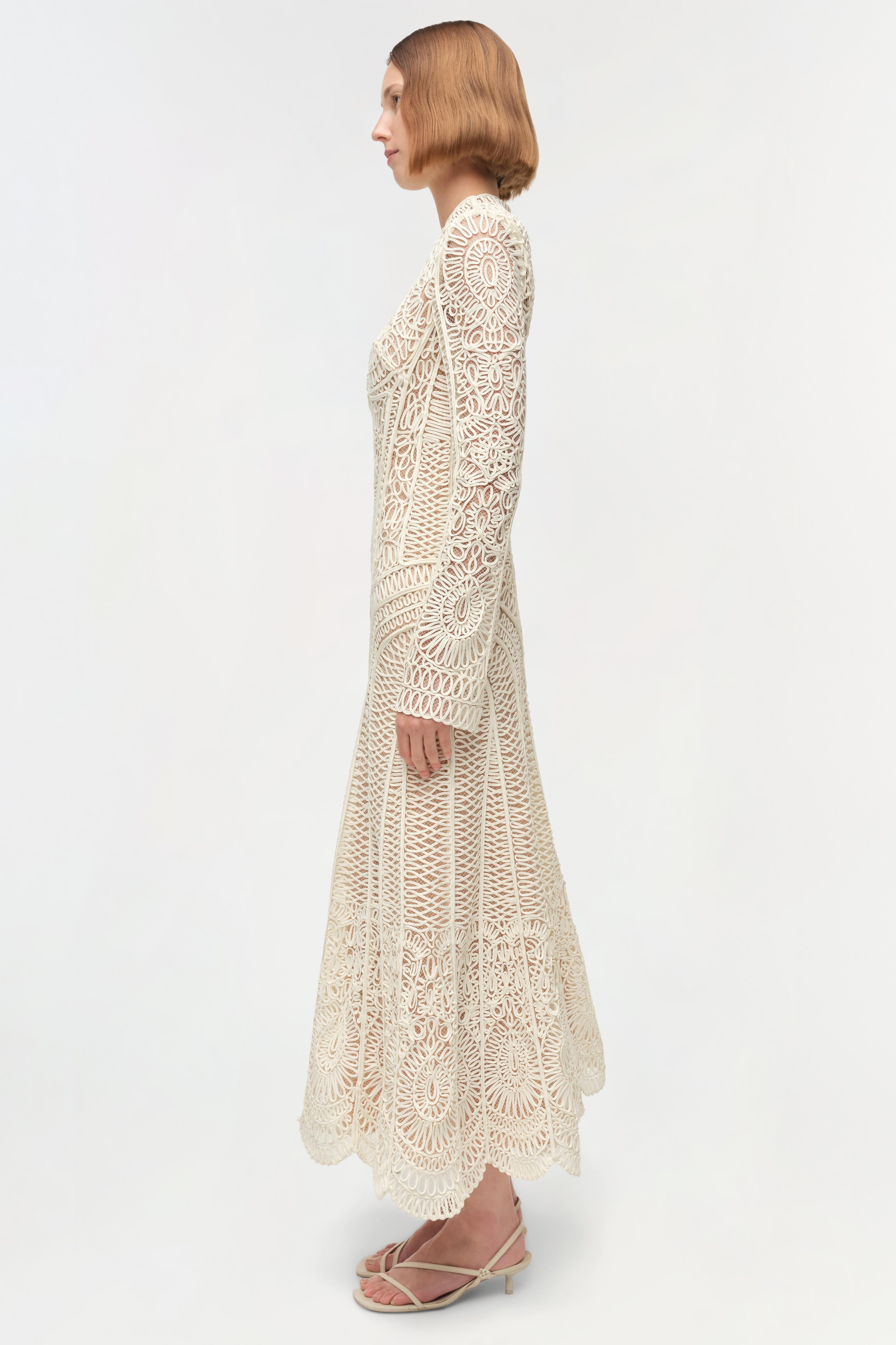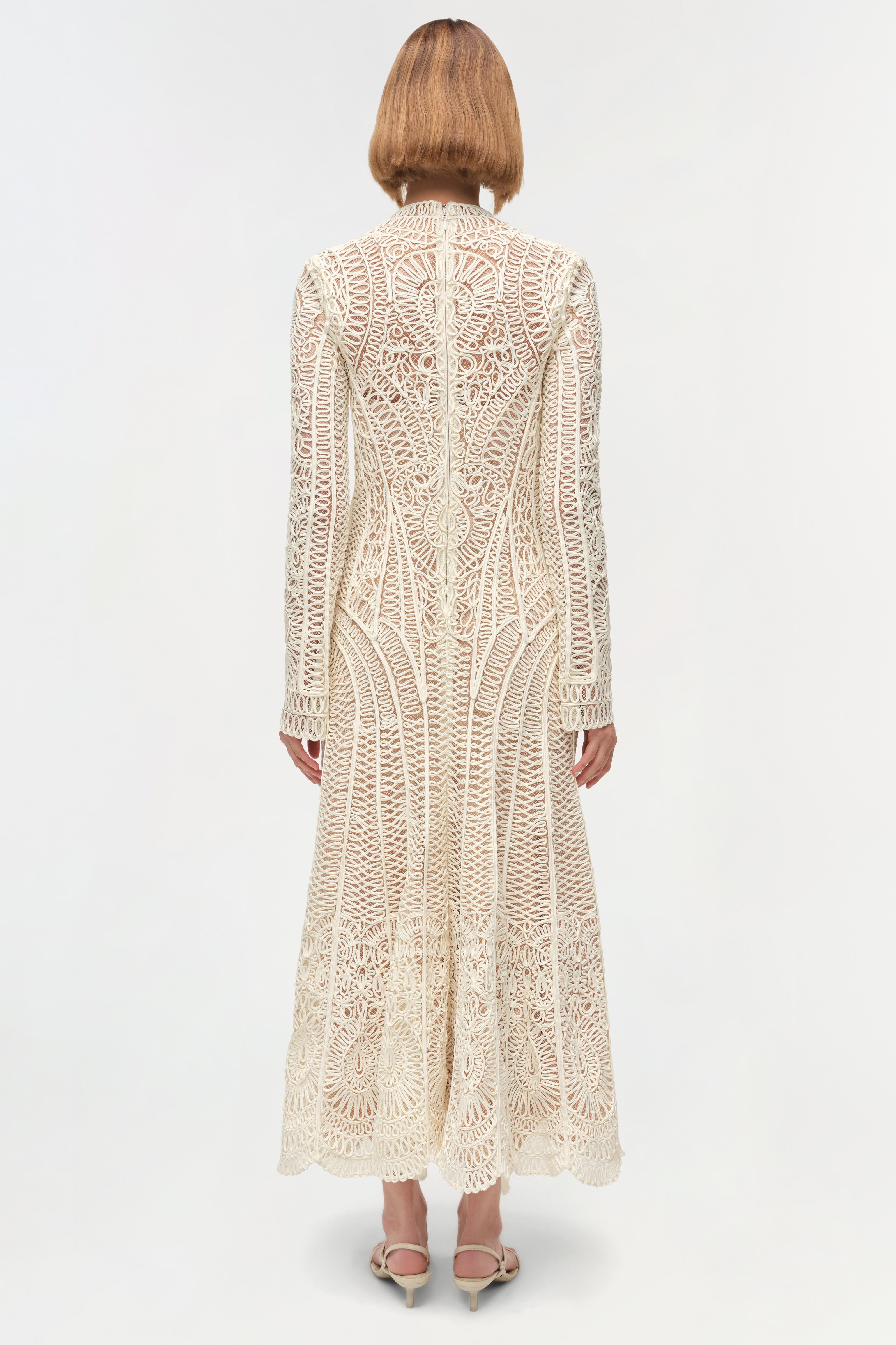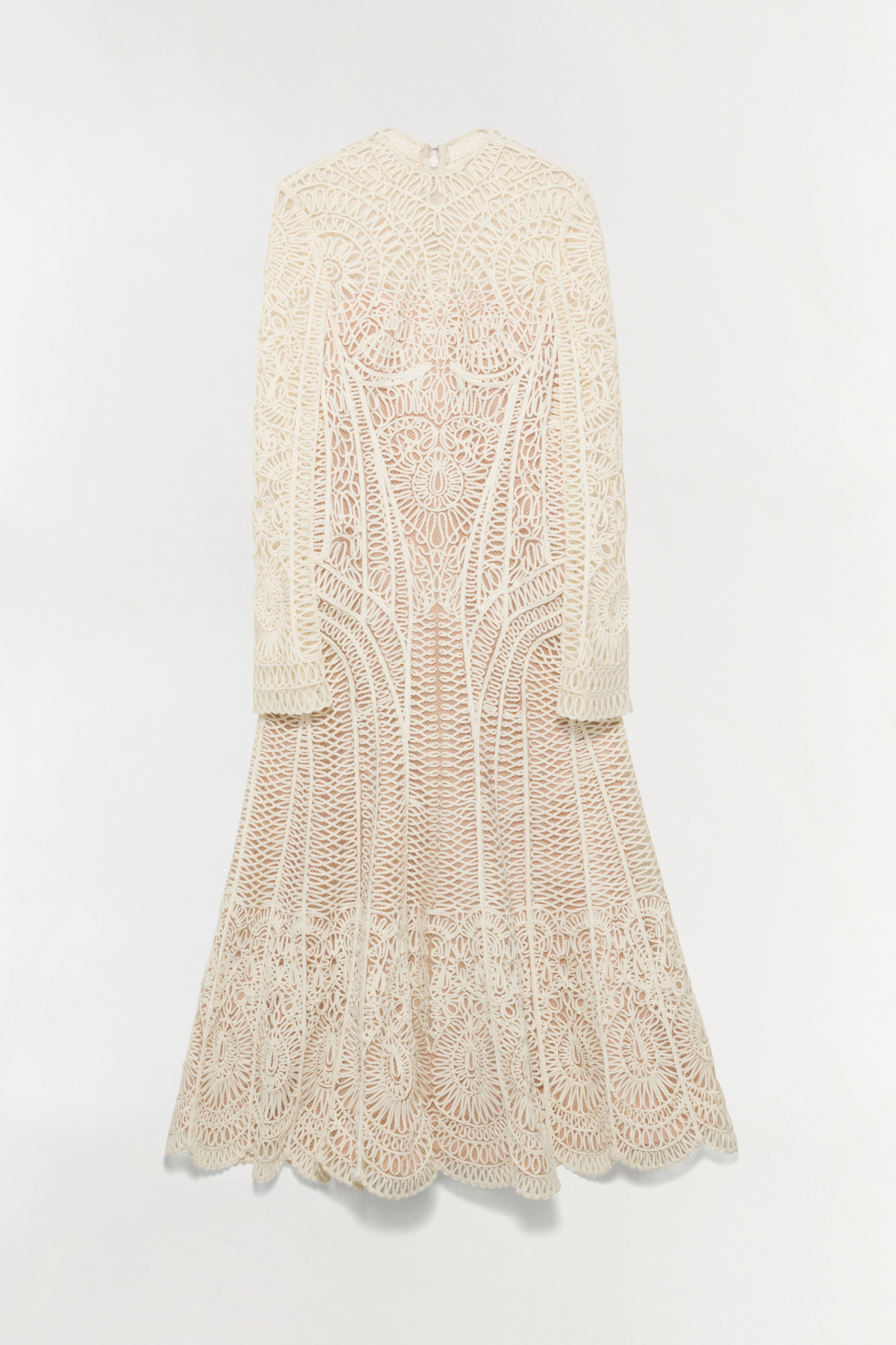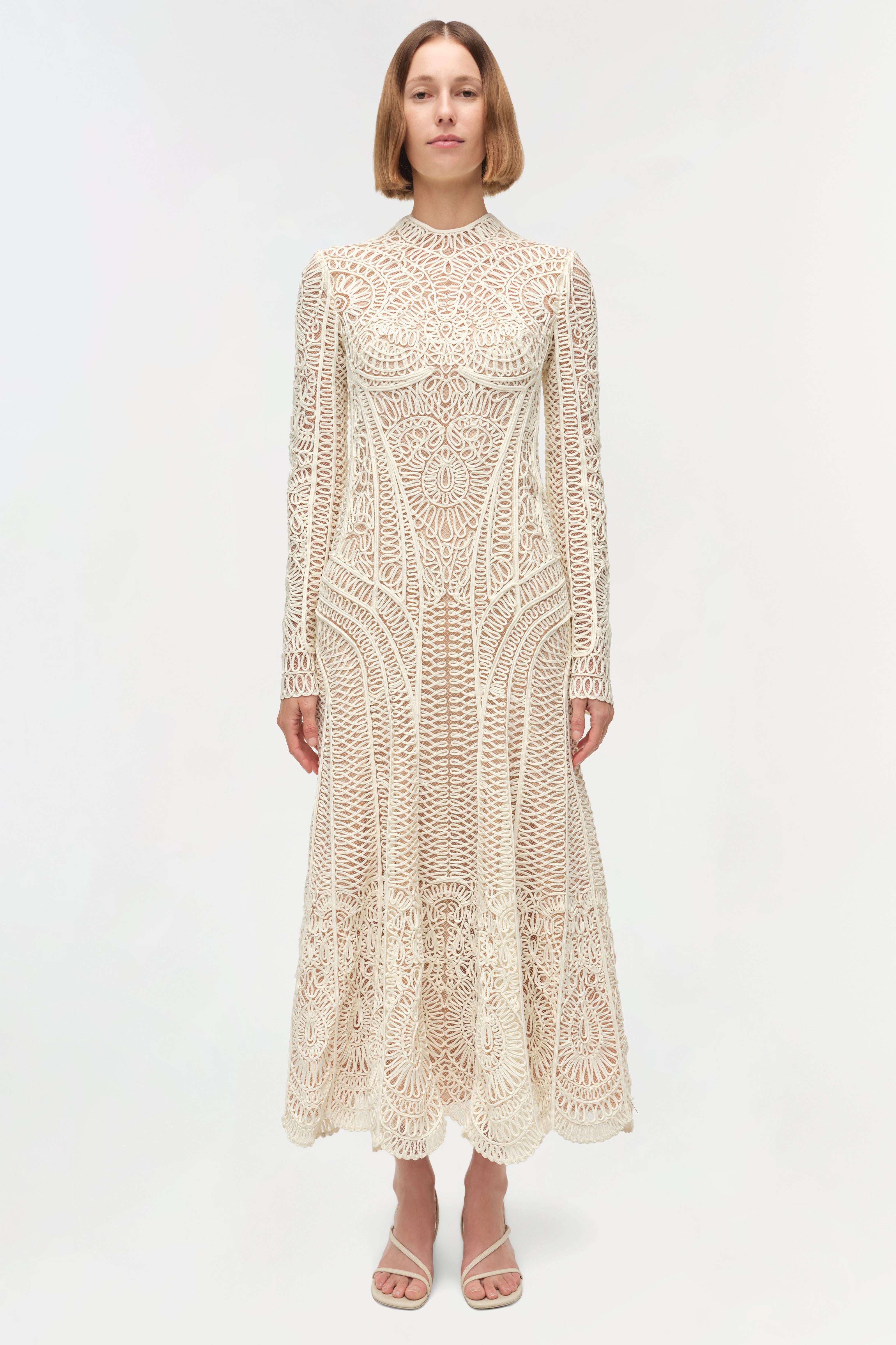Crafted in an intricate guipure lace, this midi dress skims the body and eases into a soft A-line skirt. This delicate pattern and precise construction create an elegant and unforgettable look.
