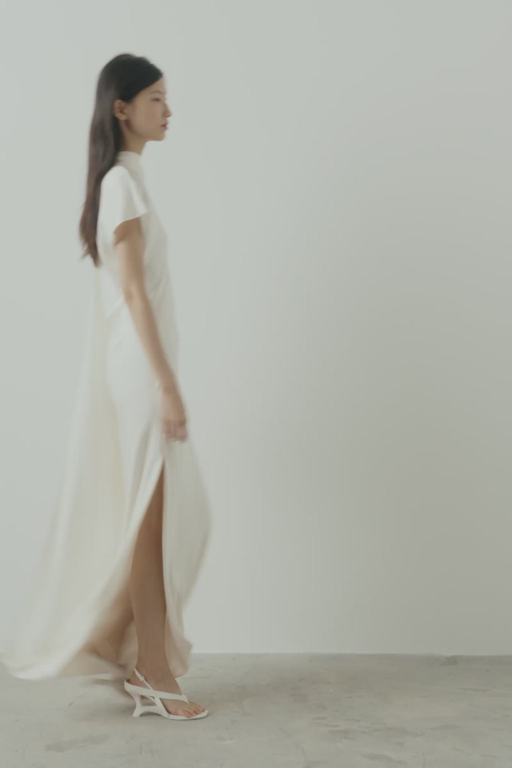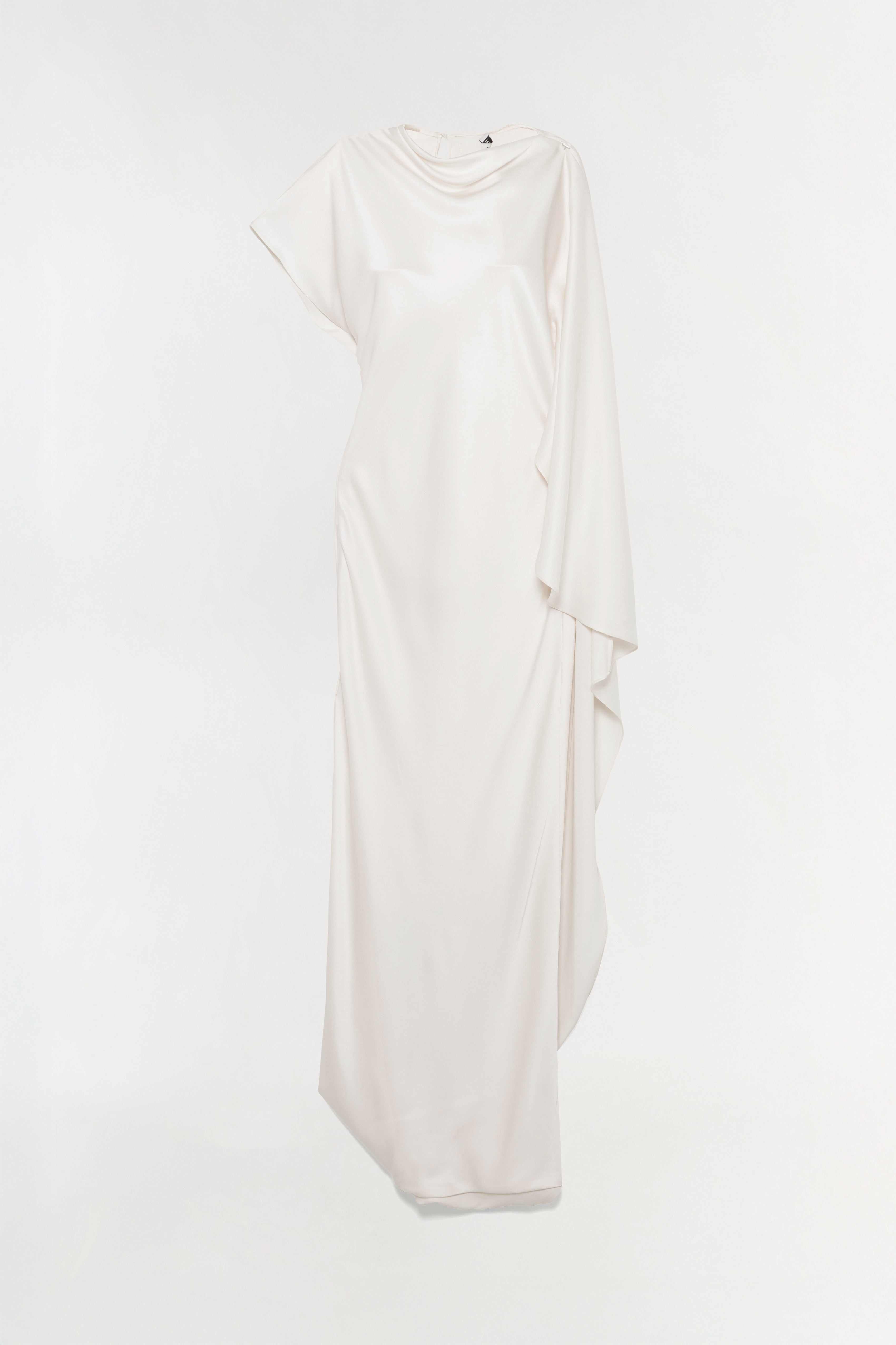 The Ora Satin Gown in Ivory. This woven satin gown features an asymmetrical long sleeve, with cascading folds that form a striking, cape-like silhouette from shoulder to hem. This dress combines movement with statuesque presence.