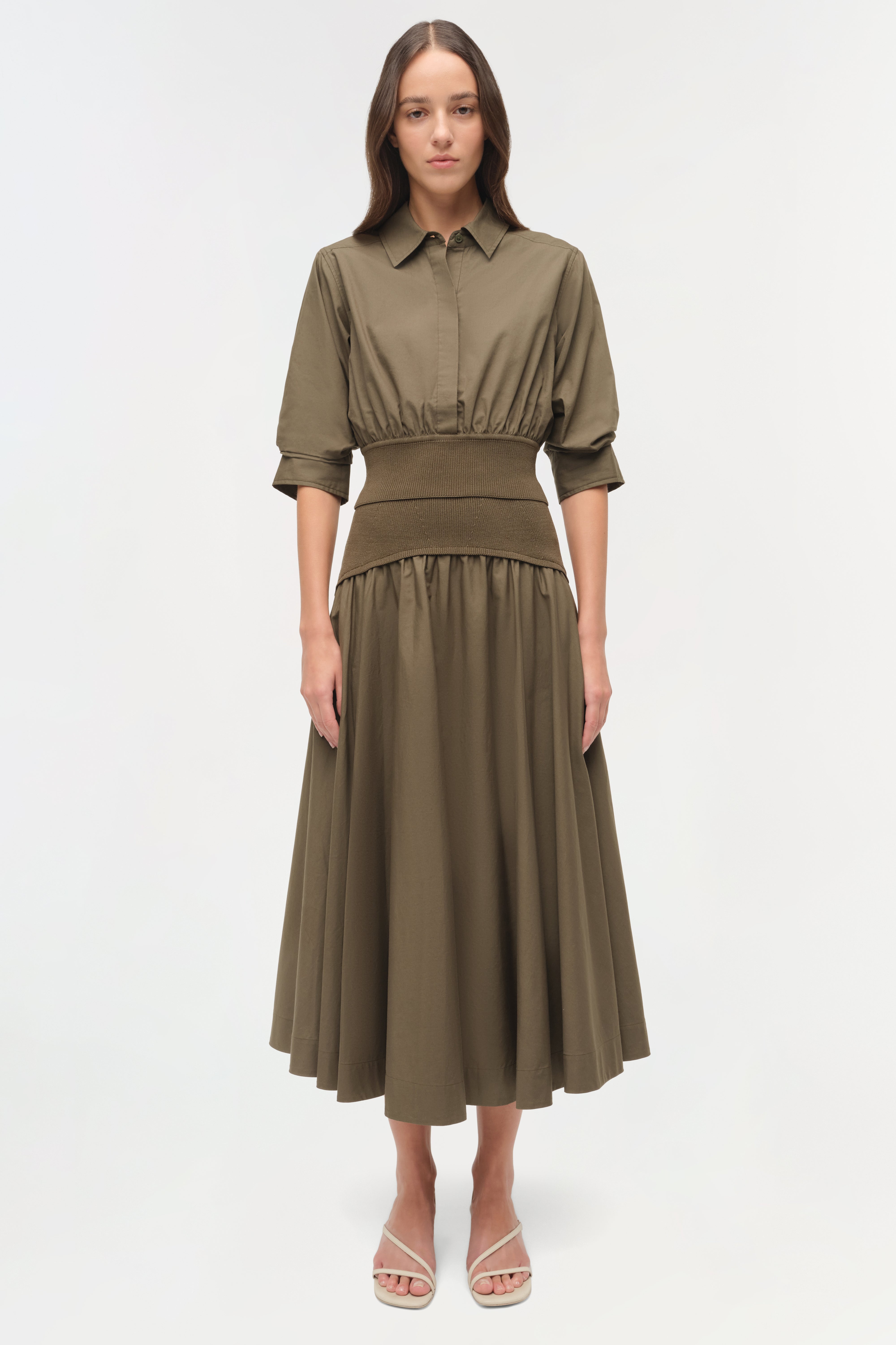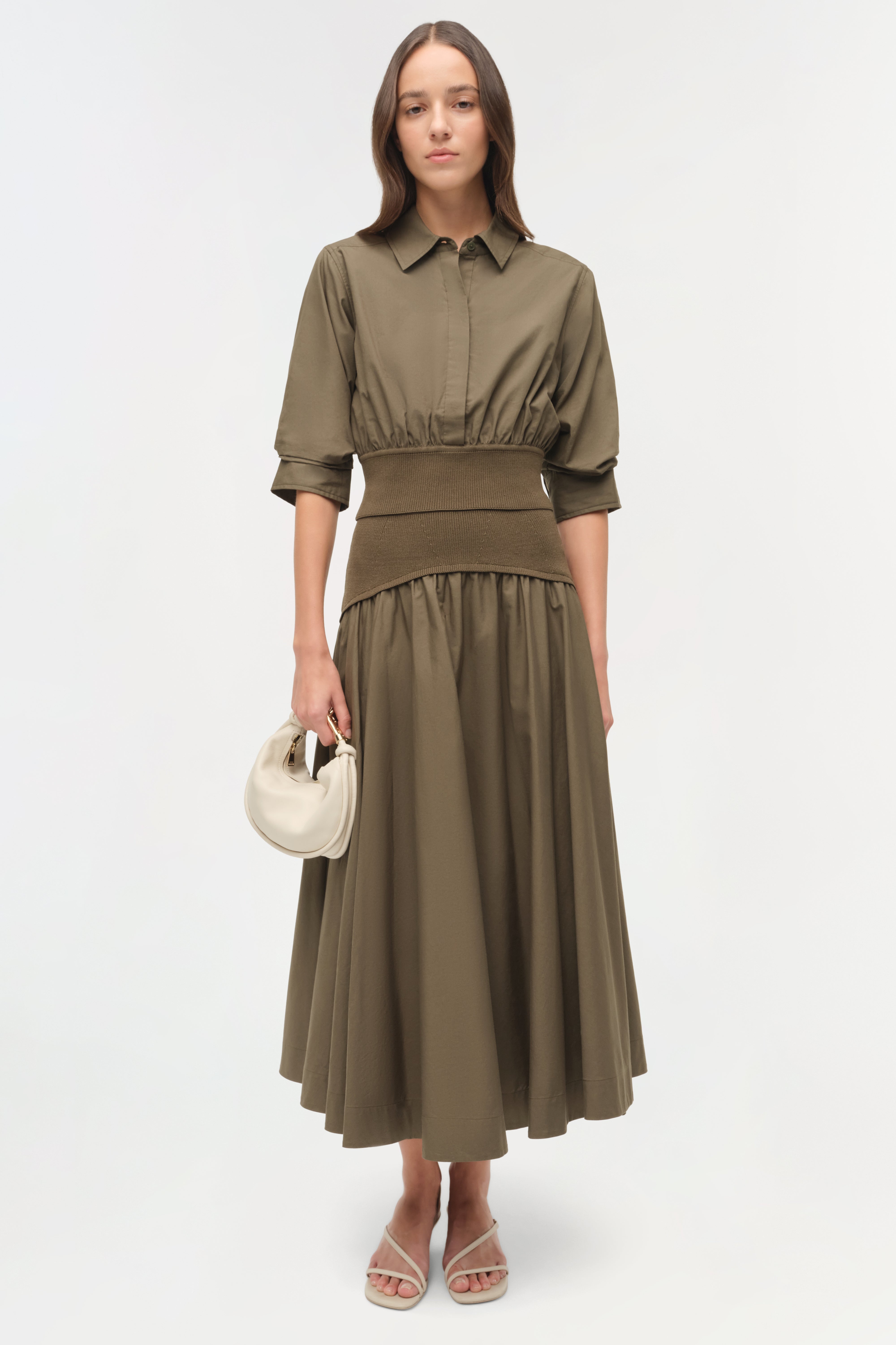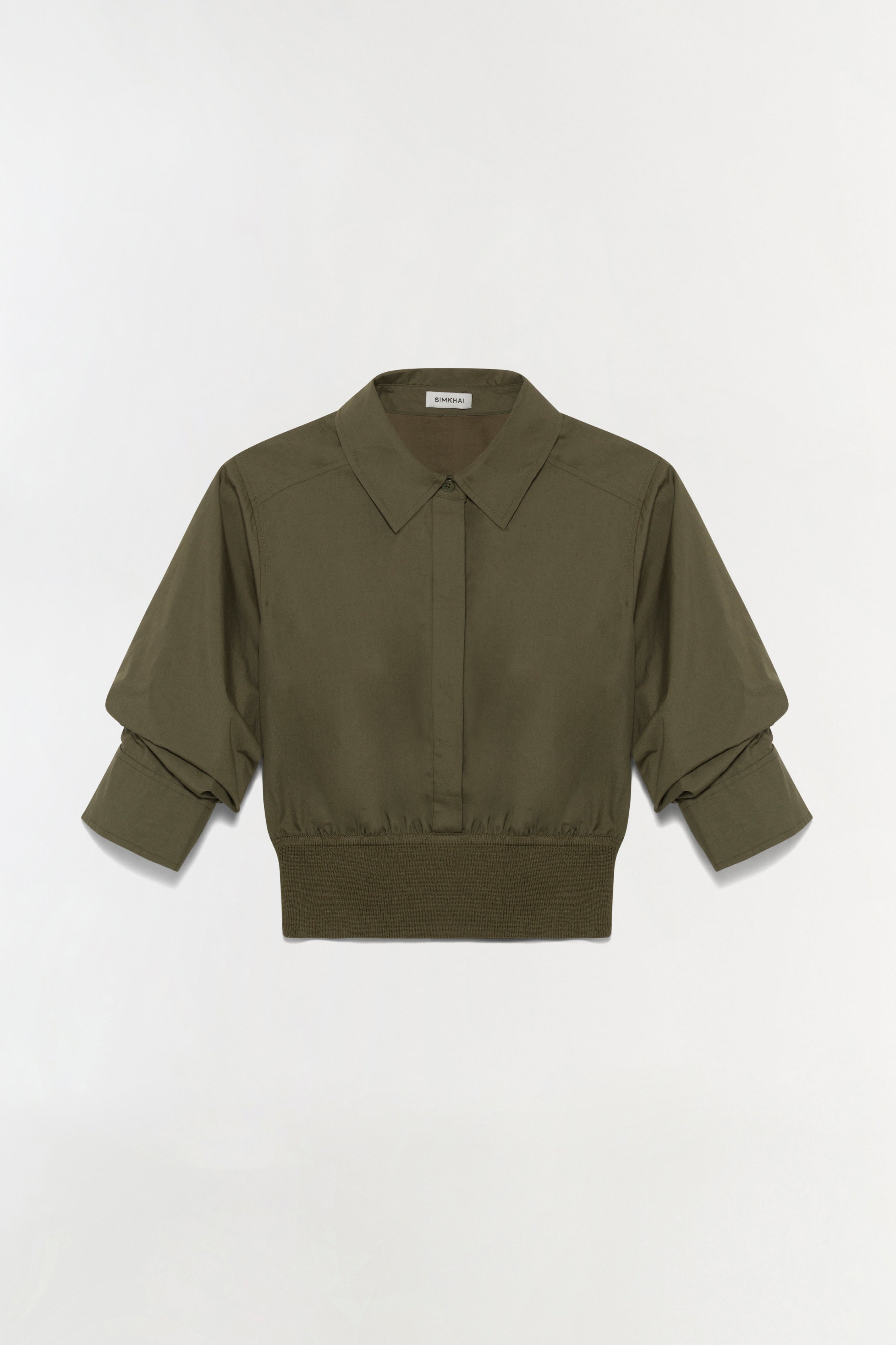 Made in smooth cotton poplin, this shirt top features a ribbed knit waistband that cinches the waist. The collared neckline and cropped proportion balance structure and ease. A modern take on classic shirting. Pair with the Ovie Knit Cotton Midi Skirt in Fern for a matching set.